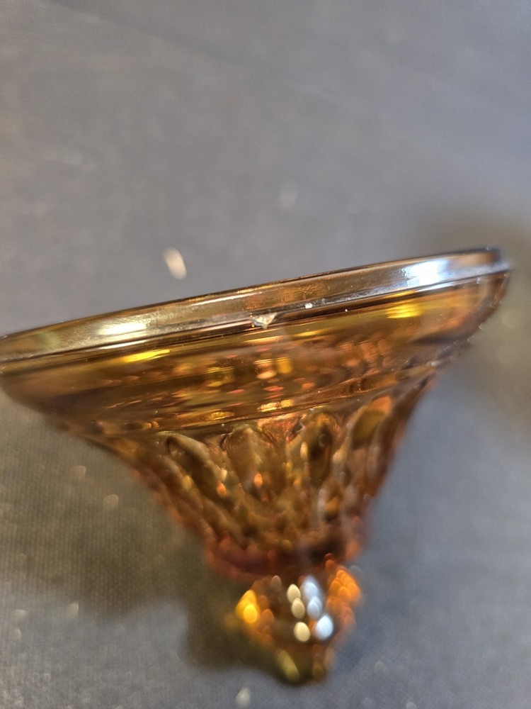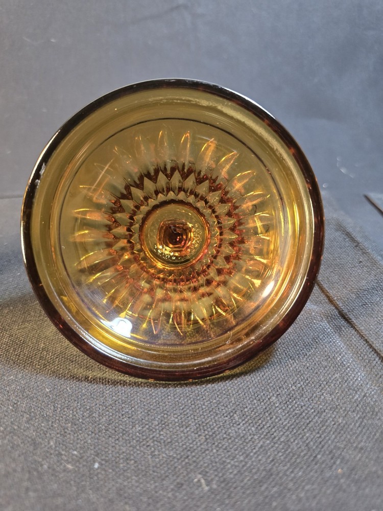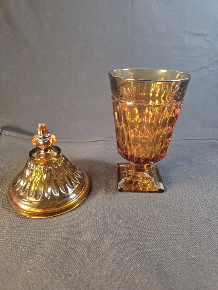 Vintage Indiana Glass amber lidded pedestal candy dish, approx. 9.75" tall. Rich fall-toned amber with diamond-textured pattern and square base. Ideal for seasonal décor or display. Condition: Small rim chip noted (photograph for buyer clarity); otherwise clean with expected vintage wear.
