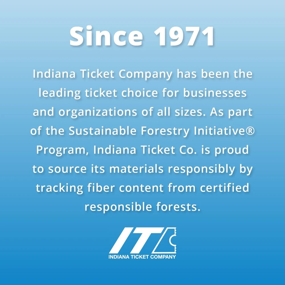 2, 000 tickets per roll, consecutively numbered each ticket is 2" Long and 1" Wide HIGH QUALITY TICKETS – Sell chances to win prizes or split the pot with Indiana Ticket Co. raffle tickets. Each roll contains 2,000 double stub raffle tickets for 50/50 raffles, giveaways, carnivals, drawings, door prizes, corporate events, trade shows and more. TEARS AWAY EASILY – The raffle tickets are carefully perforated so you can quickly tear them off without ripping the ticket. There is a place to write contact information on the back of the raffle ticket, including phone numbers and addresses. BRIGHT COLORS – Choose from a variety of our fun, bright colors to match your event’s theme. Each Indiana Ticket Co. roll includes 2,000 raffle tickets. The tickets are 2” x 2", separated into two 1” x 2" portions. CONSECUTIVELY NUMBERED - Each 2-part ticket contains double consecutive numbering from ###001. Rolls are designed for 1 portion to be submitted for a drawing and the second portion to be held by the participant for winner verification. MADE IN THE USA – Since 1971, Indiana Ticket Co. has been bringing exceptional quality tickets to events all over the country. Proud to be made and manufactured in the USA, the Indiana Ticket Co. name is printed on each ticket so you know you are getting authentic tickets.