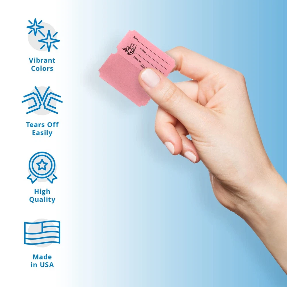 These tickets are great for any type of raffle where your keep a portion of the ticket and give the customer a portion of the ticket. Tickets are consecutively numbered so you can call the winner by the number only if needed. HIGH QUALITY TICKETS – Sell chances to win prizes or split the pot with Indiana Ticket Co. raffle tickets. Each roll contains 2,000 double stub raffle tickets for 50/50 raffles, giveaways, carnivals, drawings, door prizes, corporate events, trade shows and more. TEARS AWAY EASILY – The raffle tickets are carefully perforated so you can quickly tear them off without ripping the ticket. There is a place to write contact information on the back of the raffle ticket, including phone numbers and addresses. BRIGHT COLORS – Choose from a variety of our fun, bright colors to match your event’s theme. Each Indiana Ticket Co. roll includes 2,000 raffle tickets. The tickets are 2” x 2", separated into two 1” x 2" portions. CONSECUTIVELY NUMBERED - Each 2-part ticket contains double consecutive numbering from ###001. Rolls are designed for 1 portion to be submitted for a drawing and the second portion to be held by the participant for winner verification. MADE IN THE USA – Since 1971, Indiana Ticket Co. has been bringing exceptional quality tickets to events all over the country. Proud to be made and manufactured in the USA, the Indiana Ticket Co. name is printed on each ticket so you know you are getting authentic tickets.