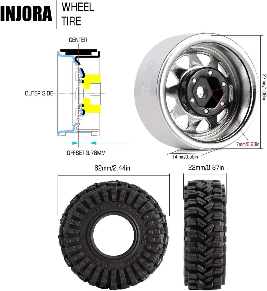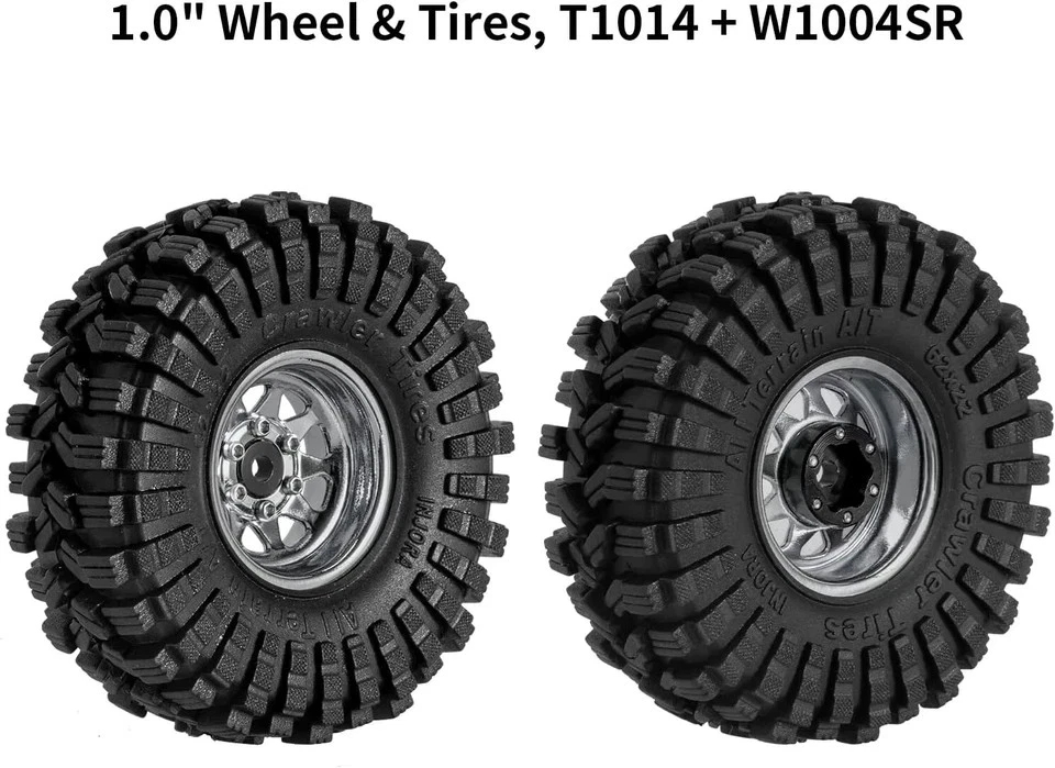 Product Description Upgrade your crawler’s performance with a wheel and tire combo built for extreme grip, stability, and durability. This 1.0” beadlock wheel & soft compound tire set features a -3.78mm negative offset, giving your RC rig wider stance and improved handling on uneven terrain — perfect for technical crawling. The high-quality stamped steel beadlock wheels deliver real weight and improved traction, while preventing tire slippage in high-torque situations. Paired with super soft, sticky rubber compound tires, you get unbelievable grip on rocks, wood, dirt, and trail surfaces. Designed specifically to fit popular 1/24 & 1/18 RC crawlers, this set is the ultimate upgrade for anyone who wants maximum crawling capability and a more aggressive stance. Push harder. Climb higher. Crawl like a pro. ⭐ Key Features & Performance Benefits Aggressive -3.78mm Offset Widens the stance for increased stability and improved sidehill control. Stamped Steel Construction Adds weighted realism + strengthens handling under steep climbs. Super Soft Sticky Compound S5 rubber grips tight to rocks, logs, and technical surfaces. True Beadlock Design No glue needed — prevents tire slip under high torque. Heavy-Duty Bias Ply Tires Flexible tread + tough construction for long-lasting performance. Perfect Fit for 1/24 & 1/18 Crawlers Works with SCX24, FCX24, TRX4M, AX24, and similar models. Scale Look, Competition-Level Performance Boosts capability without sacrificing appearance. 🔍 Suggested Item Specifics / Attributes Attribute Details Condition New Type 1.0” Beadlock Wheels & Tires Set Wheel Material Stamped Steel Tire Material S5 Super Soft Rubber Tire Size 62mm x 22mm Wheel Offset -3.78mm Compatible Scale 1/18, 1/24 Compatible Models Axial SCX24, AX24, TRX4M, FMS FCX24 & similar Quantity 4 Wheels + 4 Tires Features Beadlock, Soft Compound, Durable, High Grip, Negative Offset Color Grey (Wheels) For Vehicle Type RC Rock Crawler