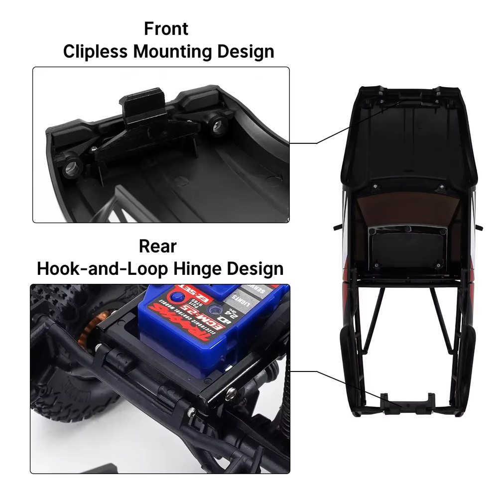 Love how this INJORA hard shell transforms my TRX4M Defender into a rugged pickup! The ABS body feels durable, and the bed rack adds a cool, functional touch. Swapping grilles is fun, and the rubber mirrors survive tumbles. The clipless front and rear hinge make access super easy—no fuss when changing batteries. Fits like a glove on stock rails or INJORA’s chassis. Perfect for modders who want style and convenience!