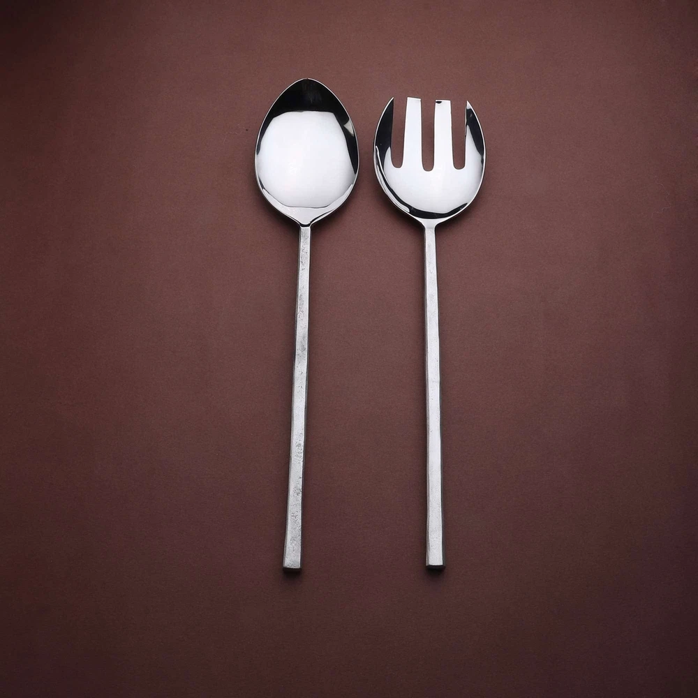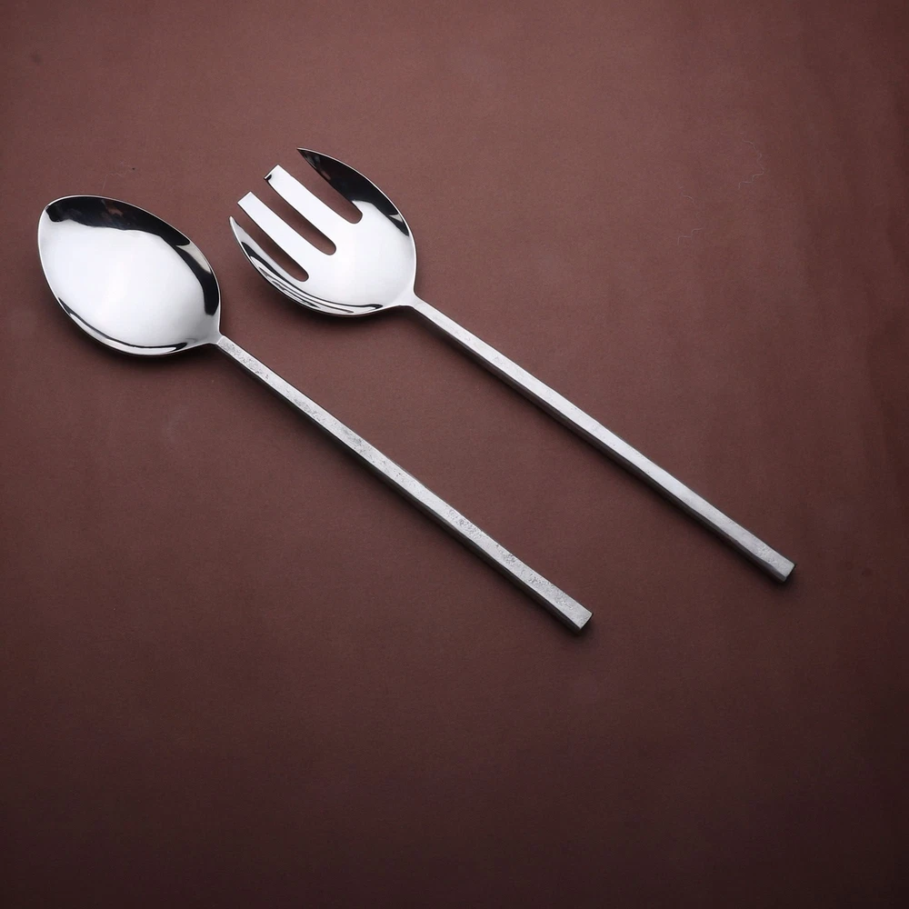 Inox artisans' hand-forged tableware with unique texture with a subtle, raw, and nascent handles, contrast with mirror-polished heads for a striking, contemporary tableware collection. Handle finishes on our design JASON are rustic and organic will vary, according to subtle differences in the handcrafted process and natural pitting. Best suited for perfect casual or elegant entertaining. Each simply-styled stainless piece has a smooth, substantial handle and beautiful mirror finish. These classically styled serving pieces are well-balanced and comfortable in hand.Dishwasher safe.Passed by International reputed labs for various food safe standards.Perfectly balanced and handcrafted for performance.Avoid lemon scented or corrosive detergents.Handmade and forged with high grade stainless Free Shipping Over $49.99* Details INOX Jason Salad Serving 2 Pc. Set Product Description: Inox artisans' hand-forged tableware with unique texture with a subtle, raw, and nascent handles, contrast with mirror-polished heads for a striking, contemporary tableware collection. Handle finishes on our design JASON are rustic and organic will vary, according to subtle differences in the handcrafted process and natural pitting. Best suited for perfect casual or elegant entertaining. Each simply-styled stainless piece has a smooth, substantial handle and beautiful mirror finish. These classically styled serving pieces are well-balanced and comfortable in hand. Dishwasher safe. Passed by International reputed labs for various food safe standards. Perfectly balanced and handcrafted for performance. Avoid lemon scented or corrosive detergents. Handmade and forged with high grade stainless steel. Ornamentation and design pattern is precisely rendered with depth and clarity on both sides. The handles are not so narrow that when held doesn't press uncomfortably into the palm. Fork tines are symmetrical, the edges are rounded, perfectly tapered, and polished on all sides. Spoon is deep enough to accommodate a good volume.