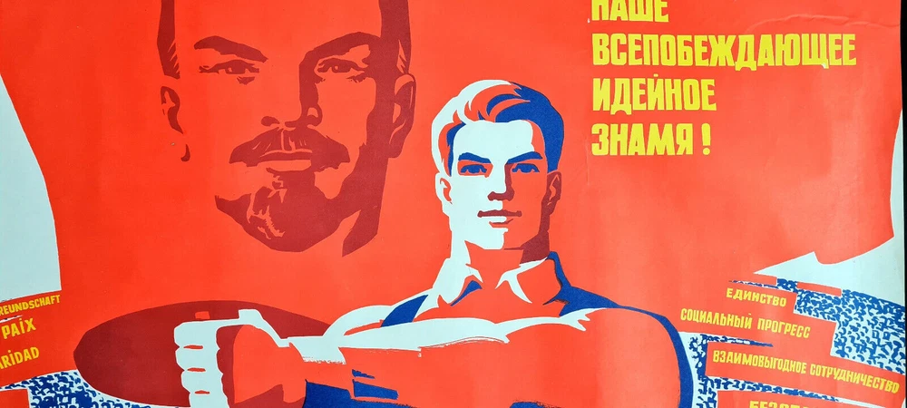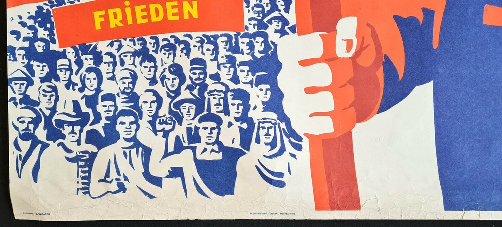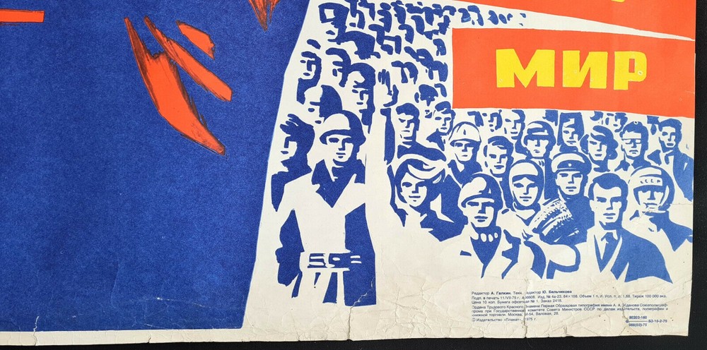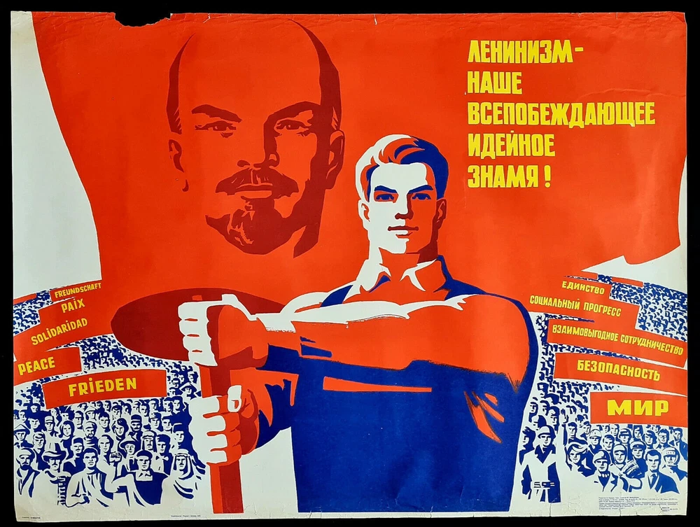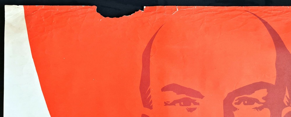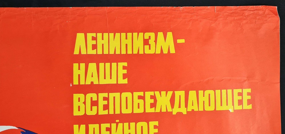 Original slogan on the poster says: ЛЕНИНИЗМ - НАШЕ ВСЕПОБЕЖДАЮЩЕЕ ИДЕЙНОЕ ЗНАМЯ! Literally English translation: LENINISM IS OUR OVER-VIEWING IDEAL BANNER! Some other slogans: MUTUALLY BENEFICIAL COOPERATION SOCIAL PROGRESS INDEPENDENCE SECURITY PEACE UNITY POSTER ARTIST: FILATOV D. PRINT YEAR: 1975 SUBJECT: INTERNATIONALISM, LENINISM LANGUAGE: RUSSIAN PRINT RUN: 100.000 PUBLISHED BY: "PLAKAT", MOSCOW SIZE: IN: 31 ⅛ x 41 ¾ = CM: 79 x 106 CONDITION: FLAT, NEAR TO GOOD Very large format impressive Soviet art poster. There is heavy wearing and creasing of lower edge border, at the upper right there is some paper missing, there was made light pre-restoration and the poster is in a good overall condition . Before your bid please consider the poster condition from attached pictures and text description, if you still need more information please feel free to require additional pictures or video, I would be my pleasure to assist you with any questions regarding this auction. Shipping rolled in a hard plastic tube.