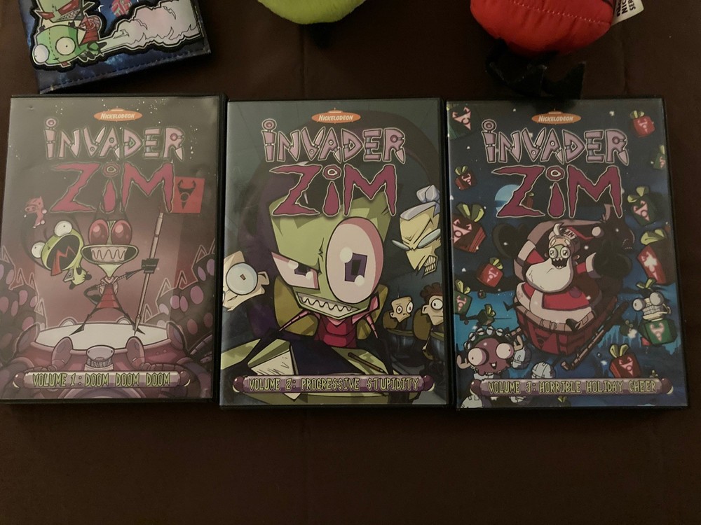 Invader Zim lot Nickelodeon Invader Zim plush - 10” Nickelodeon Gir plush - 6 inch DVD Set Volume 1 - Doom Doom Doom Volume 2 - Progressive Stupidity Volume 3 - Horrible Holiday Cheer Invader Zim bi fold wallet