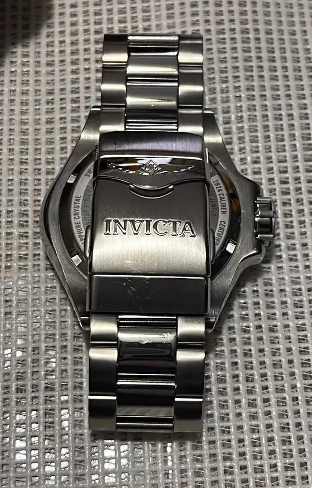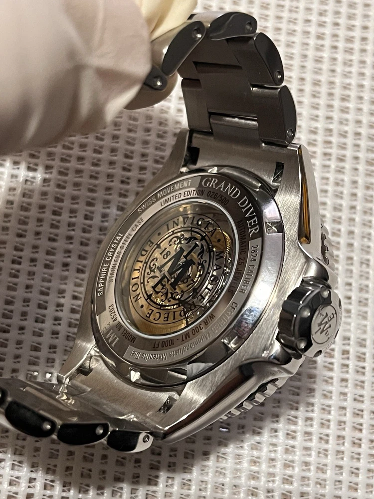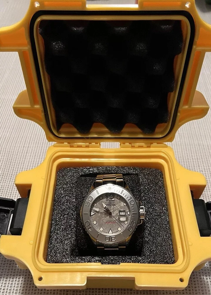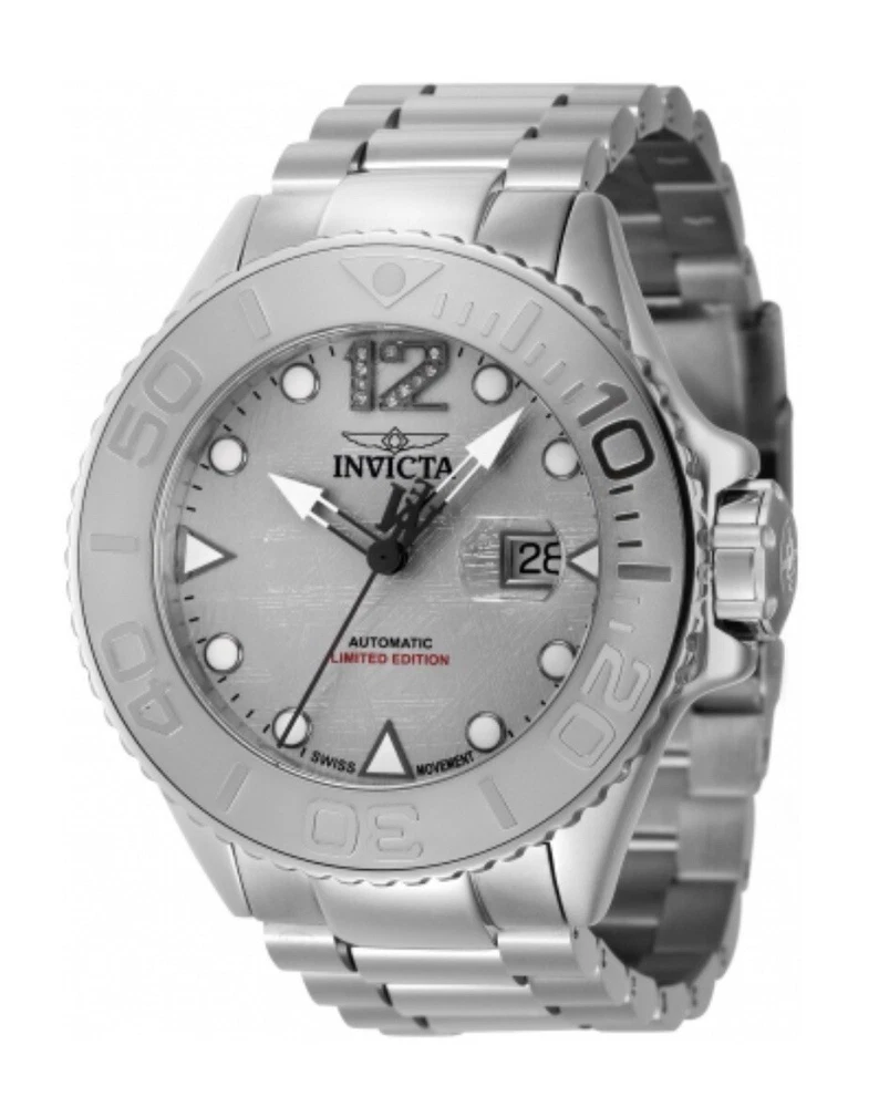 INVICTA MASTERPIECE GRAND DIVER 45203 METEORITE DIAL SWISS ETA AUTO LE 026/500 WATCH WAS USED A FEW TIMES WORKS AS SHOULD SIZED TO AROUND 8”INCH WRIST NO EXTRA LINKS ARE INCLUDED BUT IT FITS BIG YOU ARE GETTING EXACTLY WHAT YOU SEE IN THE PICTURES SO REFER TO THEM About the watch This incredible Invicta watch from the Masterpiece collection offers an exact Automatic movement, with an incredible 0.04 carats of authentic diamonds, and a sophisticated steel, silver case. The face displays a silver, meteorite, metal dial protected by our proprietary Sapphire Crystal. The design is completed by a steel, band. This timepiece can resist water for up to 300 m. Since its inception in La Chaux-de-Fonds, Switzerland in 1837, a commitment to excellence and innovation has been at the heart of every collection created by Invicta. Here at Invicta Stores, we offer the most extensive catalog of timepieces from this magnificent brand at the lowest price. HomeSales EventsSwiss Movement Sale - Up To 80% OFF! Invicta Masterpiece 0.04 Carat Diamond Swiss ETA 2824 Caliber Automatic Men's Watch w/ Meteorite Dial - 52mm, Steel (45203) Case & Dial Dial Color Silver Dial Material Meteorite, Metal Case Size 52 Case Tone Steel, Silver Case Material Aluminum, Steel Bezel Function Uni-directional Crown Type Screw Down Stone Type Diamond Luminous Color White Luminous Material New Lite Movement Movement Type Automatic Swiss Made Movement Components Swiss Movement Vendor ETA Movement Caliber 2824 Movement Jewels 25 Band Band Material Stainless Steel Band Length (mm) 210 Band Size (mm) 24 Buckle Type Fold over safety Interchangeable Band No Clasp Type Deployment, Safety