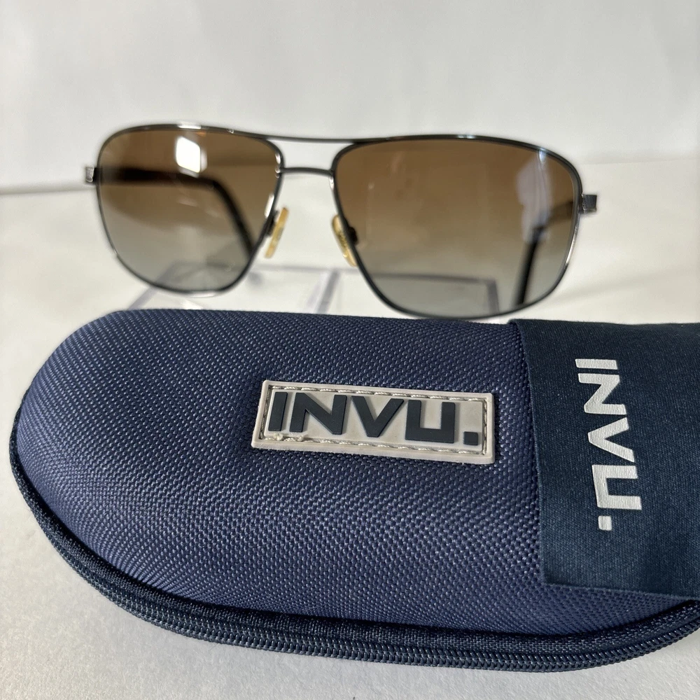 INVU Swiss Eyewear Sunglasses 133C2 Gunmetal Wrap Frame-FRAMES ONLY. Molded Case These preowned Sunglasses are in excellent condition. FRAMES ONLY. LENSES MUST BE REPLACED. Elevate your style with these INVU Swiss Eyewear sunglasses. The gray metal wrap frame, paired with brown gradient and polarized lenses, exudes designer elegance. These sunglasses are perfect for men who want to add a touch of sophistication to their accessory collection. The 133-C2 model features a molded case and is ideal for those who love to store their sunglasses in a stylish and protective way.