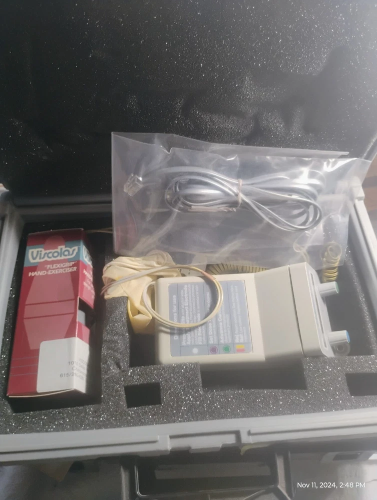 Complete IOMED Phoresor II PM700 Iontophoresis System designed for professional therapeutic use. This device facilitates medication delivery through iontophoresis, making it a valuable tool for physical therapists or healthcare providers. Includes: IOMED Phoresor II PM700 control unit. Carrying case with custom foam inserts for secure storage. Electrode cables and wires. Viscolas Flexigrip hand exerciser. Additional accessories as shown in photos. Condition: The unit is untested, sold as is. The carrying case shows some external wear, consistent with regular use (see photos). Accessories appear complete and in good condition. This system is ideal for professionals looking for a reliable iontophoresis device. Please review photos carefully and feel free to ask any questions before purchasing. Note: Consult the manufacturer or a professional to ensure proper use and compatibility with your clinical needs.