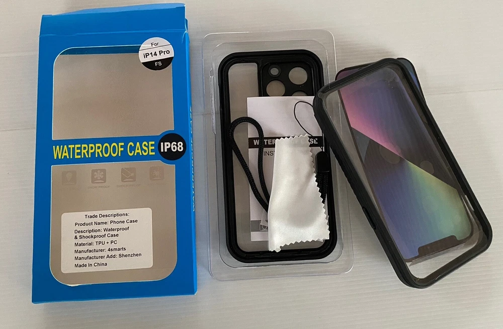 Safeguard your Apple iPhone 14 Pro with the 4Smarts IP68 Waterproof Dust/Shock Proof Case. This robust full body case offers 360 protection, shielding your device from dust, shocks, and water. Its dual-layer construction combines a soft silicone interior with a tough PC hard shell exterior, ensuring your phone remains secure and shielded from daily wear and tear. The case's transparent, hybrid design with a thin fit profile maintains the phone's sleek look while providing a rugged exterior for durability. It's fully functional with accessible controls and includes a lanyard for easy carrying. Whether you're out for a run or enjoying a day by the beach, this case ensures your iPhone is protected at all times. In unused condition. Pkease refer to pics for further details. Thank you for shopping at Funkee Munkee New & Rescued Treasures.