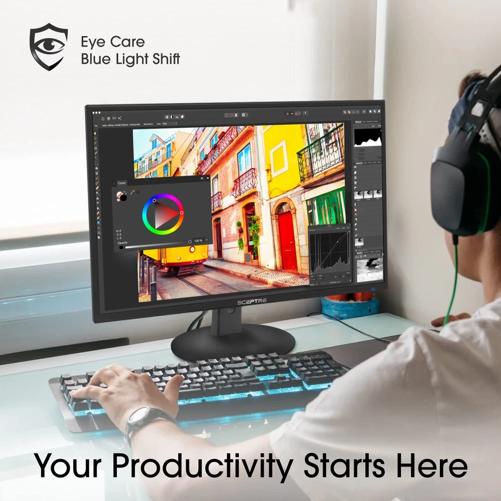 27" LED Monitor 1920 x 1080 Full HD Resolution IPS Panel Up to 75Hz Refresh Rate Fast Response Time Wide Viewing Angles Wide Viewing Angles: Wide viewing angles keep all the action sharply in sight from almost any viewing position while gaming on large monitors or dual-display setup. Fast Response Time: Playing fast action games and watching action adventure movies always require fast and accurate pixel response from an LED. With quick response times, ghosting and blurring are reduced so the user can enjoy the display with clarity and precision. Multiple Ports: Two HDMI ports and one VGA port provide up to 75HZ refresh rate, refining picture clarity in all action-packed gaming sequences and graphic design projects. Audio In and a Headphone Jack provide diverse audio options. Edgeless Design: Edgeless Design completely immerses you in all the captivating action and wondrous scenery that 1080P resolution and 75Hz refresh rate have to offer. 99% sRGB Color Gamut: With 99% sRGB, our display reveals an astonishing brightness and variance in red, green, and blue color across a wide gamut, providing a more defined and naturalistic display of color in every image. Blue Light Shift: Reduce your monitors blue light to protect you from eye fatigue, irritation and strains. This enables you to work on your documents, watch movies, or play games more comfortably for extended periods. Anti-Flicker: Provides a crisper picture by preventing the backlight from flickering periodically.