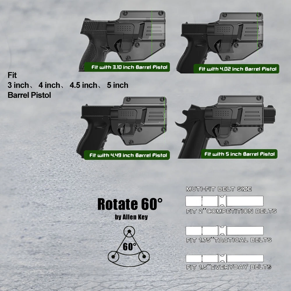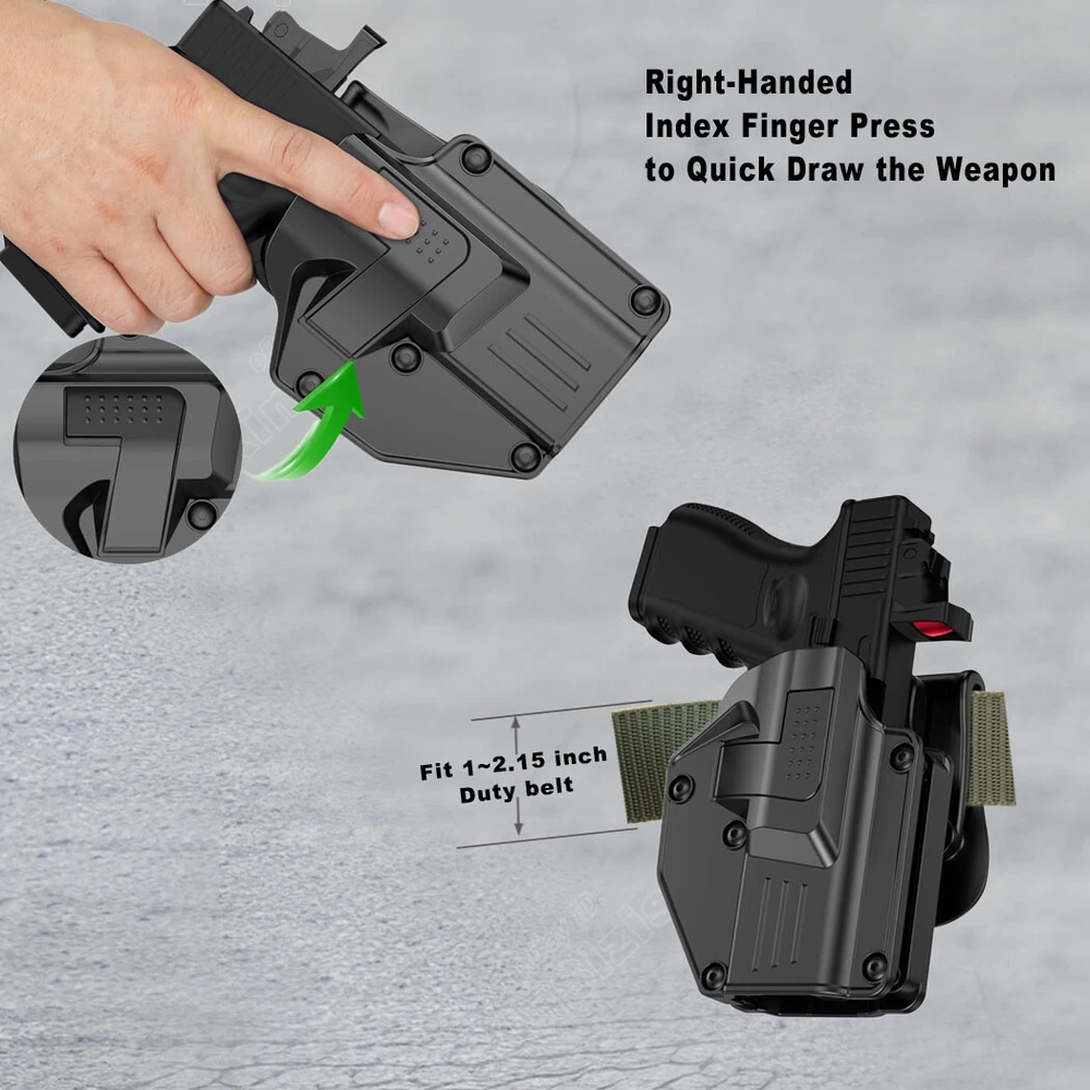 Mega-fit Holster / Versatile Holster / Universal Holster, Fits Most Popular Full Size and Compact Pistols, Fits Pistols with Red Dot, Fits Pistols with High Front Sight I tem D escription : Holster for SCCY SCCY CPX-1 9mm Luger SCCY CPX-1 RD 9mm Luger SCCY CPX-2 9mm Luger SCCY CPX-2 RD 9mm Luger SCCY CPX-2 Gen3 9mm Luger SCCY CPX-2 RD Gen3 9mm Luger SCCY DVG-1 9mm Luger SCCY DVG-1 RD 9mm Luger Attention: While you have the holster, please follow these three steps to adjust its retention for a customized fit, as shown in the listing picture. Proper adjustment ensures your weapon is secure. Without it, the holster may not fit any firearm correctly. 1) After adjust the retention , Weapon Compatibility - Outside Waistband Tactical H olster Fit Holster perfect work with suppressor sights, and fit all the capacity 9mm,10mm, .40 cal, .45 cal a n d 22LR for the gun. Compatible-Beretta Fits Beretta 92, 92X Centurion, 92S Full Size . 92G ELITE LTT , 92A1, 92FS, PX4, PX4 STORM, APX, M9A1, M9A3 without laser, APX Centurion 9mm, APX Compact 9mm , APX A1, APX A1 compact , M9A1 Compatible-Bersa Fits Bersa Thunder 9 Pro XT Compatible-BRG Fits BRG USA BRG9 Elite 9mm Compatible-Browning Fits Hi-Power, Hi-Power 640, Hi-Power 3D, Browning Mark III Compatible-Canik Fits TP9 Elite Combat, TP9 SFX, TP9 SF,TP9 Elite-S, TP9SA Compatible-Caracal Fits Caracal EF, Caracal F, Caracal F Gen II Compatible-Colt Fits Colt 1911-3'', 1911-4'', 1911-5'', M1911 A1, M1911, Colt 1911 .45, Colt 1911 9mm Compatible-CYMA Fits CYMA CM127 Compatible-CZ Fits CZ P07, P09, 75 SP-01 Shadow, Shadow 2, P-10C, P-10 F, 75, 75B, 85 Compatible-FN Fits FNX-45, FN-509 Compatible-Girsan Fits Girsan MC28, Regard MC 9mm, MC28 SA 9mm, MC 14T, MC P35 PI LW, MC28 SA, Regard MC, 1911 MC Compatible-Glock Fits Glock 17 Gen(1,2, 3, 4, 5), Glock 19 Gen(1,2, 3, 4, 5), Glock 19X, Glock 21, 22 Gen(1,2, 3, 4, 5), 23 Gen(1,2, 3, 4, 5), 24, 26, 27, 30, 31, 32, 33, 34, 35, 36, 41, 42, 43, 43X, 43X, MOS, 44, 45, 47, 47 mos, 48. Compatible-Heckler & Koch Fits H&K USP and H&K USP Compact, SFP9,VP9 Compatible-Hi-Point Fits Hi-Point C9 Compatible-HS Fits HS-9 Compatible-ISSC Fits M22 Gen2 Compatible-IWI Fits Masada 9mm, Jericho 941 9mm Compatible-Jericho Fits Jericho 941 RS Compatible-Kahr Fits CW45 Compatible-Norinco Fits Norinco NP22 Compatible- Palmetto State Armory Fits PSA Dagger Compact 9mm, PSA Dagger Full Size S 9mm, PSA Dagger Full Size SX 9mm, PSA Dagger Micro 9mm, PSA 5.7 Rock Compatible-Para ordnance Fits Para ordnance P12-45 Compatible-PREXER Fits Wist 94 Compatible-Radom Fits VIS 100 Compatible-Rock Island Armory Fits Baby Rock 380, BBR 3.10 45ACP, BBR Standard 380ACP, M200, M206, 1911 , SA 1911 Compatible-Ruger Fits Ruger MAX-9, Security-9, Security 9 Compact/ Pro/ Standard , Security 380, Ruger-5.7, Ruger American, SR1911, SR22, RSR9, SR9C, SR40, SR45, PRESCOTT 57, LC9 , Compatible- SCCY Fits CPX-1 (Gen 1 2 3), CPX-2 (Gen 1 2 3) , CPX-3 (Gen 1 2 3) , DVG-1, CPX-1RD / CPX-2RD Compatible- Sarsilmaz Fits AR-24 , AR-24K, B6, B6C, B6C7.65, B6C-LR, B6C-S, CM9, K-12 Sport, K-12 Sport X, K11, K2 45, K2 45C, Kilinc 2000 Light, Kilinc 2000 Mega, P8 L, P8S, SAR 9, SAR 9 C, SAR 9 METE Compatible-Shadow Systems Fits CR920 Elite, DR920, DR920 FS, DR920P, MR920 Compatible-Sig Sauer Fits Sig Sauer P365, P365 BB , P365X / XL/ SAS/ X Macro, P220, P225, P226, P228, P238, Sig Pro 2022 (Germany or USA version), SP2022 SAR, P938, P320, P229, P250, P320 Compact, P320 with Lima Laser Compatible-Smith & Wesson Fits Smith & Wesson M&P 9MM, M&P M2.0 9MM, M&P 40, M&P 45 ACP, M&P 40, M&P .40 C, M&P .45, M&P 9 M2.0, M&P Shield 9mm, 40, 45, M&P Compact 9, 40, SW9, SW9V, SD9 VE, SD40 VE, SD40, M&P 40 M2.0, 380 SHIELD EZ , 9 SHIELD EZ , M&P9, 9 SHIELD ,CSX, S&W 1911 Compatible-Springfield Fits Springfield XD-9, XD-40, XD-45, XD-S, XD-S .45 ACP, XDM-9, XDM-40, XDM-45 ACP, XDE-9, HELLCAT, HELLCAT PRO, Hellcat OSP / RDP 9mm , XDS-45, XDS-9, XDM , XDM elite 10mm , 1911 SA , 1911 Compatible-Steyr Fits Steyr Arms C9-A1, Arms C9-A2, Arms C9-A2 MF Compatible-Stoeger Fits STR-9 Compatible-Tara Fits TM9 Compatible-Taurus Fits Taurus Millennium, Taurus 100, Taurus 92, PT111 G2, G2C, G3, PT24/7, GX4, PT111, PT132, PT138, PT140, PT145, PT745, PT938, T800 series and Pro version, PT809, PT709, PT24/7, PT24/7-OSS, PT809C, PT840C, G3, TH9, Taurus 1911, Taurus PT 92 AF, TX22 compact, TX22 22LR Compatible- Tisas Zigana Fits PX-9, Tisas zig m1911 duty .45, Tisas M1911 .45 Compatible-Walther Fits Walther P99 QA, PPQ(M1 M2 M3), P88 9mm, PPQ Compatible-Zastava Fits EZ9, EZ40 ( Without embedded chassis, and no flashlight style ) 2) Holster with paddle - Push side buttons to achieve the fast opening and closing, unique design allows for belt carrying or vest carrying, perfectly used by duty holsters, uniformed law enforcement officers, security personnel, military personnel, private persons, and shooting sports holsters. And it fits closer to the body which can achieve better concealment under clothes. 3) Secure Level II Retention - Auto-locking system restrain pistol in OWB holster to ensure ultimate safety, activate the release by pressing the button with the index finger to achieve gun access . 4) Adjustable Carry Angle - Easily set Holster 360 degrees to your desire position with Allen key, compatible belt width up to 2 inches . 5) Tough, Durable Material - Custom-molded body made of polymer stronger than leather that will wear out, adapt to every bad environment Shipping: Ships same day or next except Sundays and Holidays ! Free shipping! Ship by USPS First Class Package. 100% MONEY BACK GUARANTEE . If it doesn't fit your pistol or you are not 100% satisfied just send it back for a full refund or exchange. We will even pay return shipping. A ny question please be free to contact with us .Thanks!