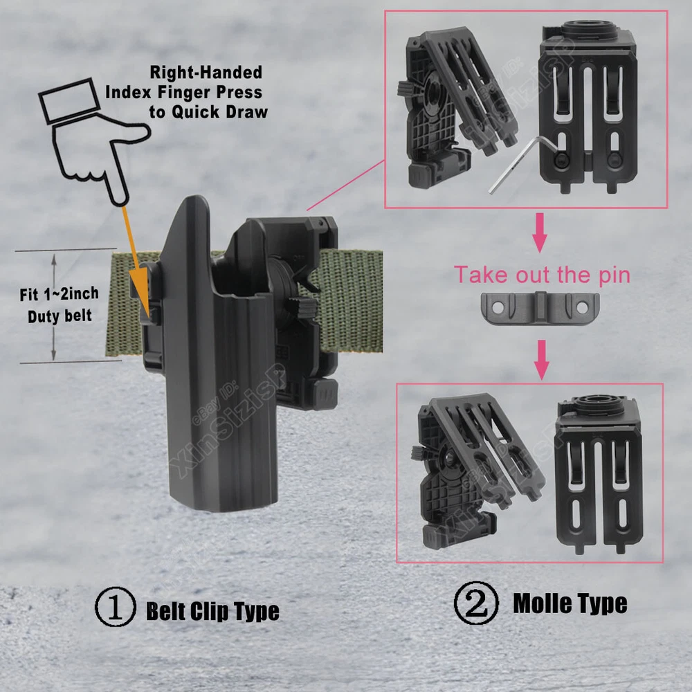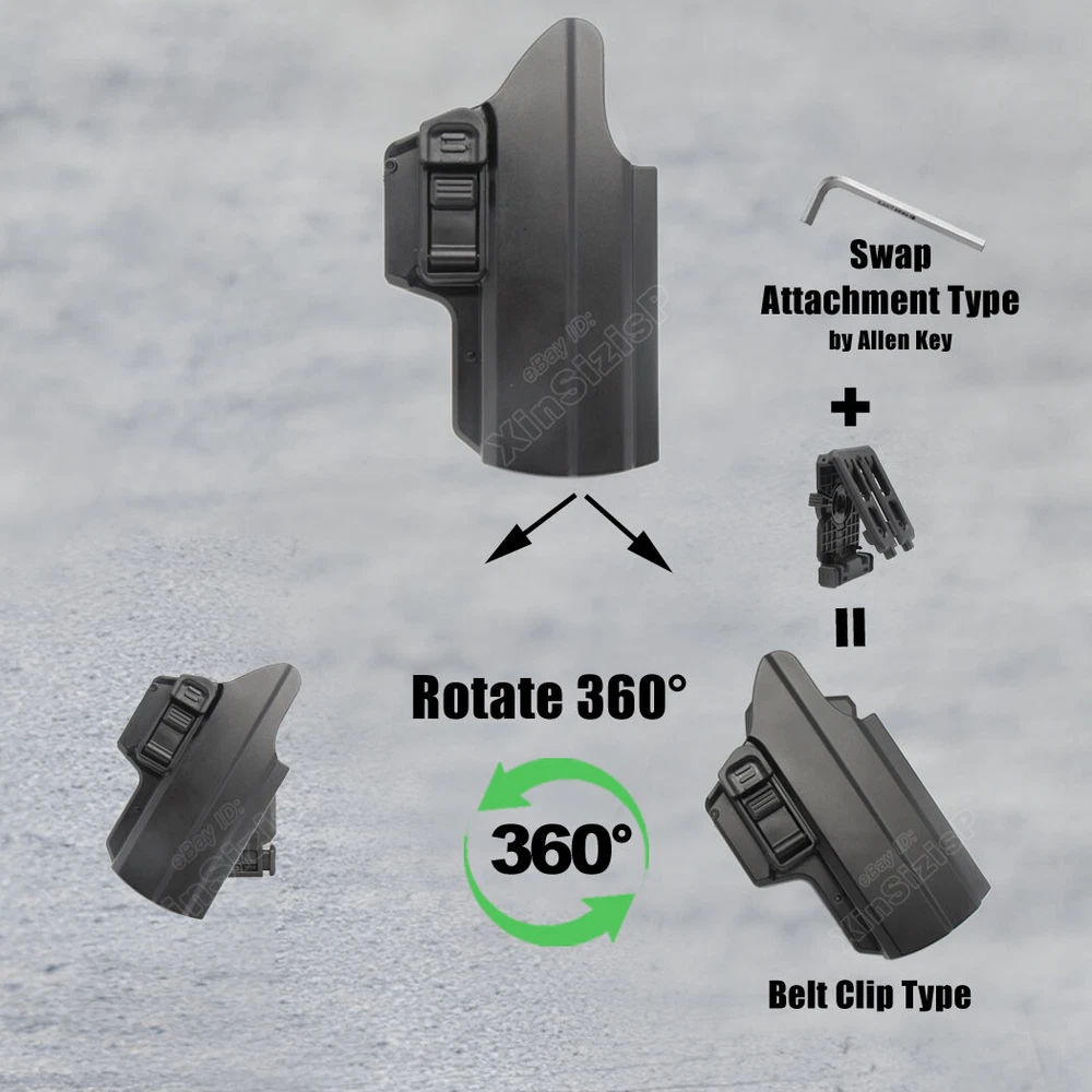 High Quality Military & Police Grade Polymer OWB Holster Specially Designed For Fast Draw During Duty Or Shooting Competition. Outside Waistband Tactical Holster This holster fits 9mm, 10mm, and .40 caliber firearms but is not compatible with .45 caliber models. Holster Fit Glock 19 (Gen 1-5) Glock 19X Glock 17 (Gen 1-5) Glock 21 (Gen 1-5) Glock 26 (Gen 1-5) Glock 27 (Gen 1-5) Glock 31 (Gen 1-5) Glock 32 (Gen 1-5) Glock 33 (Gen 1-5) Glock 45 (Gen 1-5) Glock 22 (Gen 1-4) Glock 23 (Gen 1-4) Holster Fit Smith & Wesson M&P 9 M2.0 4.25" 9mm Luger Smith & Wesson M&P 10mm M2.0 4" 10mm Auto Smith & Wesson M&P 10mm M2.0 4.6" 10mm Auto Smith & Wesson M&P 40 M2.0 3.6" Subcompact .40 S&W Smith & Wesson M&P 9 M2.0 3.6" Compact 9mm Luger Smith & Wesson M&P 9 M2.0 3.6" Subcompact 9mm Luger Smith & Wesson M&P 9 M2.0 4.0" Compact 9mm Luger Smith & Wesson M&P 9 M2.0 5" 9mm Luger Holster Fit Walther P99 AS 9mm Luger Walther P99c 9mm Luger/.40 S&W Walther PPQ 9mm Luger Holster Fit Springfield XD 9, XD 40, 5" 9mm Luger/.40 S&W Springfield XD 9, XD 40, Full Size 4" 9mm Luger/.40 S&W Springfield XD MOD.2 4" Service 9mm Luger Springfield XD MOD.2 Subcompact 3.3" 9mm Luger Springfield XD Subcompact 3" 9mm Luger/.40 S&W Springfield XD-M 4.5" 10mm Auto Springfield XD-M 5.25" Competition 10mm Auto Springfield XD-M Elite 3.8" 9mm Luger Springfield XD-M Elite 4.5" 9mm Luger Springfield XD-S MOD.2 .40 S&W Holster Fit Beretta APX 9mm Luger/.40 S&W Beretta APX Compact 9mm Luger/.40 S&W Beretta APX Centurion 9mm Luger/.40 S&W Beretta APX Centurion Combat 9mm Luger Note: Not compatible with Beretta APX A1 Carry and Beretta APX Carry 3.5". Holster Fit Tisas Zigana PX-9 9mm Holster FitBRG9 Elite 9mm Holster Fit Sig Sauer P320 (9mm/.40) series all models Sig Sauer P220 (9mm/.40) series all models Sig Sauer P229 (9mm/.40) series all models Sig Sauer SP2022 (9mm/.40) series all models Sig Sauer P226 (9mm/.40) series all models Sig Sauer P228 (9mm/.40) series all models Holster Fit CZ P-07 9mm Luger CZ P-09 9mm Luger CZ P-10 C 9mm Luger CZ P-10 F 9mm Luger CZ P-10 M 9mm Luger CZ P-10 S 9mm Luger CZ P-10 SC 9mm Luger Holster Fit Sarsilmaz SAR 9 Sarsilmaz SAR 9X Sarsilmaz SAR 9 Compact Sarsilmaz SAR 9 SP Sarsilmaz SAR 9 Sport Sarsilmaz SAR 40 Sarsilmaz SAR K2P Sarsilmaz SAR B6 Sarsilmaz SAR B6C Sarsilmaz SAR B6C 7.65 Sarsilmaz SAR B6C-LR Sarsilmaz SAR B6C-S Sarsilmaz SAR CM9 Sarsilmaz SAR ST9 Sarsilmaz SAR 2000 Sarsilmaz K12 Sport Sarsilmaz K12 Sport X Sarsilmaz K11 Sarsilmaz AR-24 Sarsilmaz AR-24K Sarsilmaz Kilinc 2000 Light Sarsilmaz Kilinc 2000 Mega Sarsilmaz P8 L Sarsilmaz P8S Ease and Comfort Push side buttons to achieve the fast opening and closing, unique design allows for belt carrying or vest carrying, perfectly used by duty holsters, uniformed law enforcement officers, security personnel, military personnel, private persons, and shooting sports holsters. And it fits closer to the body which can achieve better concealment under clothes. High S afety Secure Level II Retention - Locking system restrain pistol in the holster to ensure ultimate safety, activate the release by pressing the button with the index finger to achieve gun access . A djustable Easily set Holster 360 degrees to your desire position with Allen key, compatible belt width up to 2 inch . Tough & Durable Material Custom-molded body made of polymer stronger than leather that will wear out, adapt to every bad environment In the Package: · 1*Holster with Belt Clip Attachment · 1*Allen Key Shipping: Ships same day or next except Sundays and Holidays ! Free shipping! Ship by USPS First Class Package. 100% MONEY BACK GUARANTEE. Any question please be free to contact with us .Thanks!