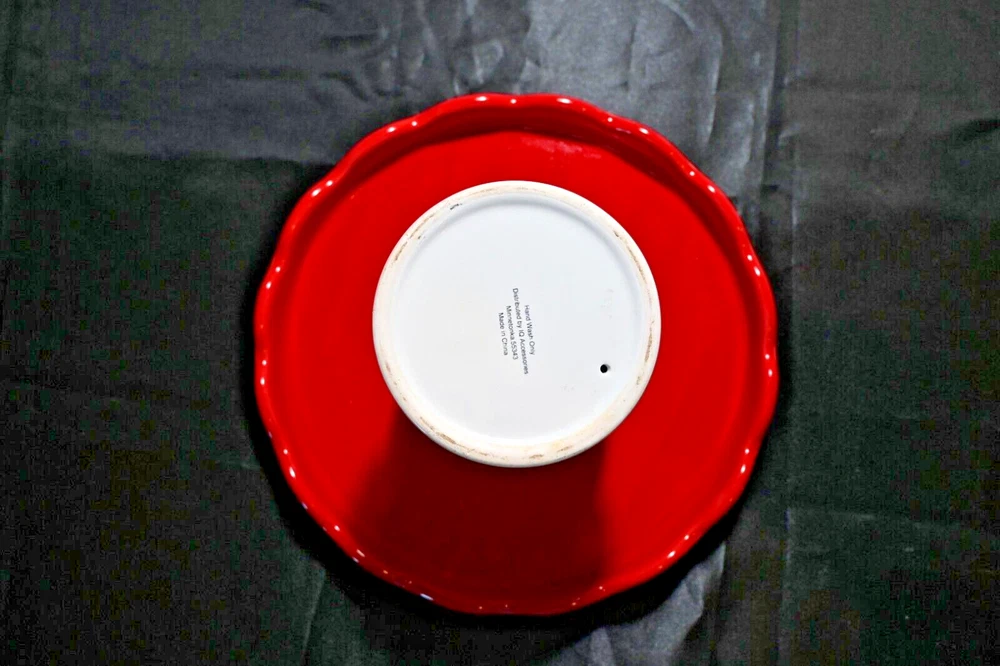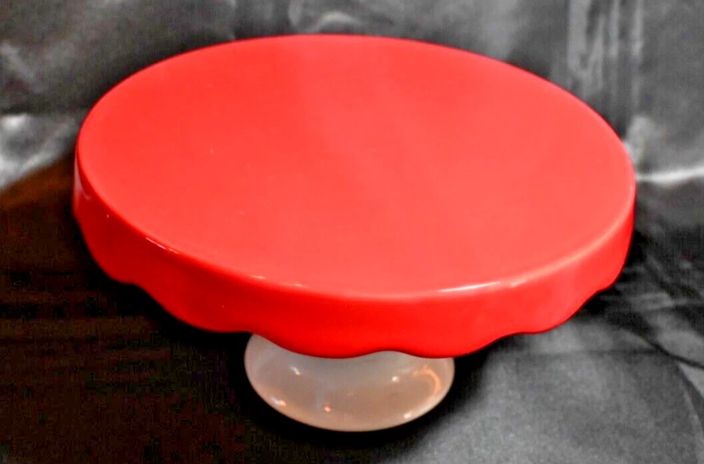 This vintage IQ Accessories pedestal cake stand has a red top with scalloped edge and a white base. Great to have on your kitchen counter with muffins, cake and cookies for display. This ceramic cake stand is hand wash only and is in very good condition. The stand measures approximately 4 3/4" tall, 9 1/8" diameter across top, and 3 7/8" across the base. #MB2680