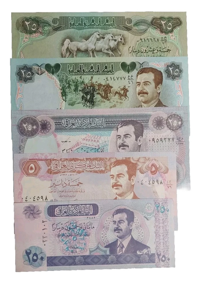 IRAQ Saddam Era 5 Pcs IRAQI 5 25 250 DINARS UNC BANKNOTES 1982 1986 1995 2002