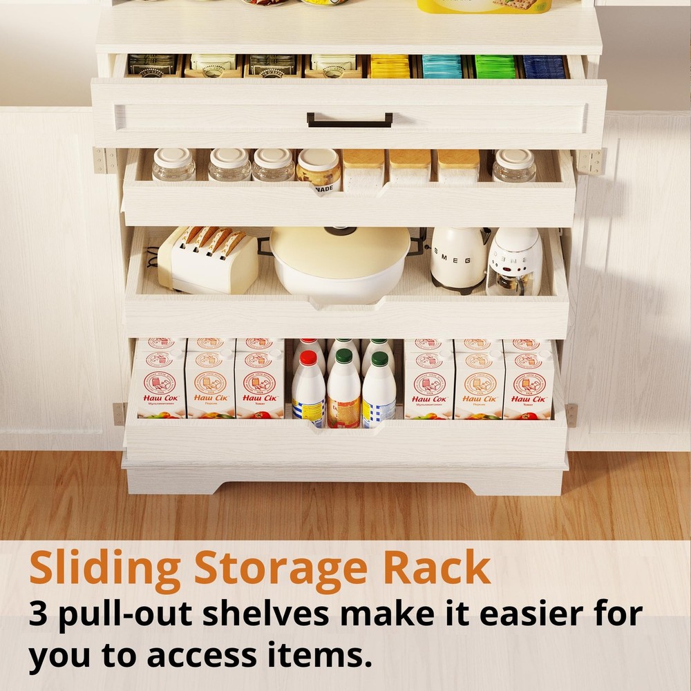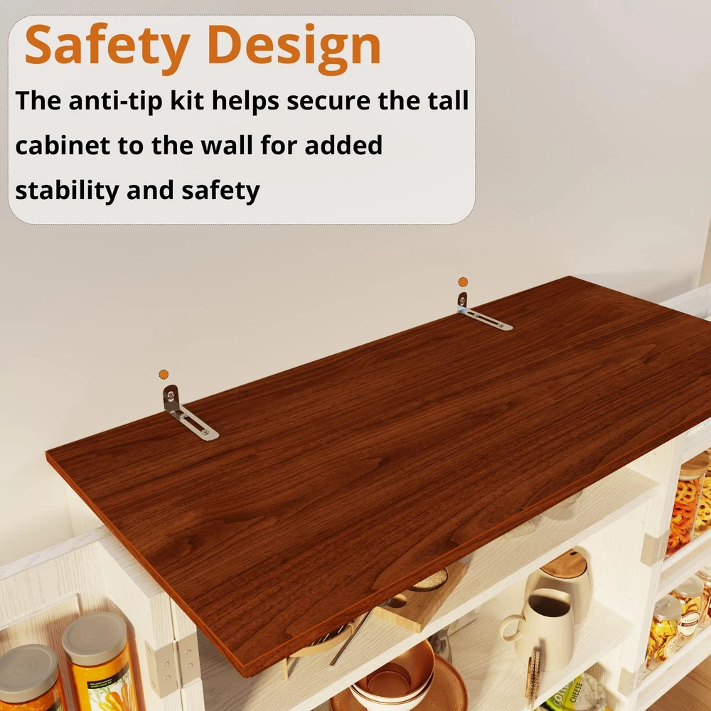 Versatile Pantry: This farmhouse kitchen pantry is versatile and suitable for most rooms in the home. Clean lines and smooth surfaces allow the cabinet to match any furniture style. Door Storage Racks: The cabinet comes with 6 door racks, which can be designed with customized space for small kitchen items such as spice jars, canned goods, and olives to maximize the use of cabinet space. Sliding Storage Racks: The cabinet comes with 3 sliding racks, which can be used flexibly for various items. Large-capacity kitchen cabinets can keep your kitchen clean and tidy. No matter where you put it, you can organize it. Sturdy and Durable: Made of high-quality medium-density fiberboard, ensuring strength and durability. The included anti-tip kit helps to secure the cabinet to the wall, ensuring the safety of you and your family. Easy to Assemble: All hardware and clear assembly instructions are included in the package, and professional installation guidance is also provided, so there is no need to worry about assembly.