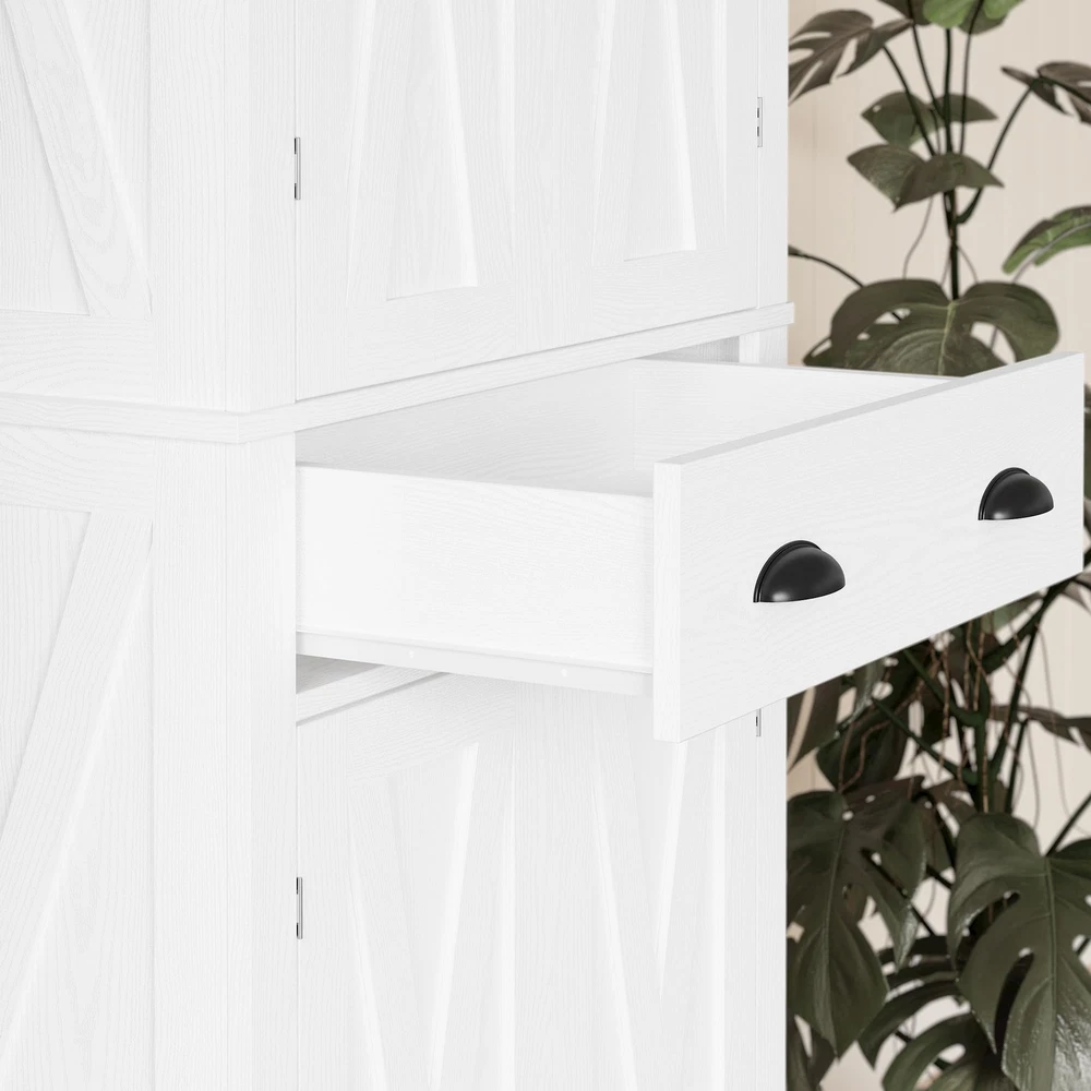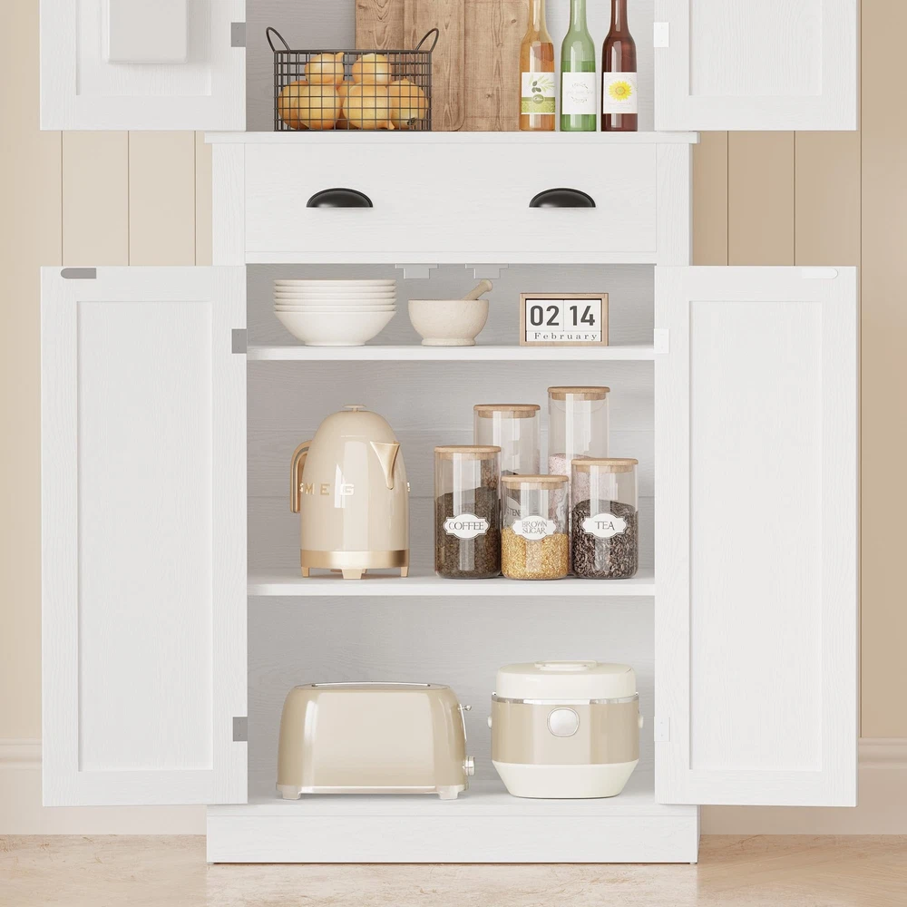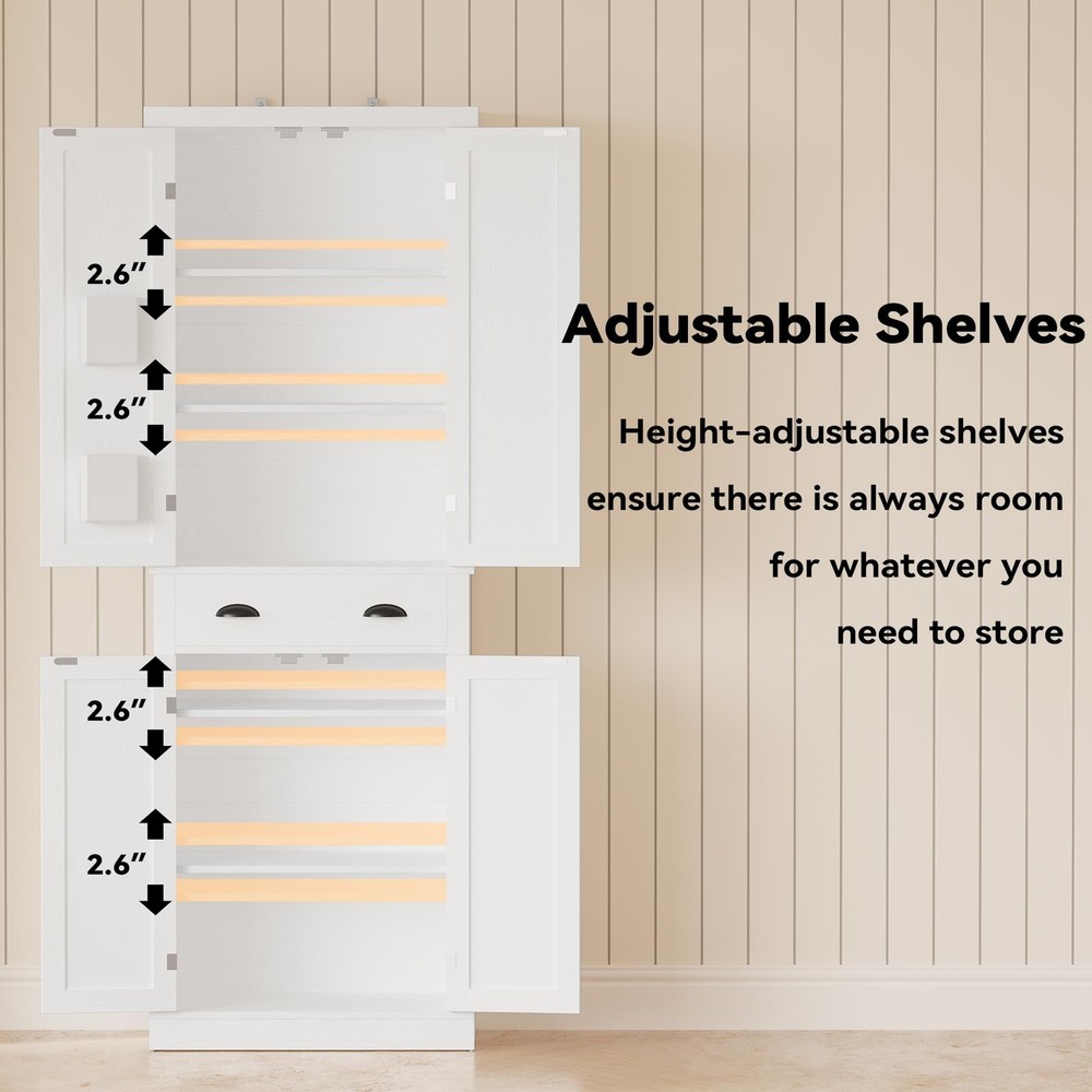 Built to Last: Made from durable MDF, this pantry cabinet includes wall-mounting for stability, ensuring it can handle daily use while keeping your kitchen tidy for years to come Customizable Storage: This 72.6-inch height pantry features three adjustable shelves and a fixed one, plus a drawer for small items, offering flexible storage to keep your kitchen organized and clutter-free Compact and Efficient: The 24-inch width makes this pantry cabinet perfect for small spaces. It fits neatly into corners or against walls, adding storage without taking up too much space Multi-Purpose Use: Versatile for any kitchen size, this storage pantries serves as a secondary storage unit or a standalone organizer, boosting both functionality and aesthetic appearance Simple Setup: With a clear manual, assembly is a piece of cake. Even first-time assemblers can easily set up this pantry, making the process quick and stress-free