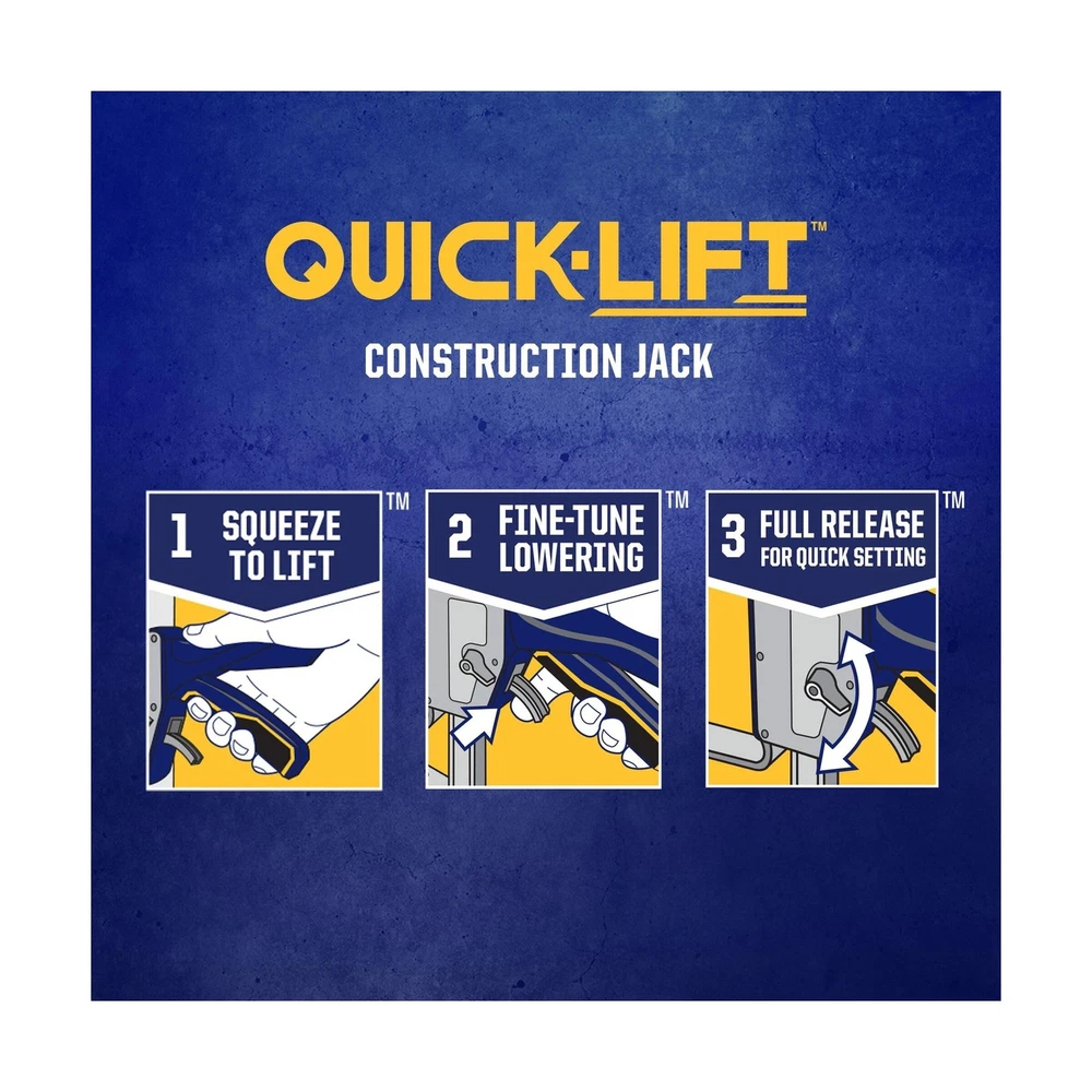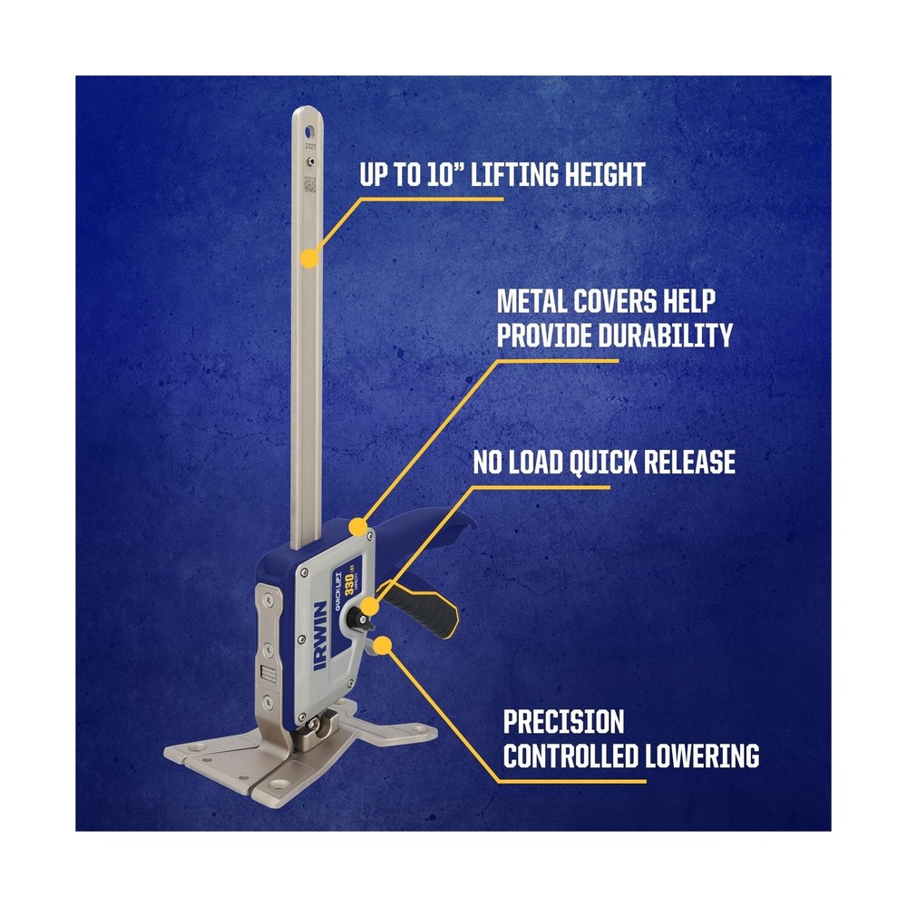 IRWIN Quick-Lift Construction Jack, Hand Lifting Jack Tool, Multifunctional, Lift up to 10" and Lift Capacity 330 lbs (IRHT83100) Description The IRWIN QUICK-LIFT construction JACK aids in a variety of lifting, leveling, holding, or installing applications. Trades professionals - builders, remodelers, cabinet installers, framers, MROs, HVAC techs - and even homeowners and DIYers benefit from the QUICK-LIFT construction JACK. Use to install cabinets, windows, doors, flooring, HVAC equipment, framing / decking, and home appliances. Lifting up to 330 lbs. And 10", this tool has a wide variety of uses within the commercial and residential space. Features: Lifts up to 10" Lifting capacity up to 330 lb Precision controlled lowering - for fine tune adjustments and levelling No load quick release - for easy and quick setting Comfort Grip - designed to be ergonomic Countersunk holes - for flush mounting Slim tapered base - provides easy access under applications Product Details: Vehicle Service Type: compatible_with_vehicle_type Material: Alloy Steel Load Capacity: 330 Pounds Maximum Lifting Height: 10 Inches Brand: IRWIN Load Capacity: 330 Pounds Maximum Lifting Height: 10 Inches Brand: IRWIN Color: No Color Item dimensions L x W x H: 5.3 x 11.4 x 18.45 inches Style: Single Quick-Lift OEM Part Number: IRHT83100 Automotive Fit Type: Universal Fit Manufacturer: IRWIN UPC: 885911930574 Global Trade Identification Number: 74 Part Number: IRHT83100 Item Weight: 5.41 pounds Product Dimensions: 5.3 x 11.4 x 18.45 inches Item model number: IRHT83100 Size: No Color Finish: Brushed Pattern: Construction Tool Shape: Rectangular Power Source: hand_powered Item Package Quantity: 1 Included Components: IRWIN QUICK-LIFT Construction Jack Batteries Required?: No Warranty Description: No_warranty Date First Available: March 1, 2024 Delivery We Do Not Ship Outside of the Continental US. Return Policy All items qualify for returns within 30 days of receipt. Seller is responsible for return shipping on any item that is not damaged. Feedback We take our reputation seriously, we buy and sell online, so we understand the value of trust. If you are unsatisfied with your order, please contact us and we will work with you to resolve it to your satisfaction.