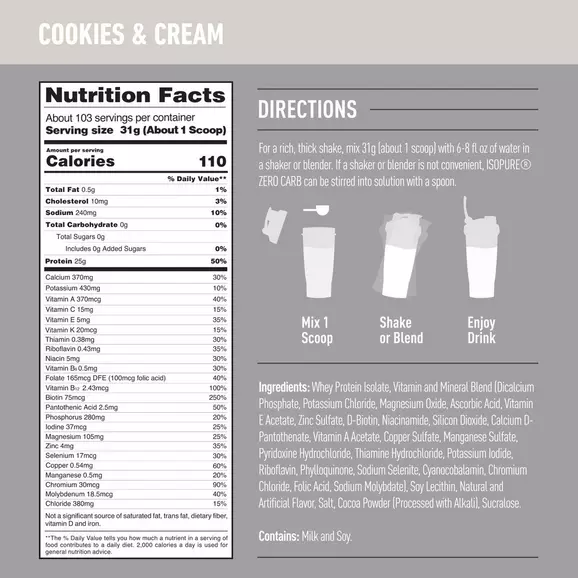 Product Overview Zero Carb/Low Carb Protein Pack in high-quality protein, without packing on the carbs. Just pick your level: Zero Carb or Low-Carb (which also has ZERO sugar), both with 25 grams of 100% pure whey protein isolate per scoop and added vitamins and minerals—to help you perform at your peak. It’s made with naturally occurring and added glutamine—and always without gluten, lactose or fillers. Available in a wide range of flavors so you can mix up some seriously tasty and dynamic recipes. Benefits Supports muscle building and recovery Helps meet daily protein needs Weight management support Supports muscle health as we age Suggested Use WHEN TO CONSUME? Post workout or other strenuous activity First thing in the morning Between meals HOW TO CONSUME? Mix 1 scoop with 6 fluid ounces of water, milk or your favorite beverage in a shaker or blender.