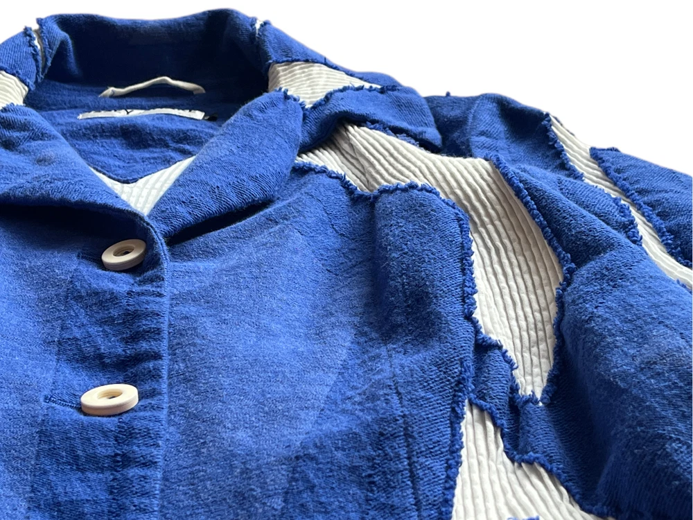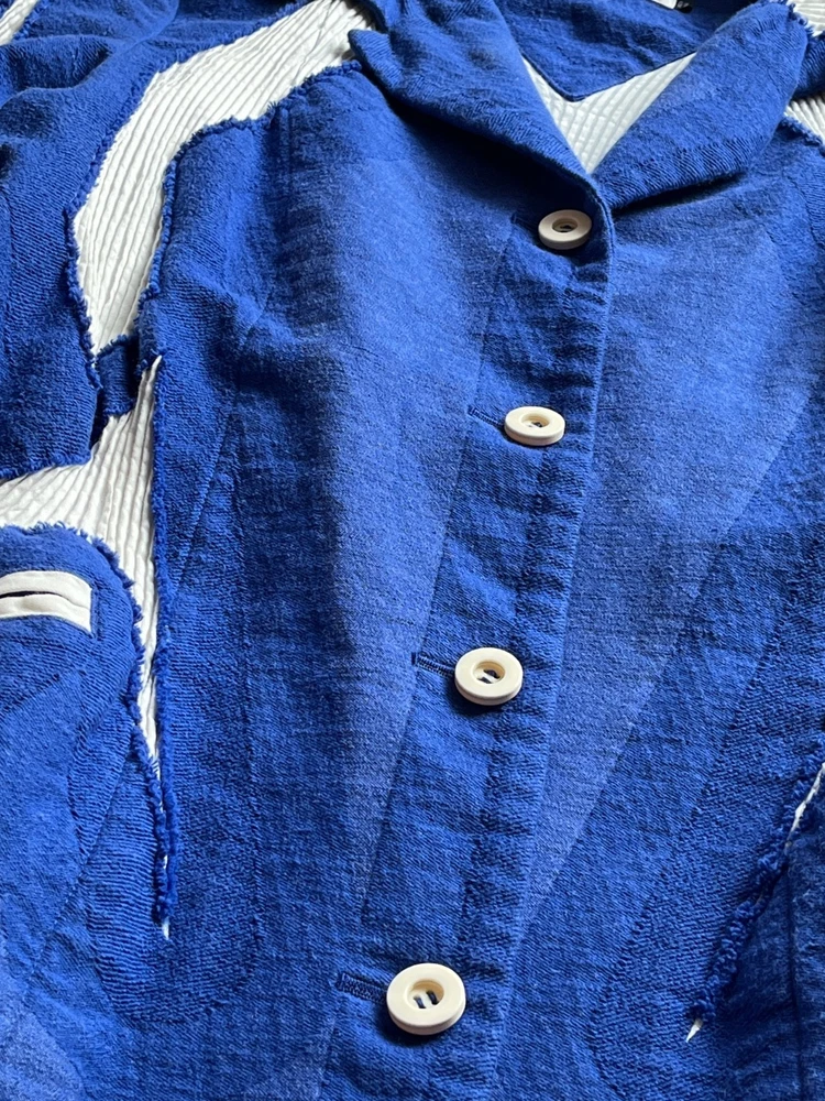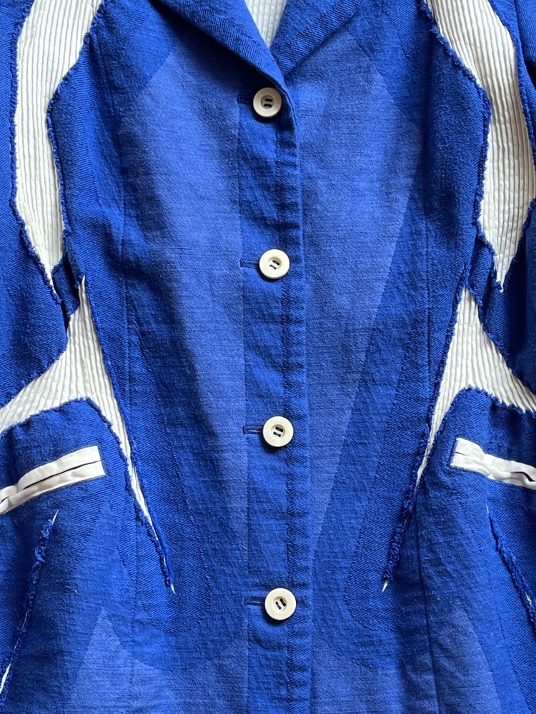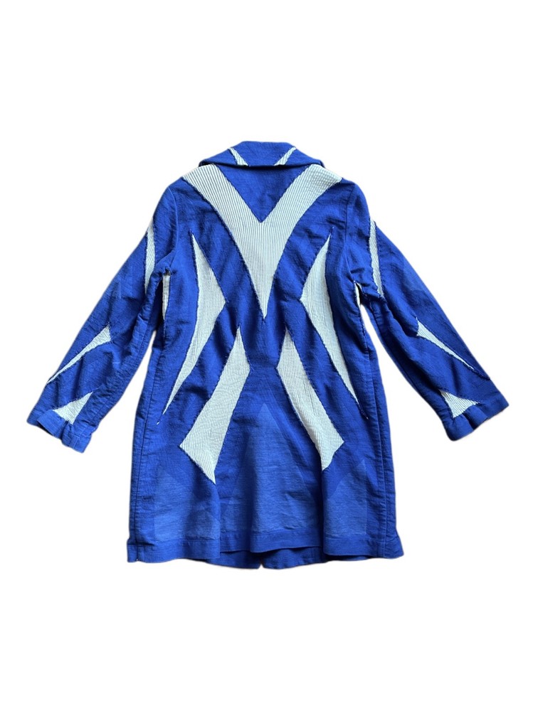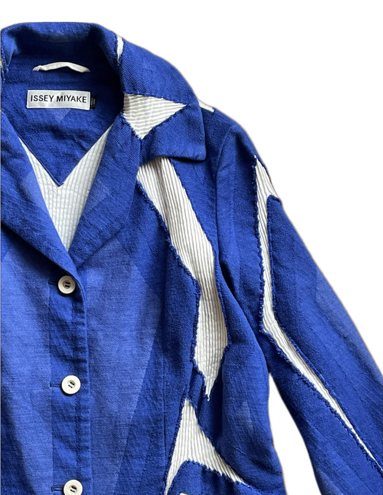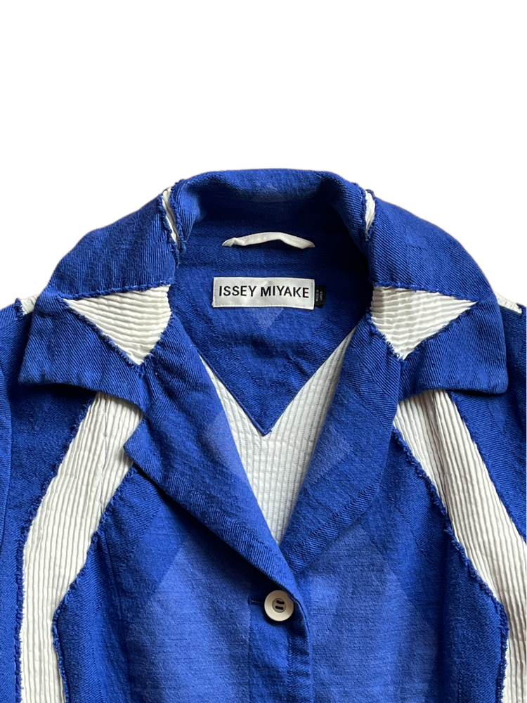 Womens ‘Issey Miyake’ long-sleeve, cobalt blue pleated jacquard jacket with contrasting ivory pleated patchwork panels. Features a structured collar, front button closure, two front welt pockets, and an artfully deconstructed aesthetic with raw-edge detailing. Mid length with a relaxed, straight silhouette. MEASUREMENTS: Length: 85.5 cm Chest: 49 cm Shoulder width: 43 cm Sleeve length: 60 cm This garment has been measured flat. SIZING: Size as indicated on tag: 2 FABRIC: 97% Cotton 3% Polyurethane BRAND: Issey Miyake ORIGIN: Made in Japan CONDITION: This pre-loved item is in excellent condition and is sold as is. Please don’t hesitate to contact us if you have any questions. IMPORTANT INFORMATION: We do not offer refunds or exchange! Extreme care is taken when measuring each garment to ensure our sizing information is as accurate as possible! Please take the time to read through each measurement carefully and compare against something you already own that you know fits you well. We will not be held liable for any missing or damaged parcels as a result of negligence and or poor handling by any third party. We are very easy to reach via message, so if you have any questions regarding fit or if you wish to purchase additional parcel insurance please contact us before completing the transaction. Shipping costs are non-refundable, and international customers are responsible for any import duties/taxes that may apply. All shipping comes with tracking.
