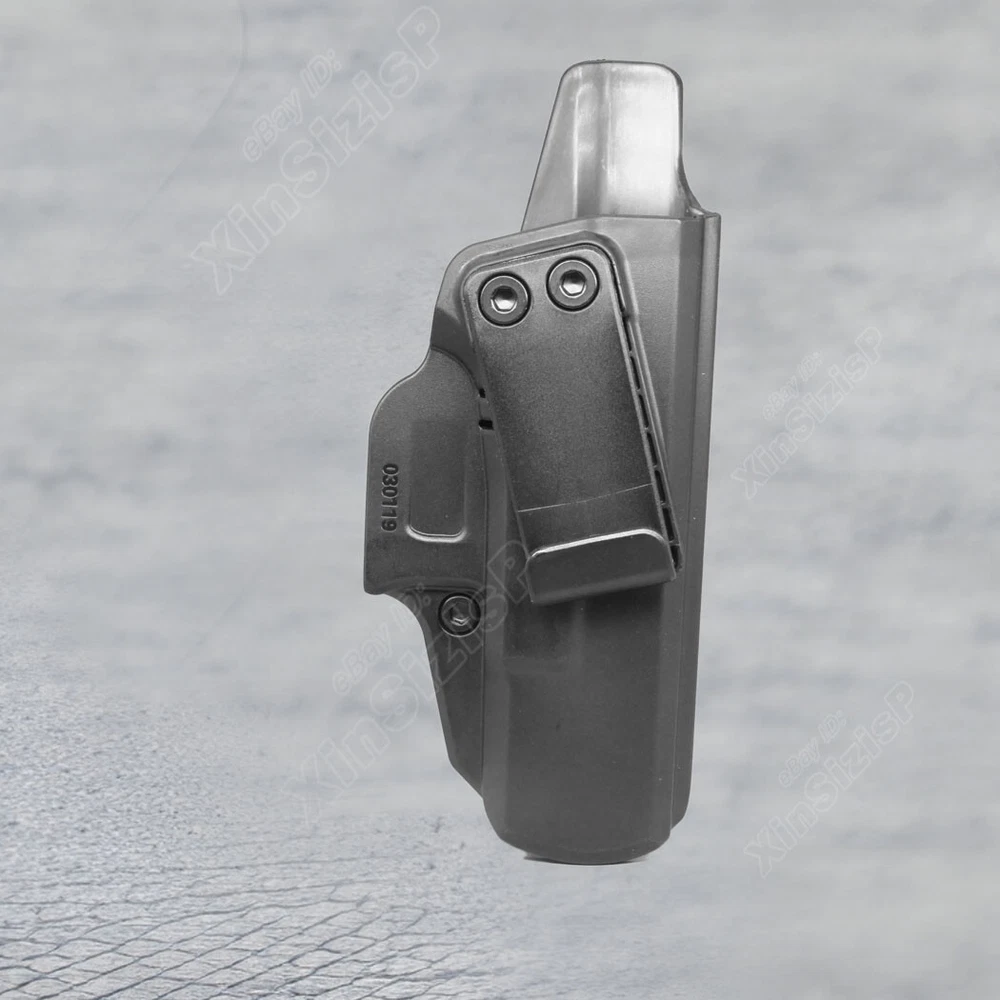 High Quality Military & Police Grade Polymer IWB Holster Specially Designed For Fast Draw During Duty Or Shooting Competition. Tactical Inside Waistband H olster Fit Glock 19 /19t /19x/32(Gen1-5) and Glock 23 (gen 1-4 ) ( I t can not fit the gun with Optic Mount Mini Sight a bove on the end of the barrel , and can not fit the gun with laser , embedded chassis, and flashlight style ) Adjustable by the Allen key that is provided with your holster to loosen or tight the screw on the belt loop and adjust. The retention of the holster can also be adjusted with the Allen key, by adjusting the two screws placed in front of the trigger guard. Unique belt J-clip sits under the belt and over the pants, which ensures more table releasing and holstering to prevent accidental shipping or falling. Compatible belt clip fits belt width up to 2 inches. Tough, Durable Material - Custom-molded body made of polymer stronger than leather that will wear out, adapt to every bad environment In the Package: · 1* Holster · 1*Allen Key Shipping: Ships same day or next except Sundays and Holidays ! Free shipping! Ship by USPS First Class Package. 100% MONEY BACK GUARANTEE. Any question please be free to contact with us .Thanks!