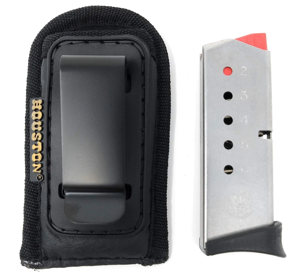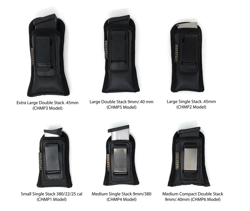 ECO LEATHER Concealment Magazine Main Characteristics: Small Single Stack .380/.22/.25 cal (CHMP1 Model) Small Single Stack 380/22/25 cal: 4 1/8" x 2 3/8" x 1" Fits Most Small .380/.22/.25 Caliber Like Glock 42, Keltec, Ruger, BG. Main Characteristics: This holster is one of the Houston new releases, carefully designed to carry on day-to-day use. This holster is very safe, easy and confrontable to use as concealment. Is water and sweat-proof and resistant. It combines the very soft texture of treated ECO leather with the precise hold of a flexible metal clip. Provided also a new passive retention system that leads to a quick draw in a risky situation. Note: Please see the image with Size and descriptions to find the right size for your Magazine. If it doesn't fit your magazine, we will offer a 100% Satisfaction guaranteed or exchange for the right fit/size. Your choice. ECO Leather Inside The Waist Magazine With Metal Clip Fits Most Small .380/.22/.25 Caliber Like Glock 42, Keltec, Ruger, M&P BODYGUARD .380 BG, Taurus .380 Small Single Stack .380/.22/.25 cal (CHMP1 Model) Measures: 4 1/8" x 2 3/8" x 1" *** Magazine Not Included ***