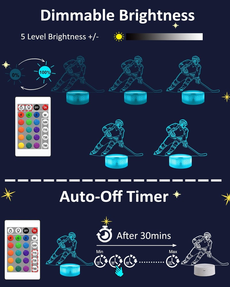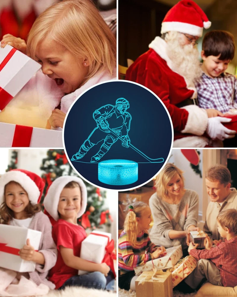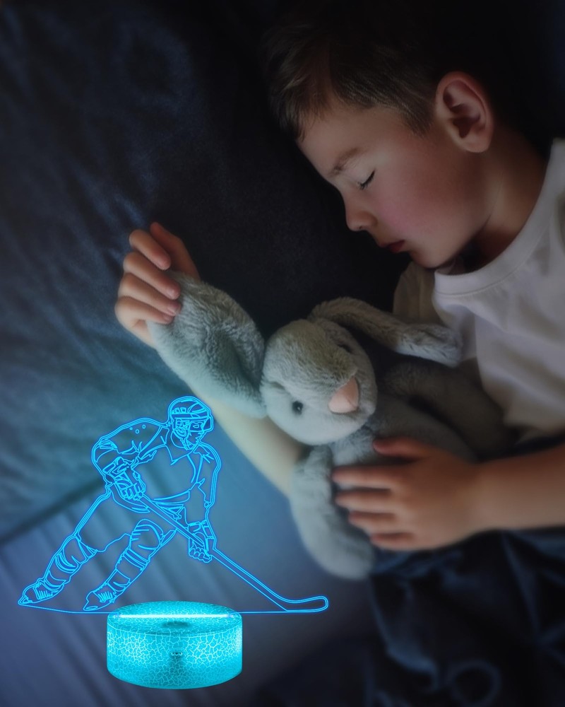 Why Choose our Brand: ? ✔ A Brand new 3d ice hockey glow night light and best ideal choice for room decor. It sure will impress your guests when they walking in the room. ✔ It's not just a kid's nightlight, also the big boys and men. It's perfect creative toy for anyone who likes ice hockey and has a sense of eye-opening. ✔ 16 colors changing/ Remote Control function/ Timer/ Dimmable/ 4 modes of color flashing (Flash, Strobe, Fade, Smooth) / Two ways of power supply: 3*AAA Batteries(not included) or USB plug in (Suggested) ✔ Best Gifts during Birthday, Halloween, Christmas, New Year, Thanksgiving, Valentines, Mothers Day, Fathers Day, Graduation Day. Satisfactory service: ★180-days refund protection. ★SAFE-BUY for any quality-related issue. Note: ⚠【3D just Visual, the lamp itself is Flat】ice hockey 3d lamp is made with 3d technology to create a gorgeous optical 3d illusion ⚠On/Off switch on the base, connect to the USB adapter (Adapter Not Include) ⚠Not suitable use for reading or main lighting source Description: Colors: 16 Color Changes Available with Remote Control Power Input: DC 5V 1A Switch mode: Touch Switch Product Power: 0.5W Power spend: 0.012kw.h/24 hours; 4.38 kw.h per year LED life span: 10000hours Material: Acrylic + ABS Package Weight: 300g Package include: -1 x Acrylic Plate -1 x ABS Base -1 x USB cable -1 x Remote Control -1 x Instruction Manual 🏒【Creative 3D Visual Effect】The ice hockey lamp is made of laser engraving on an optical acrylic plate to show the optical amazing 3d illusion. The kid night light is a unique toy for all the ice hockey little fans and has a sense of whimsy. It's a great decor for the sports Themed room 🏒【Remote Control+Timer+Dimmer+Smart Touch】Newly upgraded version ice hockey night light can be set free from 15 minutes to 12 hours. The 3d lamp has 16 colors changing and 4 kinds of flashing, and you can adjust the light brightness to not impact your sleep 🏒【Eco-friendly & Safety】Bigger SIZE of acrylic panel scratch-resistant is made from Safe approved eco-friendly material, safe for the human body. High-quality LED light with soft, uniform, non-flicker light, harmless to child's eyes./ Two methods of electricity supply:3*AAA Batteries (not included) or USB cable 🏒【Personalized Gift】The ice hockey hologram lamp can added attraction to the dark corner of the house during night time. It's a perfect Birthday, Christmas or holiday gift toy for boys and girls. Used in children bedroom, baby bathroom, living room, hallway, study, office, bar decoration 🏒【Customer Service】Stands by the quality of our ice hockey gifts night light. The bedside light has been thoroughly tested before given to you. We are here to help: If it doesn't work out for you for any reason please feel free to contact us on Amazon, we will get back to you in 24 hours