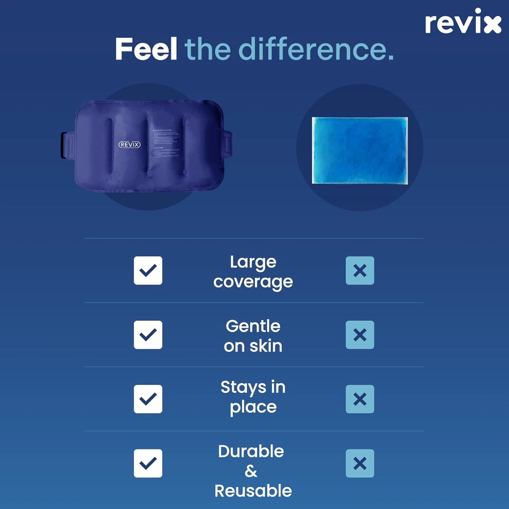 Long-lasting Back Gel Ice Pack: This soft gel ice pack is filled with 30% more unique gel allowing this ice pack for back to better recovery. Plush lining is intended to avoid condensation and frostbite. Nylon cover offers deeper penetration of the cold temperature Hands-free Cold Compress Therapy: The multi-purpose ice bags can be applied on the shoulder, lower back, elbow, thigh, shin, and calf. The soft ice pack with a stretchy strap offers compression to ease discomfort in various parts of the body effectively Flexible Lower Back Ice Pack Wrap: The body ice pack with a lower freezing point of -13 ℉, stays malleable after frozen. Cooling gel pads with wide double-sealed edges and extra-thick nylon material are reliable to reuse without worrying about gel leakage Universal Fit Ice Pack for Lower Back: This cold gel pack reusable is one size fits all, great for home use while effectively easing fatigue, facilitating post-workout recovery, and recharging muscles after the gym Feel Better, Live Better: We are committed to creating excellent reusable ice packs to soothe the discomfort and fatigue people experience in their daily routines. With its professional design and quality materials, REVIX back ice wrap is an optimal choice for you Product description The video showcases the product in use. The video guides you through product setup. The video compares multiple products. The video shows the product being unpacked. REVIX Ice Pack for Back Merchant Video REVIX Gel Ice Packs Series Add to Cart Add to Cart Add to Cart Customer Reviews 4.6 out of 5 stars 8,305 4.6 out of 5 stars 60 4.5 out of 5 stars 853 4.4 out of 5 stars 1,460 4.4 out of 5 stars 120 4.4 out of 5 stars 361 4.7 out of 5 stars 4,952 Price $20.99 $ 20 . 99 $23.99 $ 23 . 99 $11.99 $ 11 . 99 $19.99 $ 19 . 99 $29.99 $ 29 . 99 $13.99 $ 13 . 99 $25.99 $ 25 . 99 Target Area Lower back, Thigh, Calf Lower back, Thigh, Calf All body parts Hip, Shoulder, Back, Thigh Shoulder, Arm, Elbow Ankle Shoulder, Back, Thigh, Calf Fabric of Gel Pack Plush & Nylon Sides Ice silk, Terry Fabric Nylon, Terry Fabric Nylon, Terry Fabric Nylon & Terry Sides Nylon & Terry Sides Plush & Nylon Sides Compression Level High High High High High High High Active Area 16 x 9'' 16 x 9'' 10 x 5" 19 × 12.2" Shoulder14×9.8'' Elbow12×8.6'' Sole 10.2'' x Height 8'' 13 x 21'' Therapy Type Cold Cold Hot & Cold Cold Cold Cold Cold