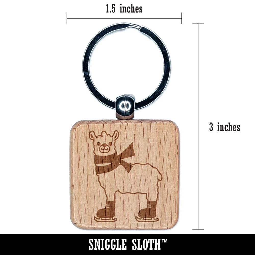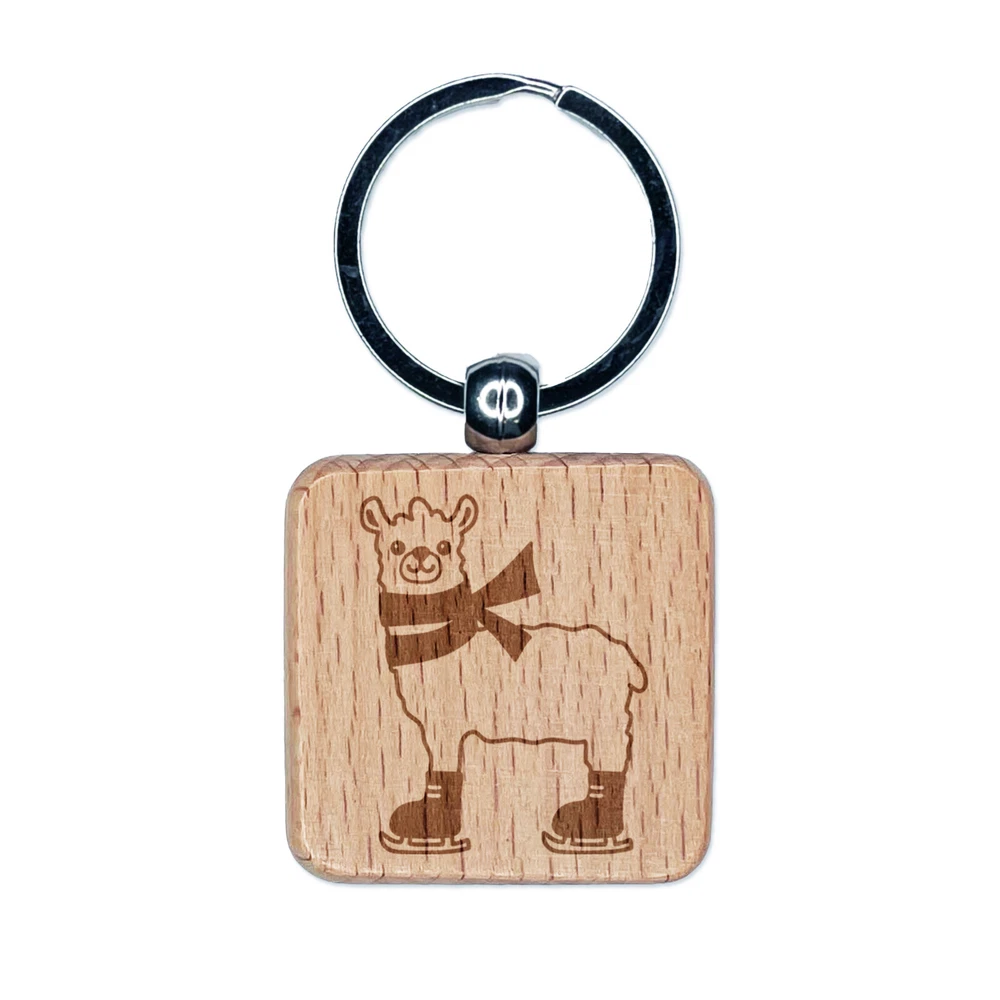Ice Skating Llama Winter Engraved Wood Square Keychain Tag Charm