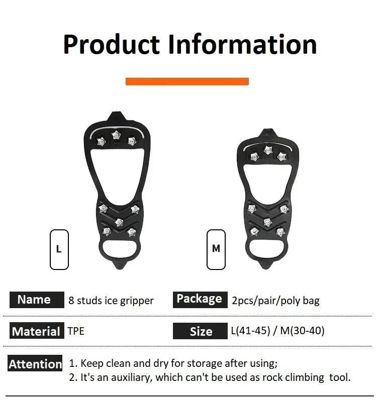 FREE SHIPPING 30 DAYS RETURN EASY PAYMENT 8 Teeth Ice Gripper Spike for Shoes Winter Outdoor Anti-slip Hiking Mountain Cli Color: black Material: TPR Size: M,L Features: [Wear-resistant PET Material]: The material of the ice grips Made of TPE and non-slip studs.The nail position of each shoe is determined after countless tests to maximize the grip. [Easy to Wear]: Just stretch the front end of the crampons and place it on the front of the shoe, and place the back on the heel. [Anti-slip Detail Design]: 8-claw design can offer excellent traction on ice and snow, so as to avoid slipping or blowing down in a snowstorm. [Fit for Adult Child ]: The universal size is perfect for adult/child men and women. [Wide Range Usage]: Gripper spike is fit boots, sneakers, snow boots, snow shoes, casual and dress shoes .These ice cleats for shoes and boots can be stretched, folded, and stored. Products include: 1 Pair Ice Cleats Grippers Instructions: 1. Carefully fix the grip on the shoe, starting from the front, and then stretch the back to the heel to ensure that they are firmly connected. 2. We recommend using handles only on snow or ice to prevent stud wear. 3. After use, be sure to clean the handle with a dry cloth. Store the ice grab in a cool, dry place, away from direct sunlight. Notices: 1.Please allow 1-2mm differs due to manual measurement, thanks. 2.There could be some slight differences in the color tone of the pictures and the actual item. 3. If there is any problem with the product, please contact me before you leave a comment, I will do my best to solve the problem for you.Thank you for your understanding. REVIEWS The product came very well packaged. I'm very happy. thank you for everything. Seller strongly recommended. This is great! I definitely recommend! Product looks amazing Delivery was fast. Excellent seller, great communication. I advise everyone to buy it!