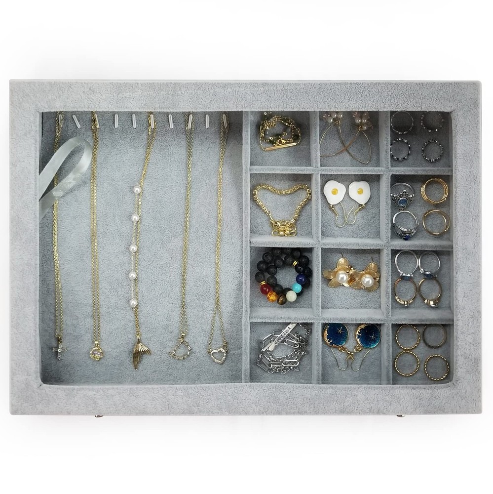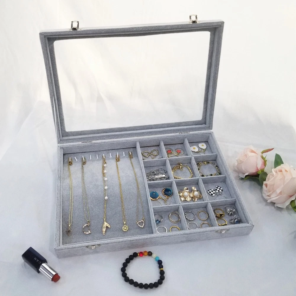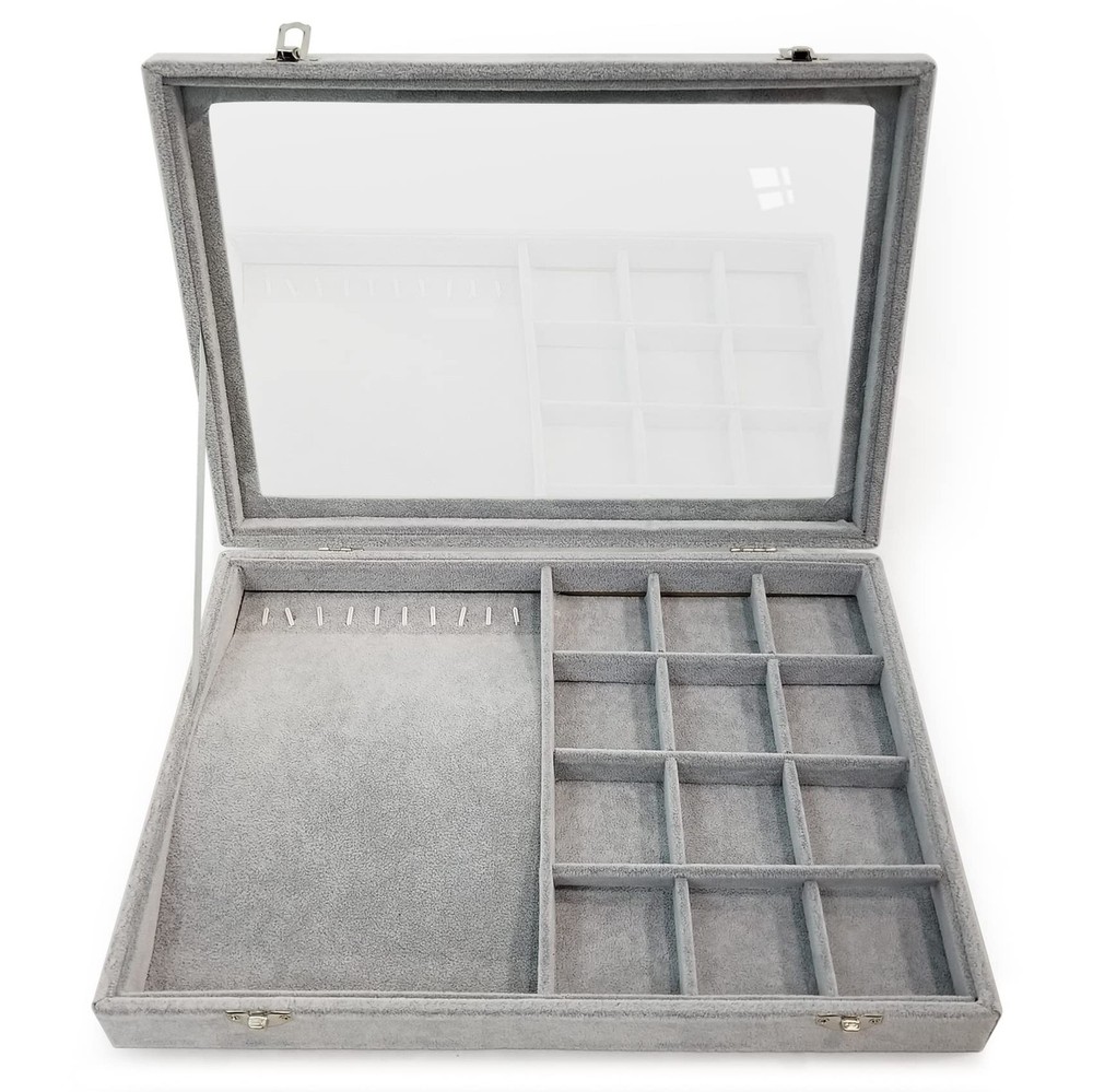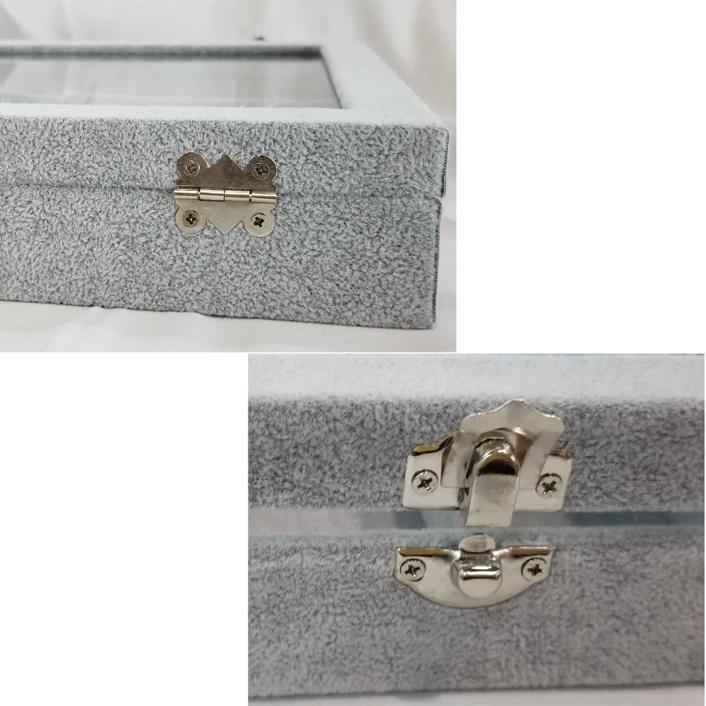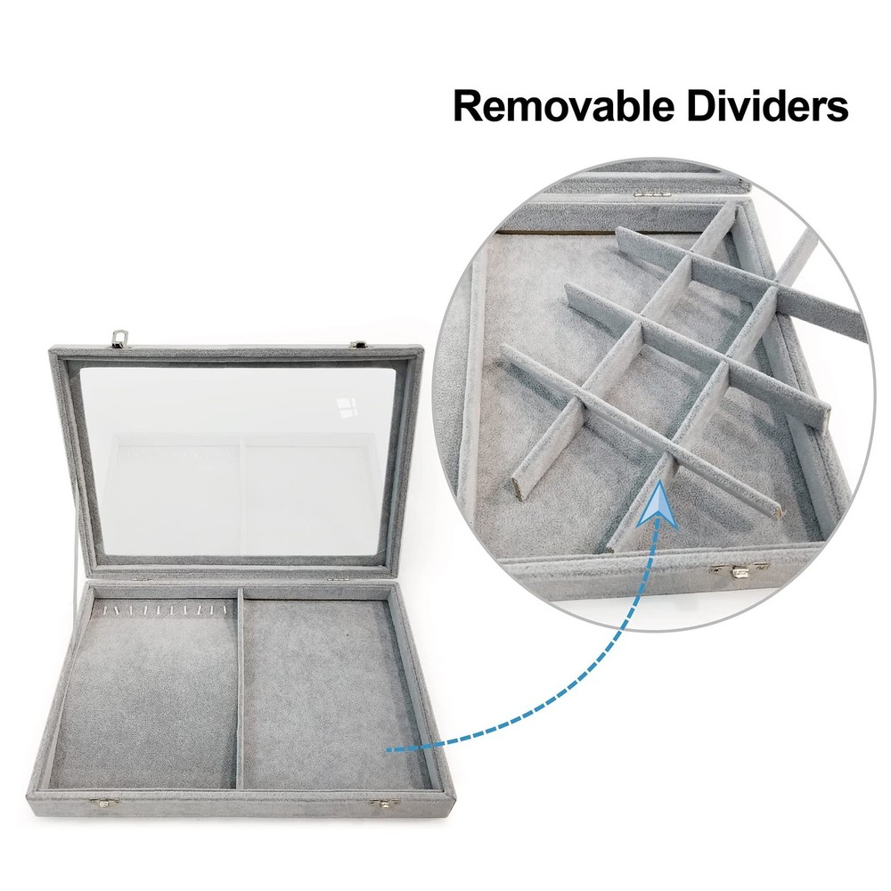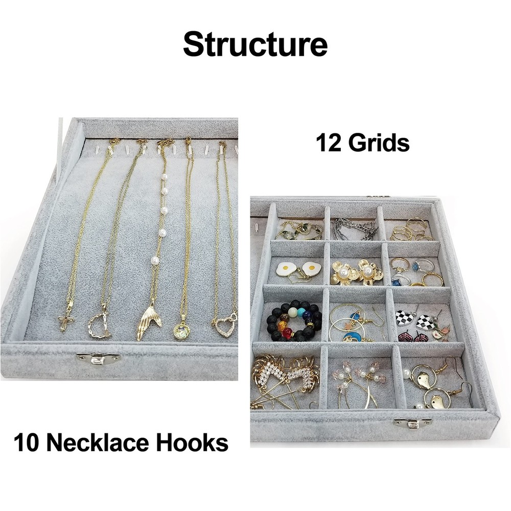 Ice Velvet Jewelry Box Display Case with a Clear Glass Window,10 Hooks Necklace Organizer Box and 12 Grids for Earrings Rings Storage Grey Product Details Color: 12 Grids & 10 Necklace Hooks Brand: BesyPro MPN: Does not apply UPC: Does not apply EAN: Does not apply Color: 12 Grids & 10 Necklace Hooks Brand: BesyPro Material: Ice velvet & glass Style: Elegant Special Feature: Durable,Large Capacity Recommended Uses For Product: Ring Product Dimensions: 13.78"D x 9.45"W x 1.97"H Target Audience: Women, Girls Shape: Rectangular Occasion: Mother's Day, Wedding, Birthday, Valentine's Day Color: 12 Grids & 10 Necklace Hooks Brand: BesyPro Material: Ice velvet & glass Style: Elegant Special Feature: Durable,Large Capacity Recommended Uses For Product: Ring Product Dimensions: 13.78"D x 9.45"W x 1.97"H Target Audience: Women, Girls Shape: Rectangular Occasion: Mother's Day, Wedding, Birthday, Valentine's Day Mounting Type: Table Top Finish Type: Metal Inner Material: Ice velvet Closure Type: Buckle Number of Drawers: 12 Item Weight: 1 Pounds Number of Compartments: 10 Jewelry Storage Type: Jewelry Case Number of Items: 1 Manufacturer: Junclair Global Trade Identification Number: Item Weight: 1 pounds Country of Origin: China Size: one size Finish: Metal Pattern: Solid color Number Of Pieces: 1 Special Features: Durable,Large Capacity Batteries Included?: No Batteries Required?: No Date First Available: October 27, 2021 Large Capacity : This jewelry case is composed of 12 grids & 10 necklace hooks which can store earrings,rings and necklaces Clear Lid : Equipped with a clear glass lid that help you find your jewelry quickly and keep them dust free High Quality : Made of durable composite board covered with soft and smooth ice velvet to protect your jewelries Metal Clasp : Easy open and close with 2 clasp design,practical jewelry case keep your beautiful jewelry neatly organized in one place Great Gift : If you have no any idea of gift for Birthday,Christmas,Valentine's Day,Mother's Day,Anniversary Day etc,this is your ideal choice