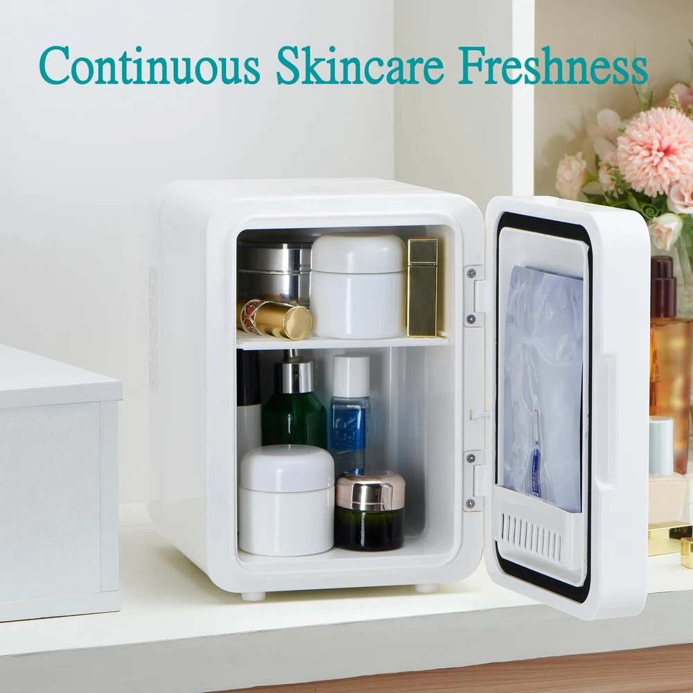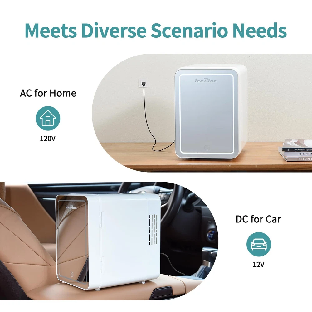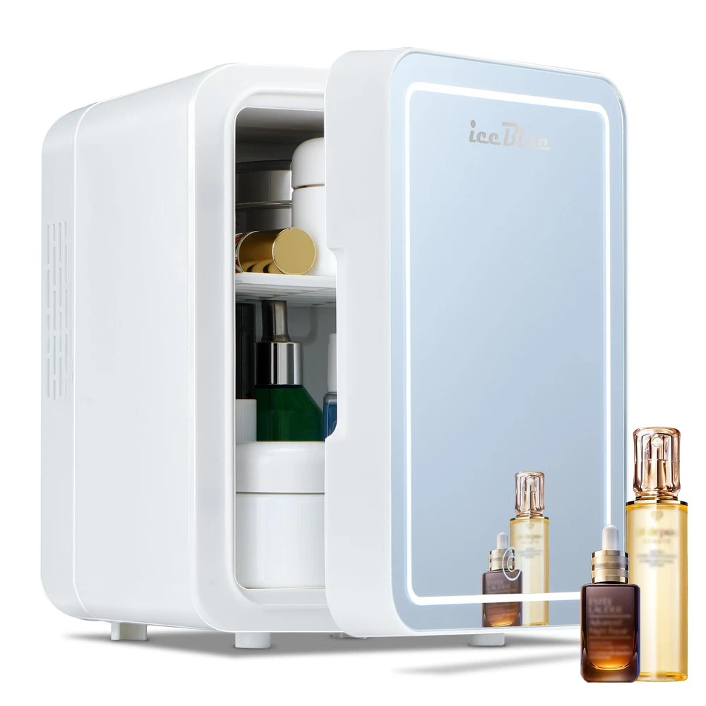 【Encounter New Favorite for Exquisite Life】The 1st visible window design on the door allows you to see surprises inside at a glance without opening the refrigerator door. Whether it's for storing beverages, keeping fruits fresh, or refrigerating skin care products, it can perform perfectly. The mini fridge for bedroom with a visible window brings aesthetics and practicality together, adding endless convenience and beauty to your life 【Multifunctional 4 Liter Mini Skin Care Refrigerator】Quickly switch temperatures through the cold and warm buttons to extend the shelf life of skin care products, heat masks, store food and beverages or keep breast milk warm 【Three-digit Luminous Mirror】This mini refrigerator, oversized high-definition mirror and LED lights are designed to help you easily apply skin care products and cosmetics in different environments and lighting 【Fashion Meets Function】This beauty refrigerator is equipped with a removable shelf and door pocket for easy allocation of storage space. Your cosmetics and beverages can stay cool and provide the best temperature for your skin care products 【Low Power Consumption】Our portable refrigerator adopts advanced technology. Semiconductor cooling is faster and more efficient. It does not use liquid refrigerants and does not add Freon 【Wide Range of Applications】Whether you are indoors, in the bedroom, in the car, in the office, in the dormitory, on a ship, in an RV, or while traveling, the Iceblue mini refrigerator is your best choice. With 110 volt AC adapter / 12 volt DC: Household AC adapter and mobile DC line