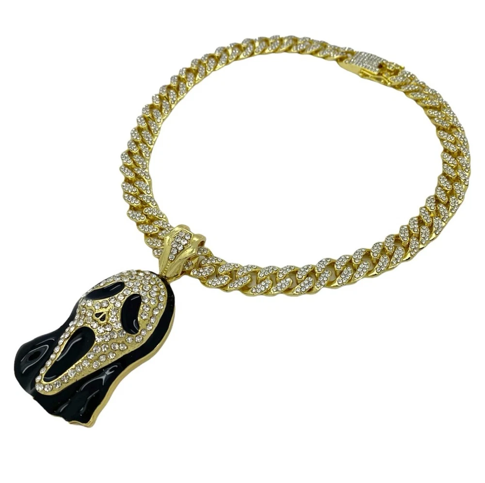 Elevate your style with this stunning Iced Out “SCREAM MASK” Pendant & Chain, a stunning addition to any classy jewelry collection.. With its gleaming gold color and eye-catching round white cubic zirconia stones, this piece is designed to dazzle and impress.. The pendant pays homage to iconic movie characters, adding a touch of pop culture flair to your look. Perfect for anniversaries or just to show off your unique taste, this pendant comes with an 18-inch chain to complete your stunningly bright accessory.. Whether you're dressing up for a special occasion or adding some personality to your everyday wear, this unbranded pendant is a versatile choice that speaks to your bold style and love for standout pieces.