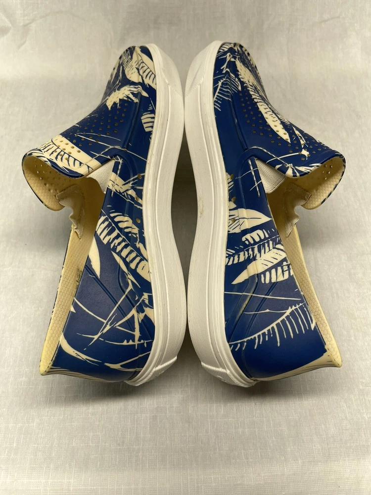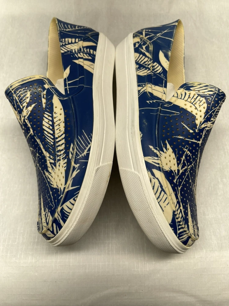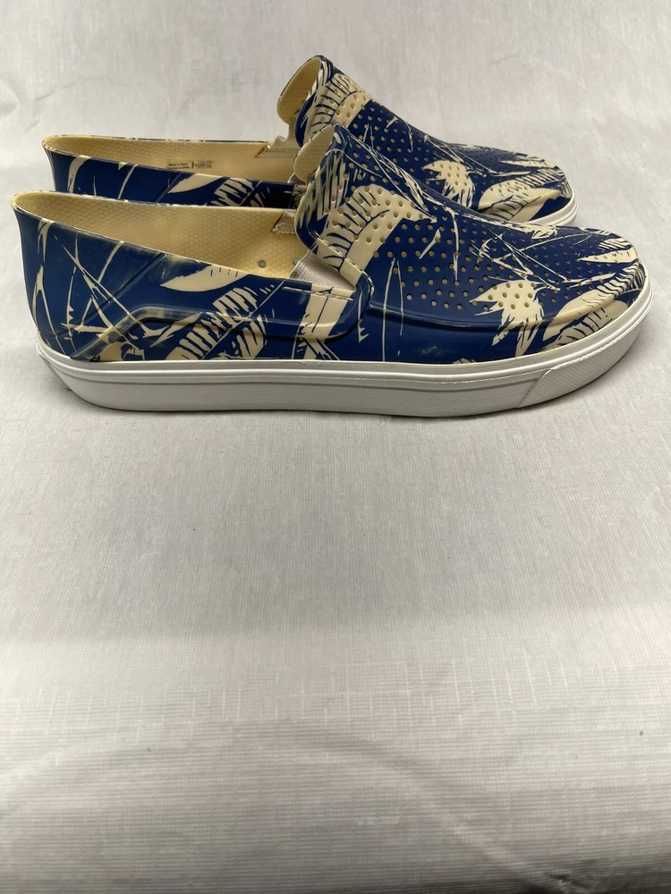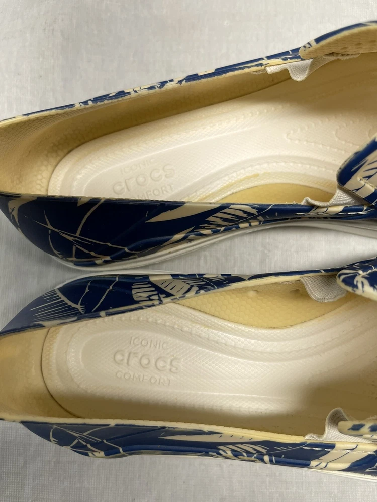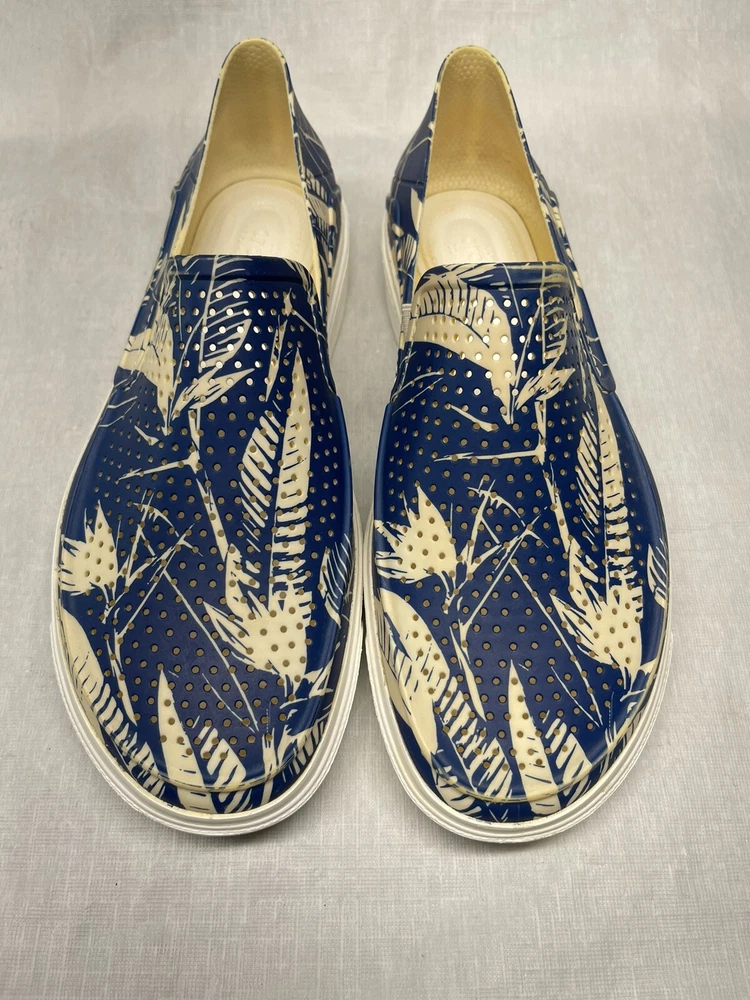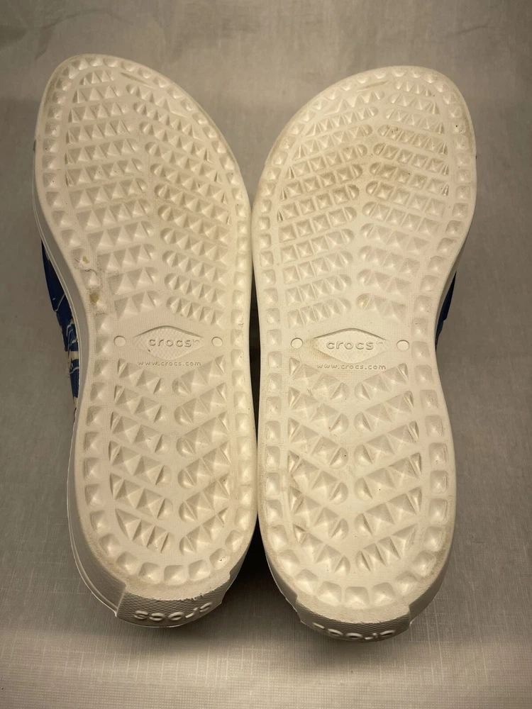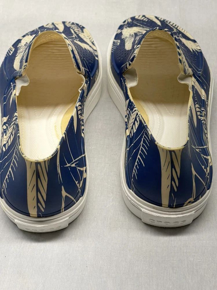 Step into summer with these iconic Crocs slip-on shoes. The blue and white floral pattern adds a touch of style to any casual occasion. The round toe shape and synthetic upper material provide comfort and durability, while the moderate cushioning level offers support for all-day wear. These shoes feature a slip-on closure, making them easy to put on and take off. The synthetic outsole material and cushioned features make them perfect for summer, fall, and spring. The Crocs brand is known for its quality and these shoes are no exception. Get your pair today and step up your casual shoe game!