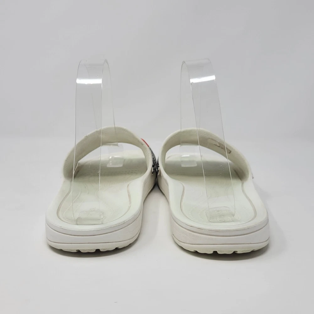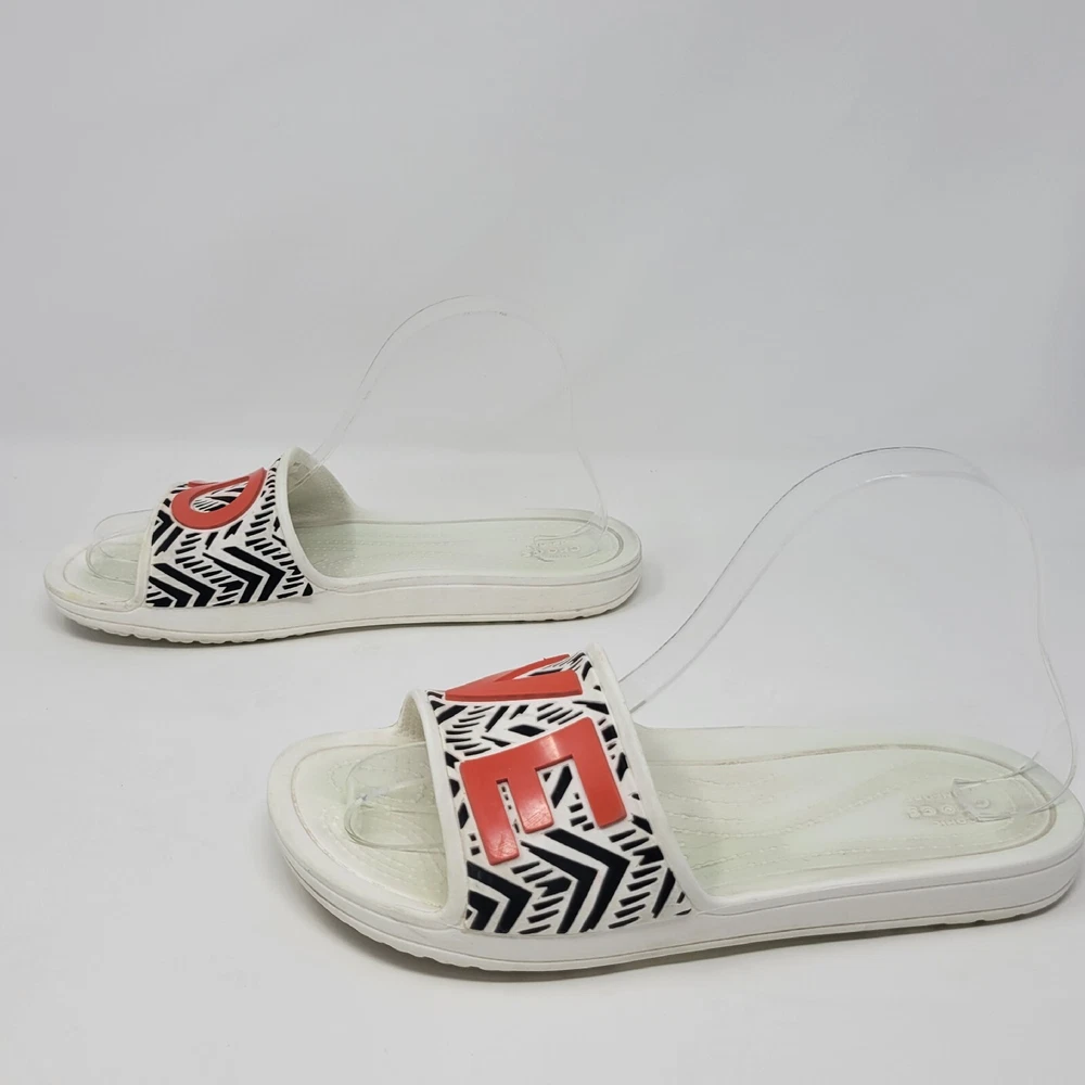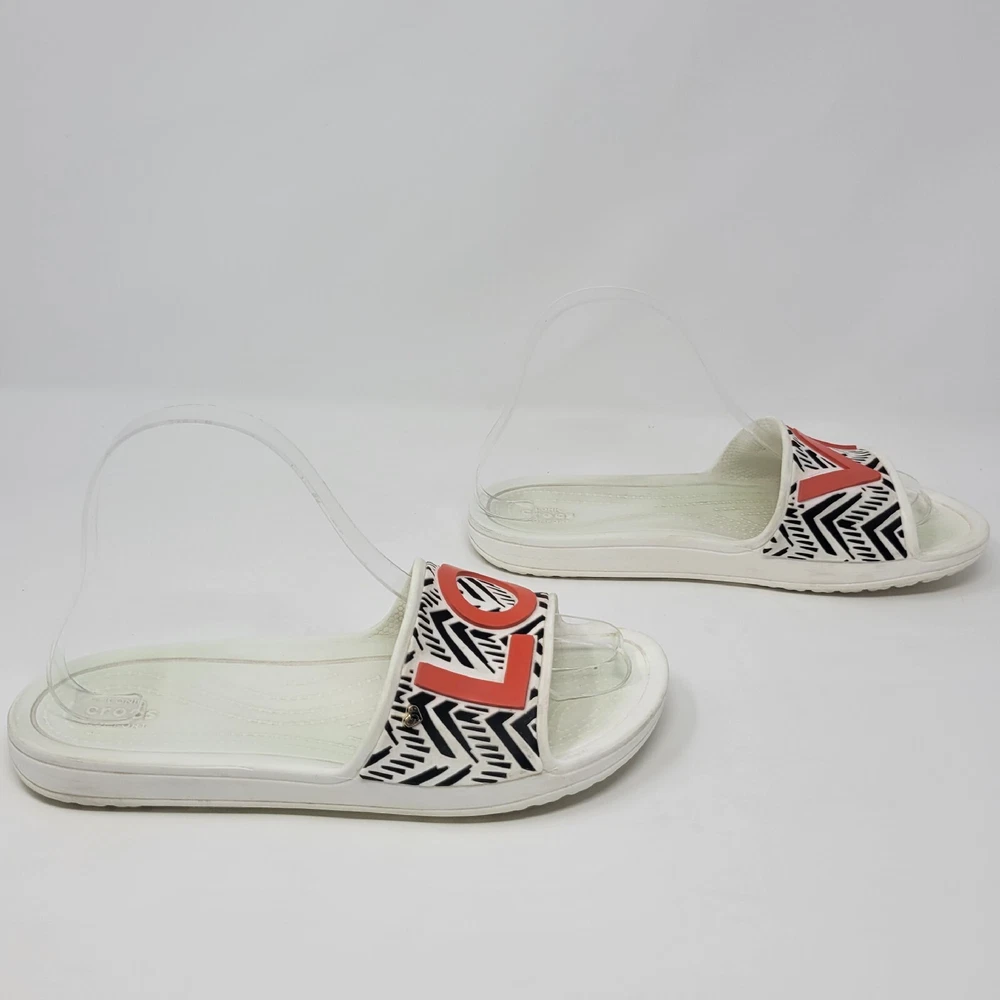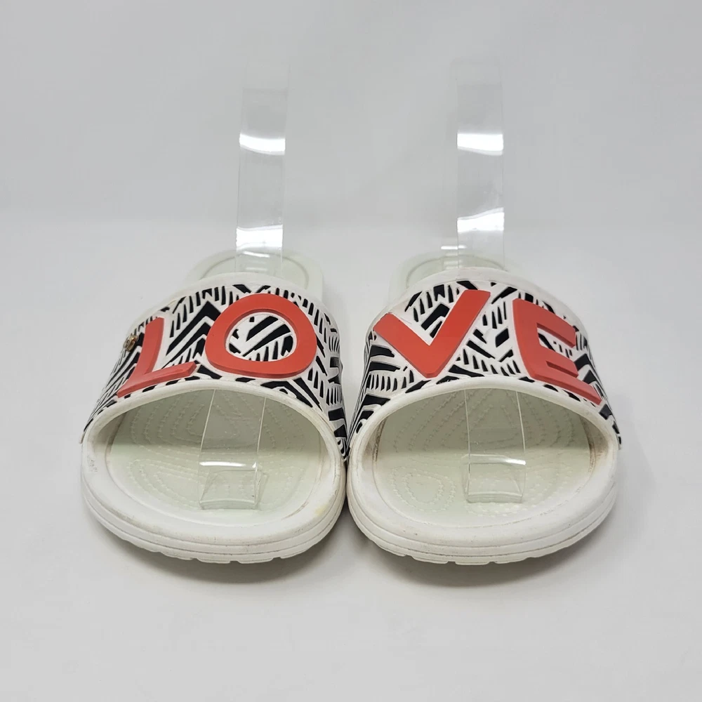Elevate your casual style with these iconic Crocs women's slide sandals featuring a trendy white, black, and red tribal love pattern. These lightweight sandals provide maximum comfort with a flat heel style and slip-on closure, making them perfect for your travel and casual wear needs. With a synthetic upper and lining material and a synthetic outsole, these sandals are durable and long-lasting. The sandal's accents include a logo, and the theme includes hipster, letters, numbers, and words, hippie, college, 80s, city, tribal, 90s, retro, hip hop, and logo, making them a versatile addition to your shoe collection. These sandals are available in US shoe size 7 and UK shoe size 5, with an EU shoe size of 38. These shoes are in excellent “pre owned” condition. For more information, please see photos or feel free to contact me with any questions. All orders are shipped within 24 hours of payment received.