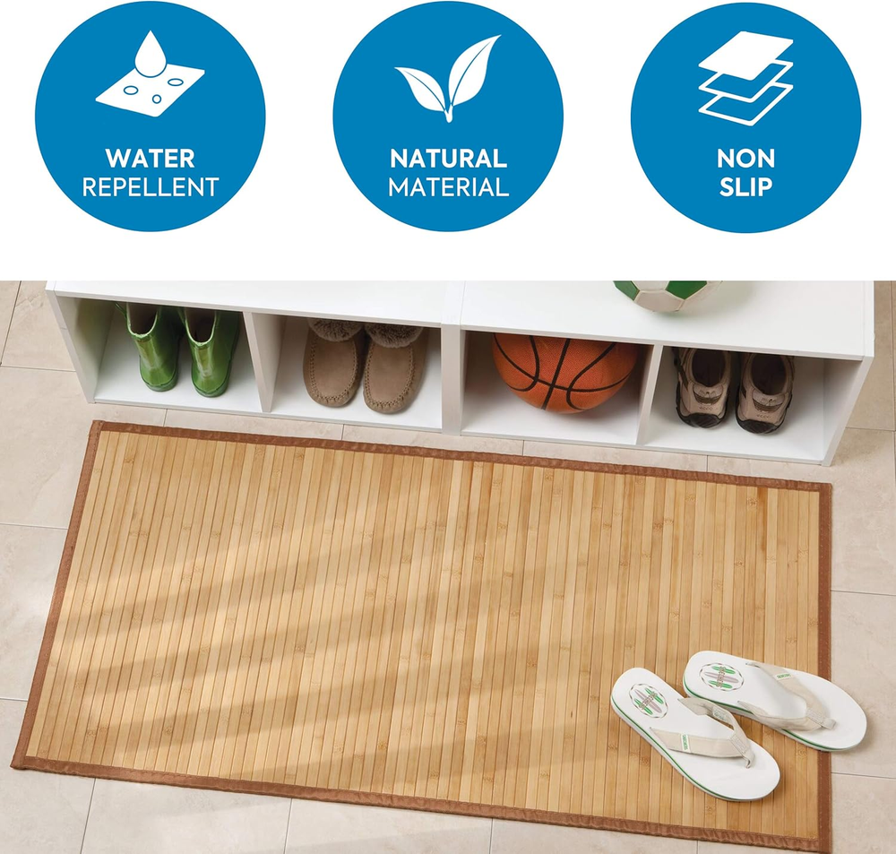 Bamboo Imported BAMBOO FLOOR MAT – Elevate your home for functional beauty with the iDesign natural bamboo rug and floor mat; water-resistant with a non-skid underside, the natural rug is ideal for a bathroom, mudroom, kitchen, entryway, hallways, and more WATER-RESISTANT – Great as a bathroom runner or hallway runner rug, it’s made of natural bamboo with water-resistant coating and a fabric border; bamboo bathroom mat has a non-skid underside to protect wood, carpet, or tile floors from damage STYLISH – Bamboo décor like this small rug can elevate your home with its modern, natural style; wood runner rugs complement any style home décor and make a great addition to any home IDEAL SIZE – Bamboo floor rug measures 34" x 21", perfect for any living space; use in bathrooms, entryways, kitchens, mudrooms, offices, and more IDESIGN – iDesign offers innovative storage products at a reasonable price; we’re a global leader in housewares with a mission to make every day easier with innovative products designed to help people organize and enhance their homes with style Elevate your home décor with the iDesign Bamboo Mat Rug Runner. The perfect addition to bamboo bathroom accessories and bamboo kitchen accessories, the natural rug can be used throughout a home in hallways, kitchens, bathrooms, entryways, and much more. It can even be used as a grounding mat. Made of bamboo with a water-resistant coating, fabric border and non-skid underside to protect wood, carpet, or tile floors from damage. Measures 34" x 21", perfect for any living space. With iDesign, you can live simply and sustainably every day.