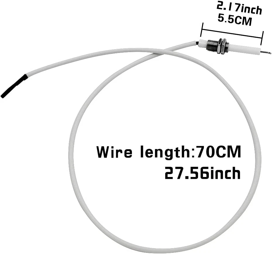 2 Pieces :27.56 inch(700mm) Ignitor Wire with M10*1 Ceramic Electrode length 55mm,product high temperature 200°C Universal spark with M10*1 thread includes two nuts to fix on your fire pit pan plate Please note that the connection to the igniter is circular, suitable for pressing the igniter;The end of the terminal is in round with 2.3mm insert, If yours is square, try to stamp it and connect your current igniter to get a signal Igniter ceramic electrode universally fit for many fire pit table pan,also fit BBQ grill burner, gas stove, grill, heater.Please check and compare dimensions with your original parts before place order Made of high quality material ensure safe and long-lasting performance. There is a heat resistance coating over the wire to ensure safe use. will guarantee you 100% satisfaction of the Ceramic Electrode Assembly Igniter Ceramic Electrode Replacement Part .27.56-inch Ignitor Wire &Ceramic Spark Plug Ignition Electrode for Fire Pit Burner, Gas Grill Burner