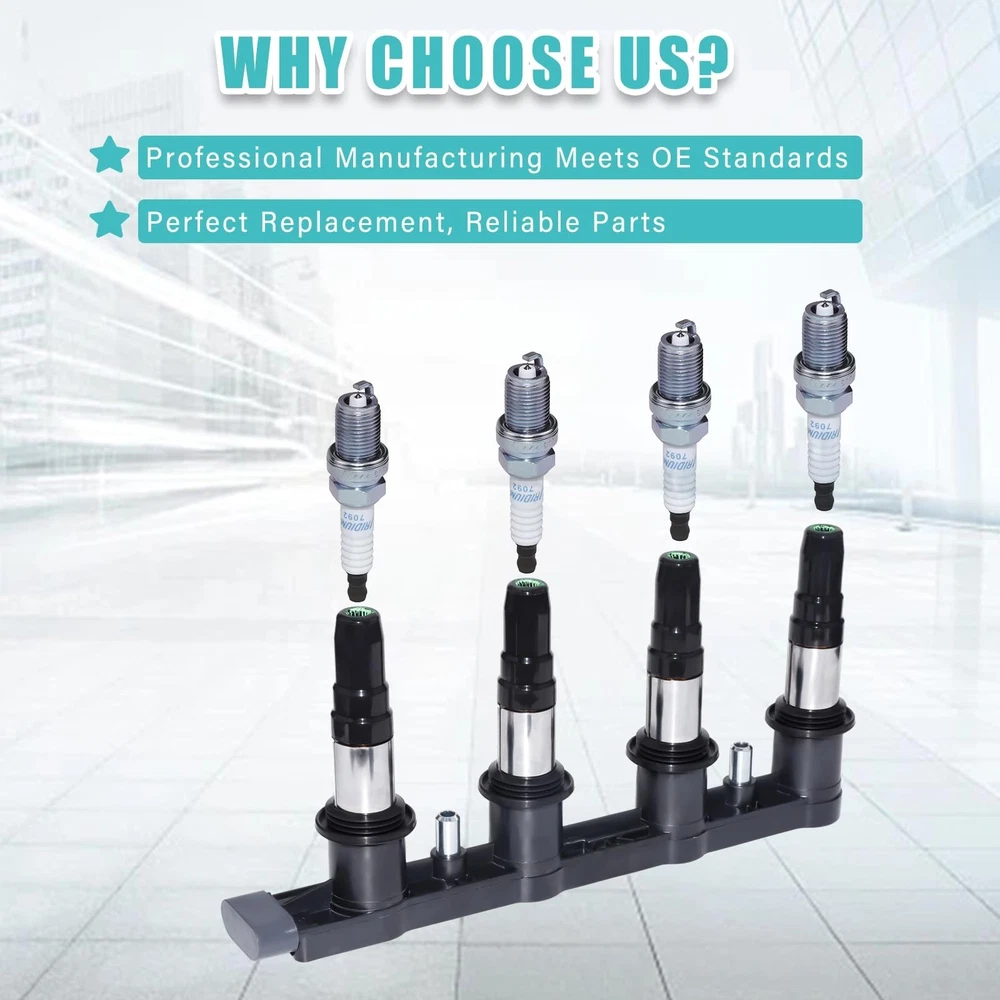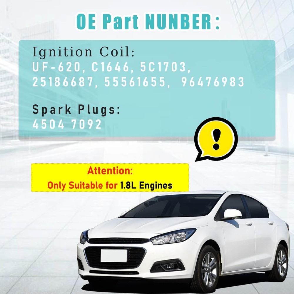 Ignition Coil Pack and 4 Iridium Spark Plugs Compatible with 2011-2015 Chevy Cruze 1.8L, 2016 Chevrolet Cruze Limited 1.8L, 2012-2017 Chevy Sonic 1.8L, Replace UF620 9091902247 C1646 4504 7092 Product Details Brand: RAWOK Core Material: Copper Thread Size: 0.551 inches Top Material Type: Nickel Vehicle Service Type: Car Brand: RAWOK Core Material: Copper Thread Size: 0.551 inches Top Material Type: Nickel Vehicle Service Type: Car Automotive Fit Type: Vehicle Specific Fit OEM Part Number: UF620 4702 Manufacturer: RAWOK Model: Coil Pack Spark Plugs Item Weight: 4.05 pounds Package Dimensions: 17.28 x 7.24 x 2.64 inches Item model number: UF620 Exterior: Machined Manufacturer Part Number: RA9409-4702 Date First Available: March 8, 2024 Compatible VehicleCompatible with 2011-2015 Chevrolet Cruze 1.8L, 2016 Cruze Limited 1.8L, 2012-2017 Chevy Sonic 1.8L. Only compatible with Chevrolet 1.8L engine Reliable Partner1PCS Ignition Coil UF620 and 4 PCS Iridium Spark Plugs 4504 : High ignition efficiency, more powerful arc. Part NumberUF-620, UF620, C1646, 5C1703, GN10234, 25186687, 55561655, 610-00180, 96476983, 4504 7092 OEM MadeMade according to OEM standards, each ignition coil undergoes extensive testing to ensure reliability, perfect replacement for OE parts, and easy to install. Replace with new coils to awaken the car's surging power