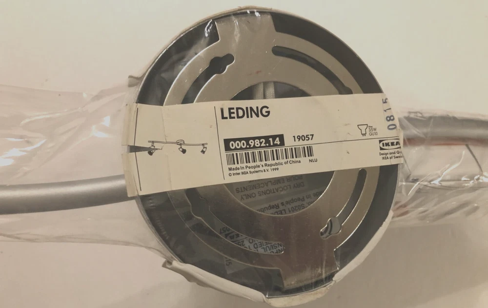 Features:3-LightItem Width:5 1/8" across mounting plateLight Direction:Downwards, IndirectItem Length:28"Material:Stainless SteelInstallation Area:IndoorColor:SilverRoom:Kitchen/Bathroom/Living room/OfficeLighting Technology:HalogenManufacturer Warranty:NABrand:IKEAShade Shape:Conegtin13:Does not applyType:Track LightingStyle:ModernUPC:Does not applyNumber of Lights:3Sensor Type:LightPower Source:HardwiredItem Height:5" with pin spots not extendedCountry/Region of Manufacture:ChinaModel:000.982.14Product Line:LedingMPN:19057Manufacturer:Ikea