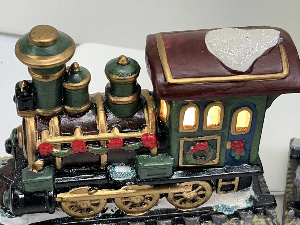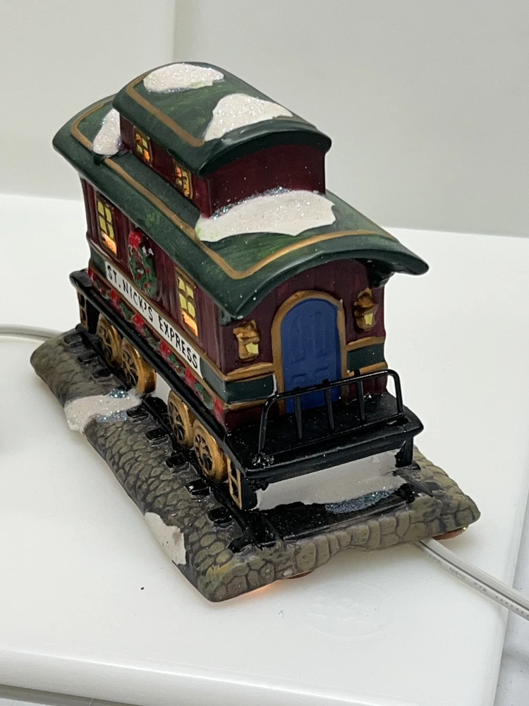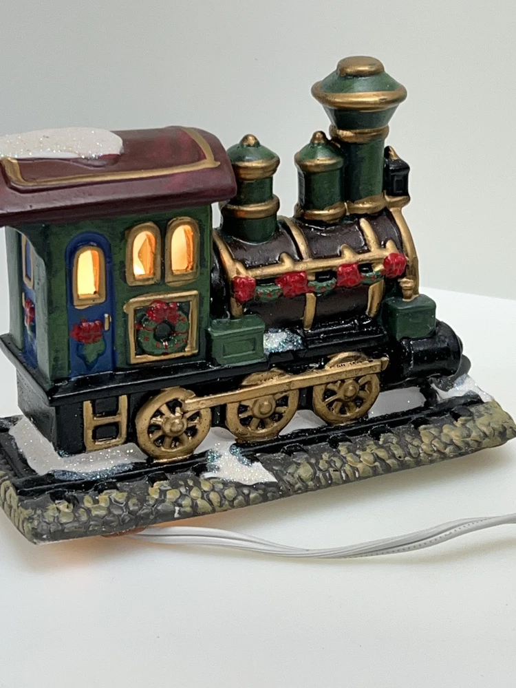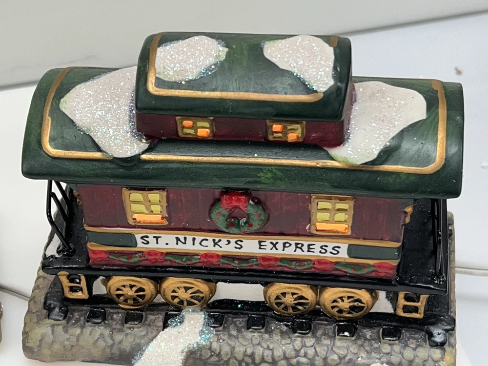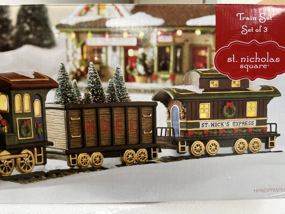 Saint Nicholas Square 3 Piece "Train Set" is a medium-sized, hand-painted ceramic and porcelain Christmas village display item from 2008. This whimsical train set features an asymmetrical design with a multicolor finish and measures 18" in length, 5" in height, and 3" in width. It is illuminated with a cord and comes boxed as part of the St. Nicholas Square Village Collection, suitable for any room decor during the holiday season. Absolutely perfect pristine condition! Comes with all clean original packaging including cord & lights
