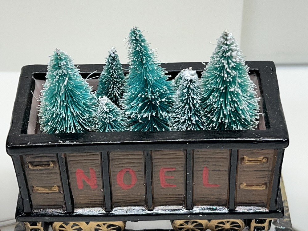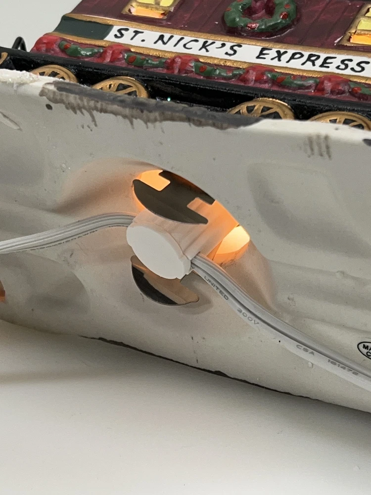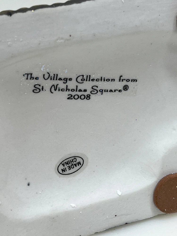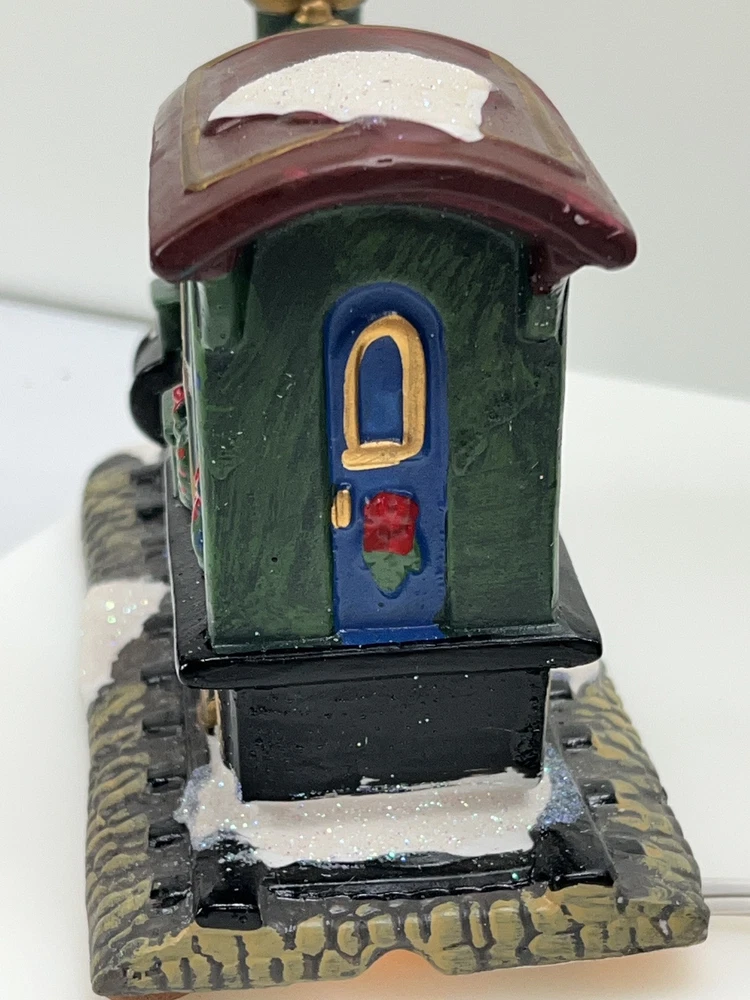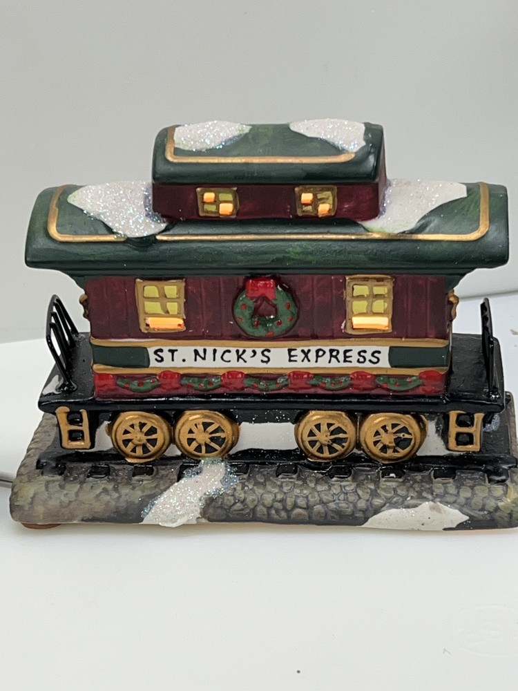 Saint Nicholas Square 3 Piece "Train Set" is a medium-sized, hand-painted ceramic and porcelain Christmas village display item from 2008. This whimsical train set features an asymmetrical design with a multicolor finish and measures 18" in length, 5" in height, and 3" in width. It is illuminated with a cord and comes boxed as part of the St. Nicholas Square Village Collection, suitable for any room decor during the holiday season. Absolutely perfect pristine condition! Comes with all clean original packaging including cord & lights