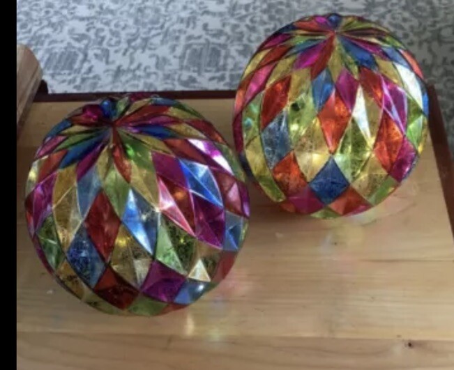 Box opened for condition, inspection, testing and photos. Other items in photo not included. Add some holiday cheer to your home with this stunning S/2 8" Illuminated Harlequin Spheres figurine by Valerie Parr Hill QVC. The multicolor glass figurine is perfect for Christmas or seasonal decorations and features a beautiful and intricate design that will delight all your guests. Celebrate the holiday season in style with this sold-out on QVC figurine that is sure to become a treasured addition to your collection. The figurine is crafted with the highest quality materials and is designed to bring joy and joyous memories to your home. Don't miss out on this amazing opportunity to add a touch of elegance and festive cheer to your living space.