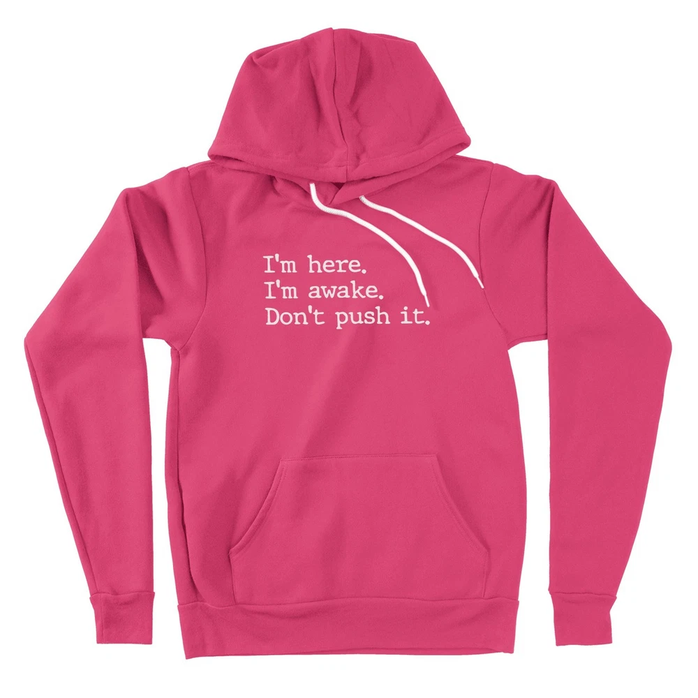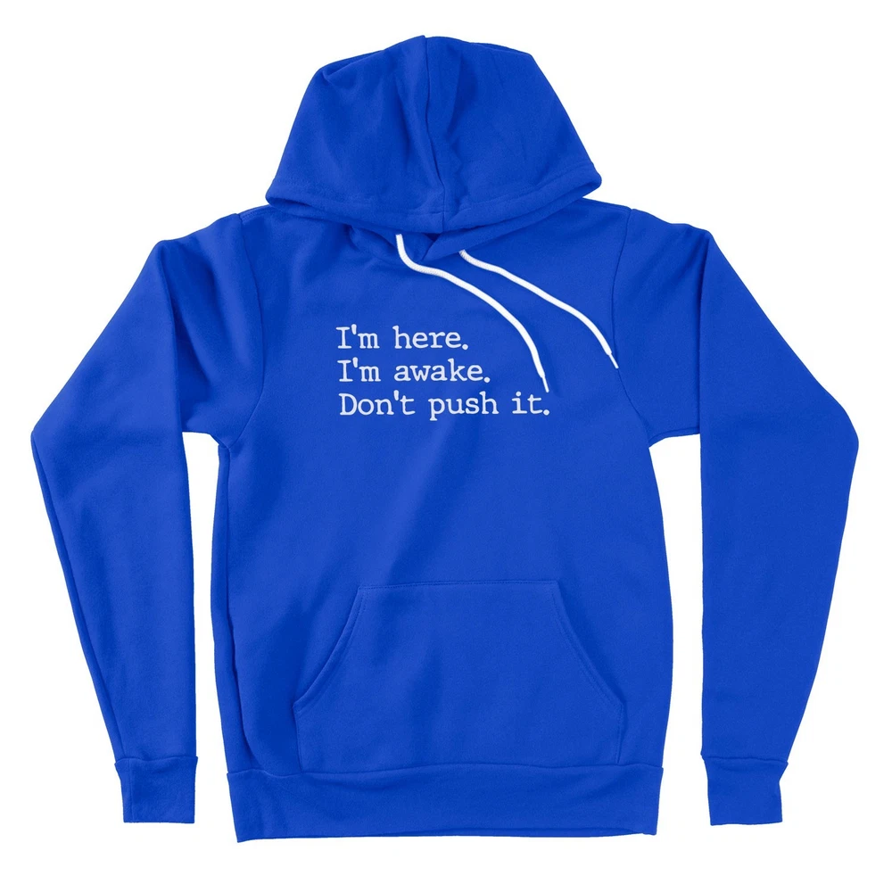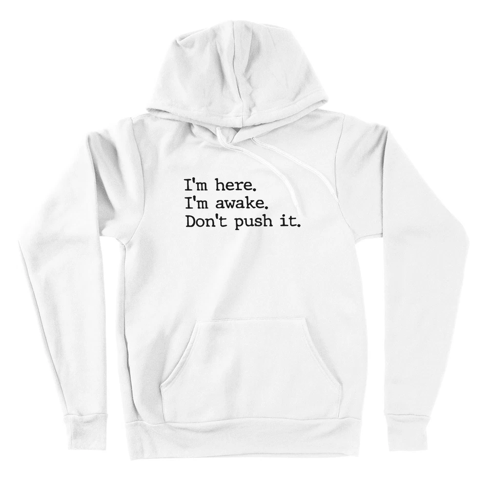 The "I'm Here I'm Awake Don't Push It Hoodie Sweater" is a fun and sarcastic gamer sweatshirt perfect for casual wear or special occasions like birthdays, Thanksgiving, or Christmas. Made of a comfortable blend of polyester and cotton, this hoodie features a solid pattern with a hooded closure and long sleeves. The hoodie also has accents like hooded design and pockets, making it both stylish and practical for the fall, winter, and spring seasons. Easy to care for with machine washable fabric, this hoodie is a great gift for friends who love a bit of humor and sarcasm in their wardrobe.