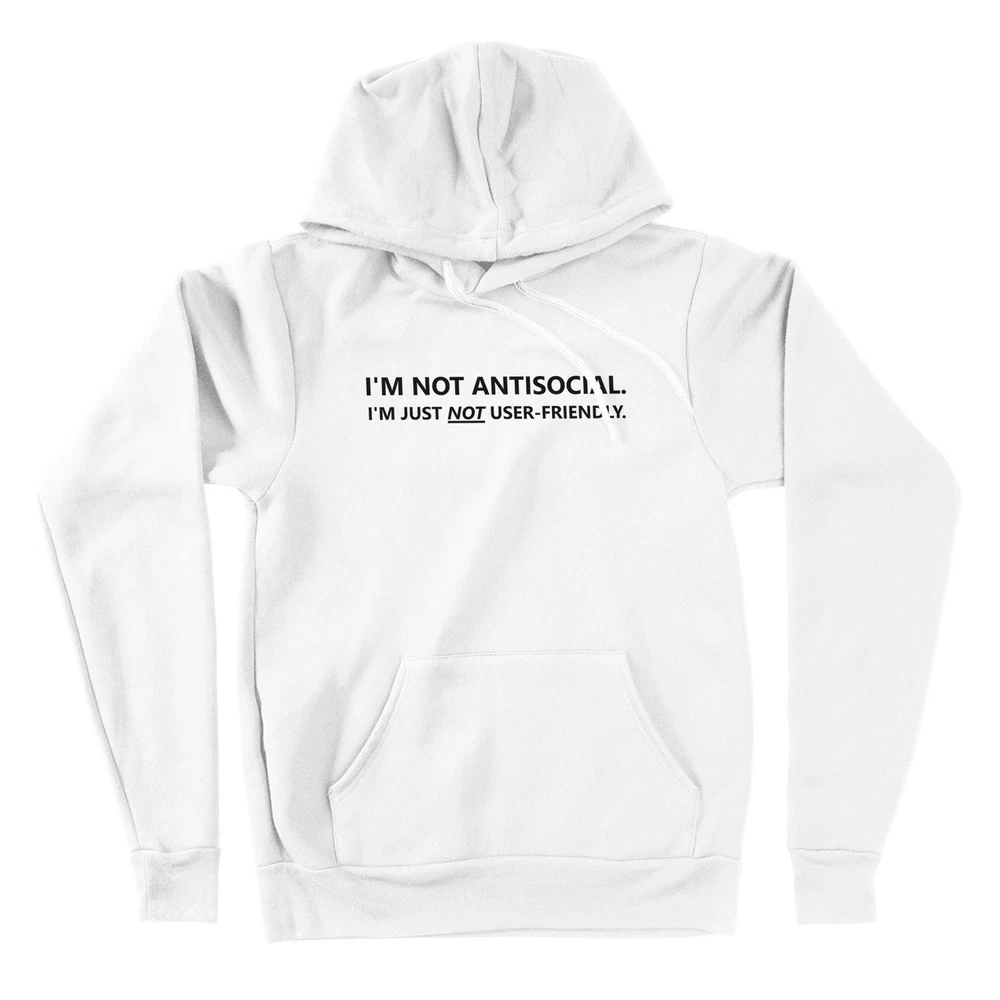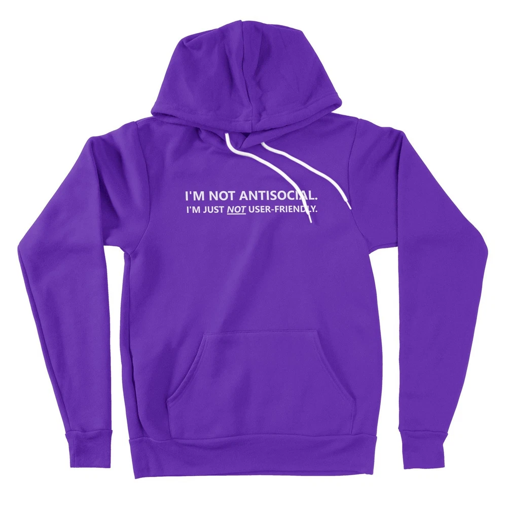 This "I'm Not Antisocial Im Just Not User-Friendly" Hoodie Sweater is a perfect blend of humor and sarcasm, making it a great gift for friends who may be introverted or anti-social. The long sleeve, hooded design is ideal for casual occasions like birthdays, Thanksgiving, or Christmas. Made from a comfortable blend of polyester and cotton, this hoodie features a solid pattern with a graphic print that captures the fun and quirky personality of the wearer. With its regular fit and fleece fabric, this hoodie is perfect for the winter, fall, and spring seasons. Add a touch of geeky humor and love to your wardrobe with this unique and funny hoodie.