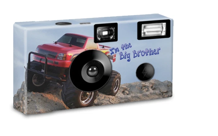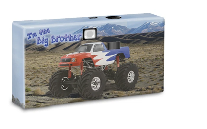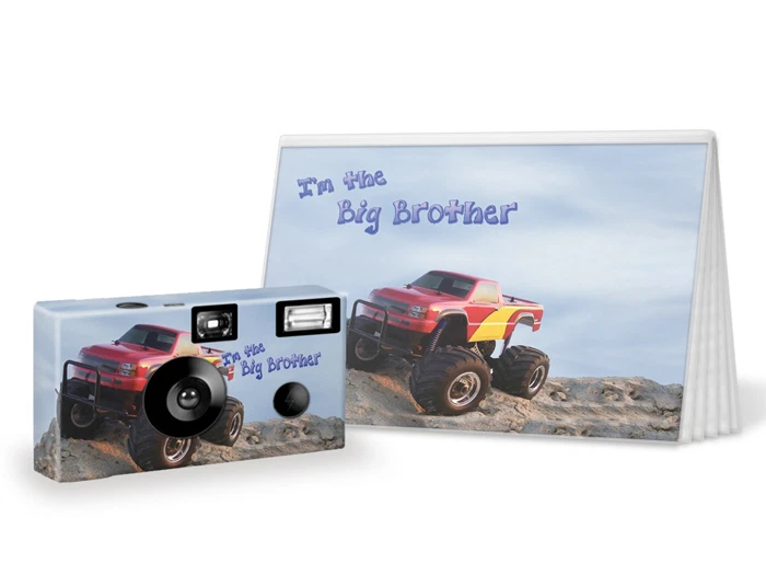PERSONALIZATION: Can be personalized with child's name. When placing order, please give us the child's name. PLEASE SEND US THIS INFORMATION WITH YOUR ORDER BECAUSE WE CAN'T SHIP WITHOUT IT: *****Please note child's first name only ***** Select "Yes" for Personalized. Click "Buy It Now" or "Add To Cart" In "Review Item" box you will find the "Message to Seller" link on right side. * * * * * * * * * * * * * * * * * * * * * * * * * * * * * I'm The Big Brother Camera and Photo Album Set -- Monster Truck. What a special thing, to be the Big Brother! Give him a single-use camera so that he can take his own pictures of the baby and the family. Then he can put the developed pictures into his special photo album. This can be his own special Brag Book to show family and friends. The set contains: A single-use camera loaded with 27 exposure KODAK 400 speed color film, with battery. Ready to use. The photo album holds 24 4x6 photos, one per album page. Clear acid-free pockets with white mesh background. *****Parents, you may wish to teach a small child how to use a single use camera, especially initiating the flas h for indoor shots.***** You have a big Sister? Please see our listings for I'm The Big Sister Camera and Photo Album Set. For "emergency" orders, please contact us so that we may better serve you. This is a unique item created and manufactured in the USA by CustomCameraCollection, and sold o n our eBay shop Custcams. Personalized items are not returnable or refundable. Big Brother Gift, Kid Camera. - - - - - - - - - - - - - - - - - - - - - - - - - - - - - - - - - - - - - - - - - - - - - - - - - - - - - - - - - COPYRIGHT NOTICE Please note that by purchasing this item you are paying for the creative services and design, production, materials, and personalizing your item specifically for you, which is permitted for one-time personal use. All copyrights and trademarks of the character images used belong to their respective owners and are not being sold and we do not sell or claim ownership over the characters or graphics. Items purchased are for one-time personal use only and are not to be re-sold for any reason. Where copyright restrictions apply on the characters that are used to create these products, CustCams is not liable for any misuse of copyrighted materials by its customer or any copyright infringement claims.