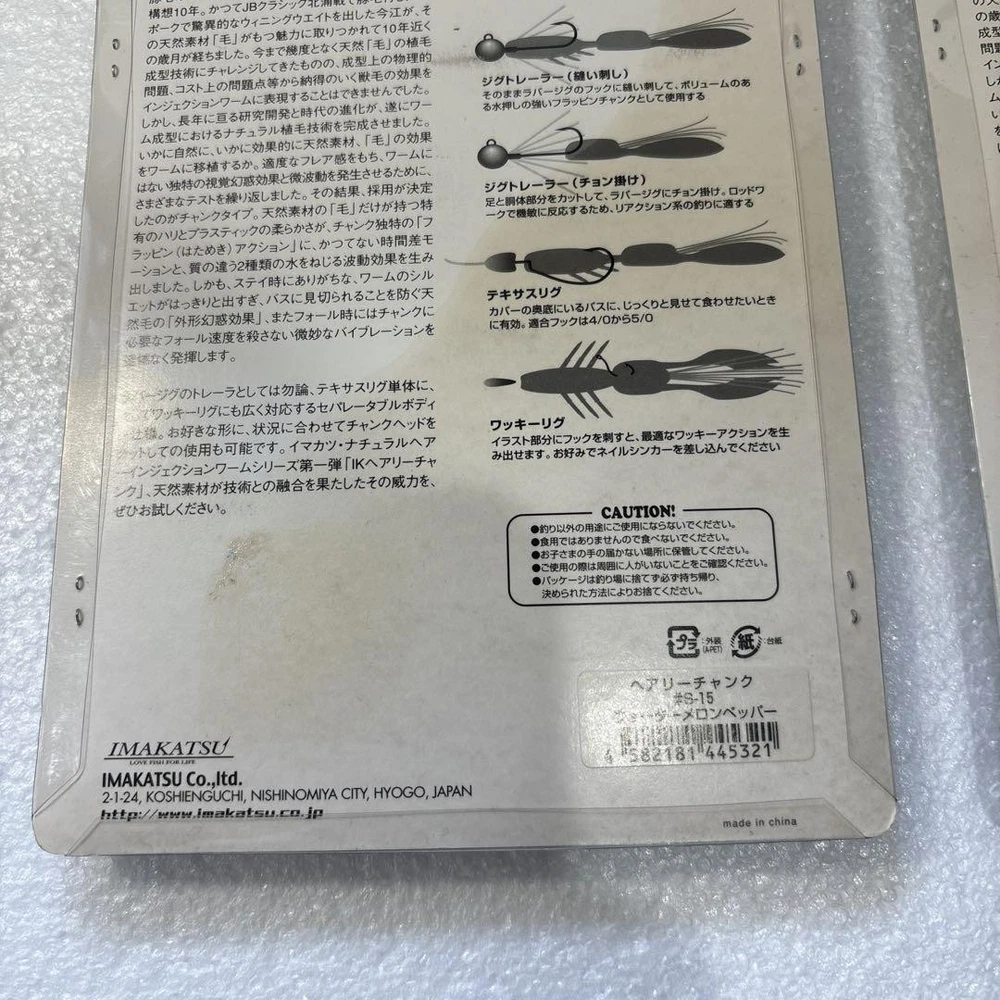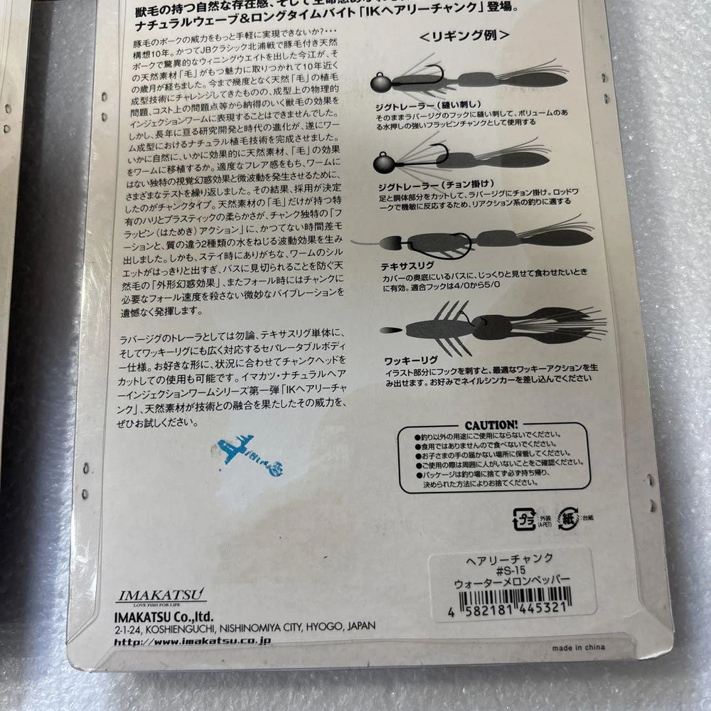 Imakatsu Ik Hairy Chunk Watermelon Pepper Lure Set of 2 Fishing Tackle Key Features **Imakatsu Fishing Lure** - **Brand Name:** Imakatsu - **Product Type:** Fishing Lure Enhance your fishing experience with the Imakatsu Fishing Lure, designed for both amateur and professional anglers. This high-quality lure is crafted to attract a variety of fish, ensuring a successful catch every time. - **Features:** - **Color:** Vibrant and eye-catching - **Material:** Durable construction for long-lasting use - **Size:** Perfectly designed for optimal performance in the water Whether you're fishing in freshwater or saltwater, the Imakatsu Fishing Lure is a must-have addition to your tackle box. Get ready for your next fishing adventure! Specifications Brand Imakatsu / Imae Katsutaka Country Japan Product Description Item Title Imakatsu Ik Hairy Chunk Watermelon Pepper Set Of 2 Payment Supports managed payments Please pay within 5 days after auction is finished. About Us We are located in Japan. It's our pleasure to make you happy by proposing our recommend item. If you have any questions or request about items, please feel free to ask us. International Buyers - Please Note: -Import duties, taxes, and charges are not included in the item price or shipping charges. These charges are the buyer's responsibility. -Please check with your country's customs office to determine what these additional costs will be prior to bidding/buying. -These charges are normally collected by the delivering freight (shipping) company or when you pick the item up - do not confuse them for additional shipping charges. -We do not mark merchandise values below value or mark items as - gifts - The US and International government regulations prohibit such behavior. Thank you for your understanding.