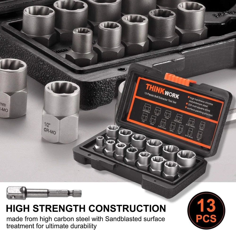 Impact Bolt Extractor Set Nut Remover Set Stripped Extraction Socket Tools 13Pcs Item Description 🧿Brand Does not apply 🧿Material Chrome Molybdenum Steel 🧿Drive System Hex 🧿Item Dimensions LxWxH 6.7 x 3.9 x 1.6 inches 🧿Finish Type Black Phosphate, Black oxide finish, Chrome, Painted, Steel 🧿Size 3/8 Inch 🧿Type Does not apply 🧿UPC 313103310380 Each bolt extractor is made of high hardness chrome-molybdenum steel for superior durability and longer life. It will easily extract damaged bolts, nuts, and screws even if they are stripped, rusted, or frozen. The internal thread with reverse spiral flutes design to bite down to provide maximum gripping power, the more you turn, the tighter the socket grips. Standard 3/8-inch drive and hex adapter to let the extractors compatible with common to heavy-duty power tools, drivers and screwdrivers handle tools. 13+1 pieces 3/8 inch drive bolt remover set includes 3/4"(19mm), 11/16", 17mm, 5/8"(16mm), 9/16"(14mm), 13mm, 1/2", 12mm, 7/16"(11mm), 10mm, 3/8", 5/16"(8mm), 1/4", and hex adapter. Heavy-duty blow-molded case for organized storage and easy carry. Impact Bolt Extractor Set Nut Remover Set Stripped Extraction Socket Tools 13Pcs Are you tired of the bolts, nuts, and screws being damaged even if stripped, rusted, or frozen? What will you do? Break it loose with a breaker bar and then fit the new socket with a hammer or a mallet. But this will damage your socket. Thankfully, THINKWORK impact bolt extractor set is around you to help you to continue to work on your project with ease. Includes 13 pieces of the most used SAE and metric sizes impact bolt extractors 3/4"(19mm), 11/16", 17mm, 5/8"(16mm), 9/16"(14mm), 13mm, 1/2", 12mm, 7/16"(11mm), 10mm, 3/8", 5/16"(8mm), 1/4". All the extractors can be used by hand tools or any 3/8-inch air and power tools. The internal thread with reverse spiral flutes is designed to bite down to provide maximum gripping power. The more you turn, the tighter the socket grips. 1/4" Hex adapter let the extractors compatible with common to heavy-duty power tools, drivers and screwdrivers handle tools. All the extractors are well packed in a heavy-duty blow-molded case for secure storage and easy carry. Product Description Material Cr-V Cr-M Cr-M Cr-M Cr-V Cr-V Drive Size 1/2" , 1/4", 3/8" 1/2" 3/8" 3/8" 3/8" 1/2" Style / 6 Point Shallow 6 Point Shallow 6 Point Shallow 6 Point Shallow 6 & 12 Point Shallow Standard 3/8 Inch Square Drive Superior Gripping Power 1/4" Hex Shank Socket Adapter Organized Storage Product Description Material Cr-V Cr-M Cr-M Cr-M Cr-V Cr-V Drive Size 1/2" , 1/4", 3/8" 1/2" 3/8" 3/8" 3/8" 1/2" Style / 6 Point Shallow 6 Point Shallow 6 Point Shallow 6 Point Shallow 6 & 12 Point Shallow Standard 3/8 Inch Square Drive Superior Gripping Power 1/4" Hex Shank Socket Adapter Organized Storage Product Description Material Cr-V Cr-M Cr-M Cr-M Cr-V Cr-V Drive Size 1/2" , 1/4", 3/8" 1/2" 3/8" 3/8" 3/8" 1/2" Style / 6 Point Shallow 6 Point Shallow 6 Point Shallow 6 Point Shallow 6 & 12 Point Shallow Standard 3/8 Inch Square Drive Superior Gripping Power 1/4" Hex Shank Socket Adapter Organized Storage Material Cr-V Cr-M Cr-M Cr-M Cr-V Cr-V Drive Size 1/2" , 1/4", 3/8" 1/2" 3/8" 3/8" 3/8" 1/2" Style / 6 Point Shallow 6 Point Shallow 6 Point Shallow 6 Point Shallow 6 & 12 Point Shallow Standard 3/8 Inch Square Drive Superior Gripping Power 1/4" Hex Shank Socket Adapter Organized Storage Material Cr-V Cr-M Cr-M Cr-M Cr-V Cr-V Drive Size 1/2" , 1/4", 3/8" 1/2" 3/8" 3/8" 3/8" 1/2" Style / 6 Point Shallow 6 Point Shallow 6 Point Shallow 6 Point Shallow 6 & 12 Point Shallow Material Cr-V Cr-M Cr-M Cr-M Cr-V Cr-V Drive Size 1/2" , 1/4", 3/8" 1/2" 3/8" 3/8" 3/8" 1/2" Style / 6 Point Shallow 6 Point Shallow 6 Point Shallow 6 Point Shallow 6 & 12 Point Shallow Material Cr-V Cr-M Cr-M Cr-M Cr-V Cr-V Drive Size 1/2" , 1/4", 3/8" 1/2" 3/8" 3/8" 3/8" 1/2" Style / 6 Point Shallow 6 Point Shallow 6 Point Shallow 6 Point Shallow 6 & 12 Point Shallow Material Cr-V Cr-M Cr-M Cr-M Cr-V Cr-V Drive Size 1/2" , 1/4", 3/8" 1/2" 3/8" 3/8" 3/8" 1/2" Style / 6 Point Shallow 6 Point Shallow 6 Point Shallow 6 Point Shallow 6 & 12 Point Shallow Standard 3/8 Inch Square Drive Superior Gripping Power 1/4" Hex Shank Socket Adapter Organized Storage Standard 3/8 Inch Square Drive Superior Gripping Power 1/4" Hex Shank Socket Adapter Organized Storage Standard 3/8 Inch Square Drive Superior Gripping Power 1/4" Hex Shank Socket Adapter Organized Storage Standard 3/8 Inch Square Drive Superior Gripping Power 1/4" Hex Shank Socket Adapter Organized Storage Standard 3/8 Inch Square Drive Superior Gripping Power 1/4" Hex Shank Socket Adapter Organized Storage Standard 3/8 Inch Square Drive Superior Gripping Power 1/4" Hex Shank Socket Adapter Organized Storage Standard 3/8 Inch Square Drive Superior Gripping Power 1/4" Hex Shank Socket Adapter Organized Storage PAYMENT SHIPPING RETURN We accept the following payment methods: Credit and Debit Cards Please make your payment within 48 hours of purchase to ensure prompt processing and shipment. Orders ship within 4 to 5 business days after payment. We offer FREE FAST SHIPPING! We offer a 30-day return policy for all items. If you are not completely satisfied with your purchase, you may return the item within 30 days of receiving it for a full refund or exchange. The buyer is responsible for return shipping costs.