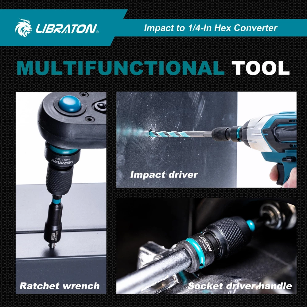 [QUICK-CHANGE DESIGN] 1/4" drill adapter equipped with a quick-release chuck, allows for easy one-handed swapping between bits while working, and holds the bit nicely. Make you work more efficiently. [SQUARE-TO-HEX BIT ADAPTER] The impact socket adapter can transform the wrench into a drill or ratchet into a driver. The square driver side and the 1/4" female hex side can provide socket-to-bit conversions. [PREMIUM QUALITY] This quick-change hex bit holder adapter set is made of high-quality heat treatment chrome molybdenum (Cr-Mo) steel with a protective phosphate finish for strength and durability and lasts longer. [MULTIFUNCTIONAL TOOL] The standard 1/4-inch hex adapters fit all 1/4" hex-shank screwdriver bits. The female socket converter kit includes three socket adapters with square driver sizes of 1/2-inch, 3/8-inch, and 1/4-inch, with ball stop groove for impact use. [GOOD SERVICES] Please feel free to contact us if there are any problems with this Drill Socket Adapter Set, we will provide you excellent customer service and 100% satisfaction warranty.