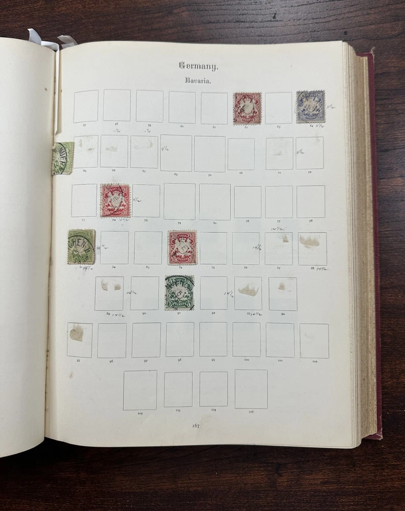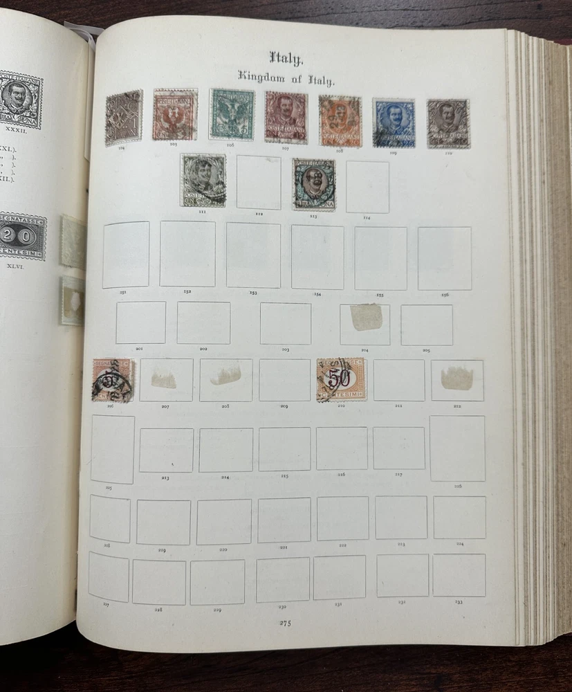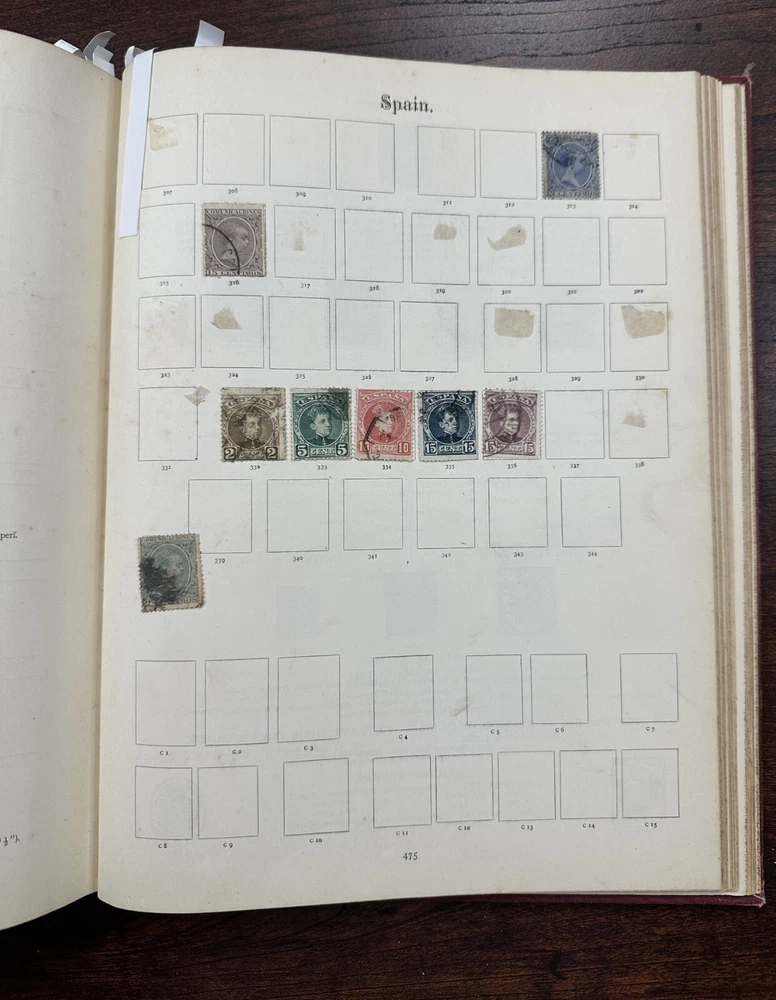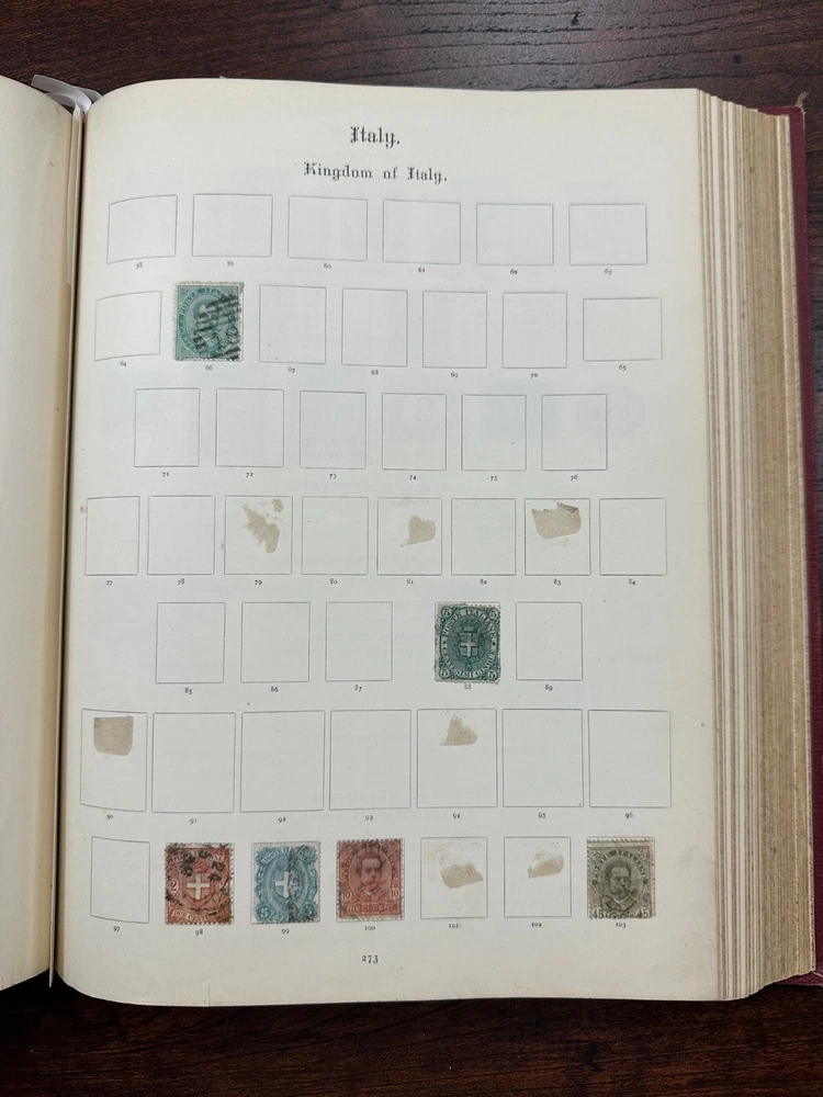 A Stanley Gibbons Imperial Postage Stamp Album (Europe and Possessions) in good condition. There are 100 or so stamps hinged and loose in the album. Most appear to be in good to fine condition. They have not been checked. There are more stamps than what is pictured, but most of the album is empty. Estimated CV of stamps is over $750.00. R