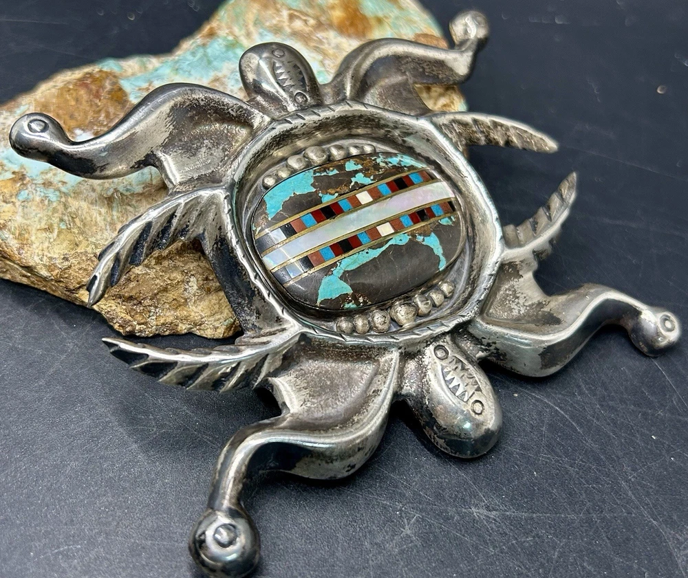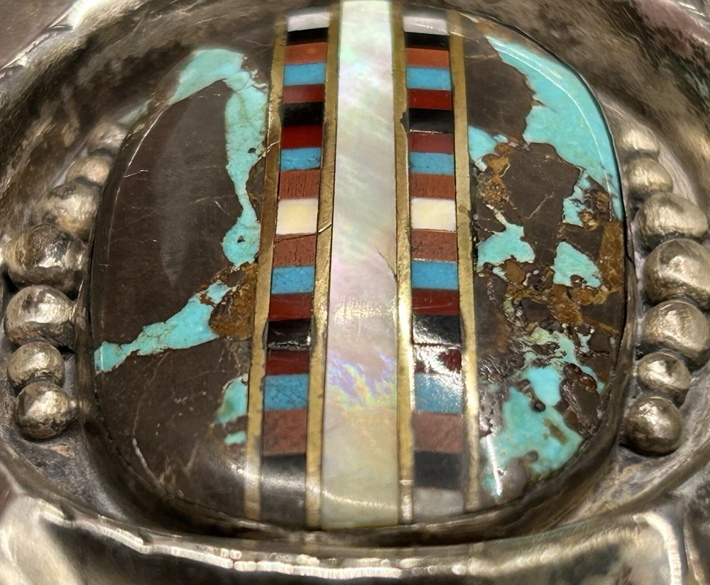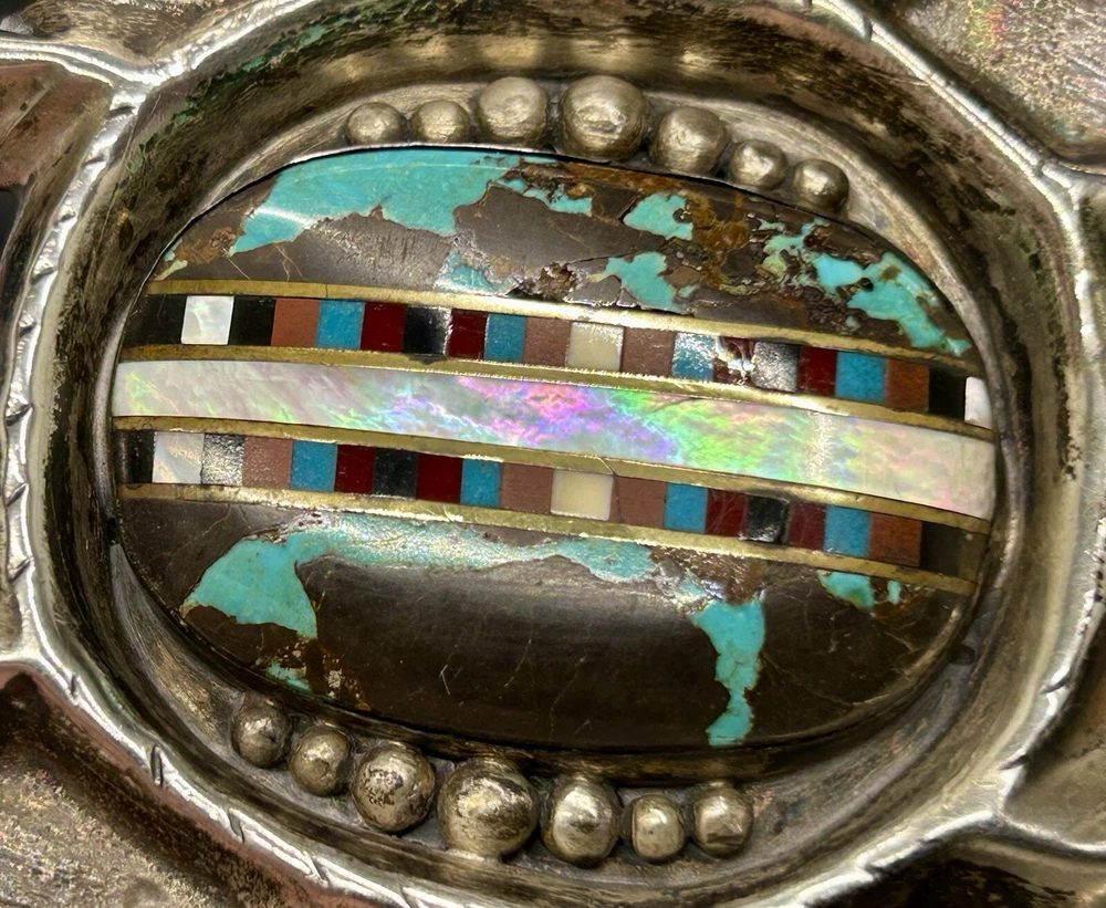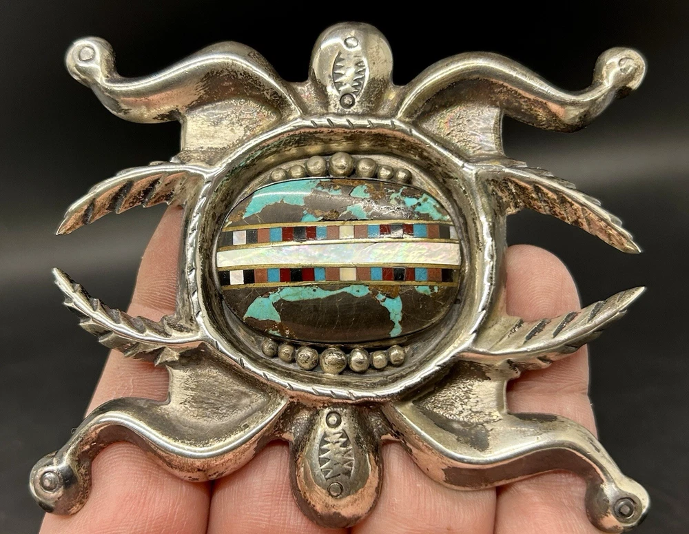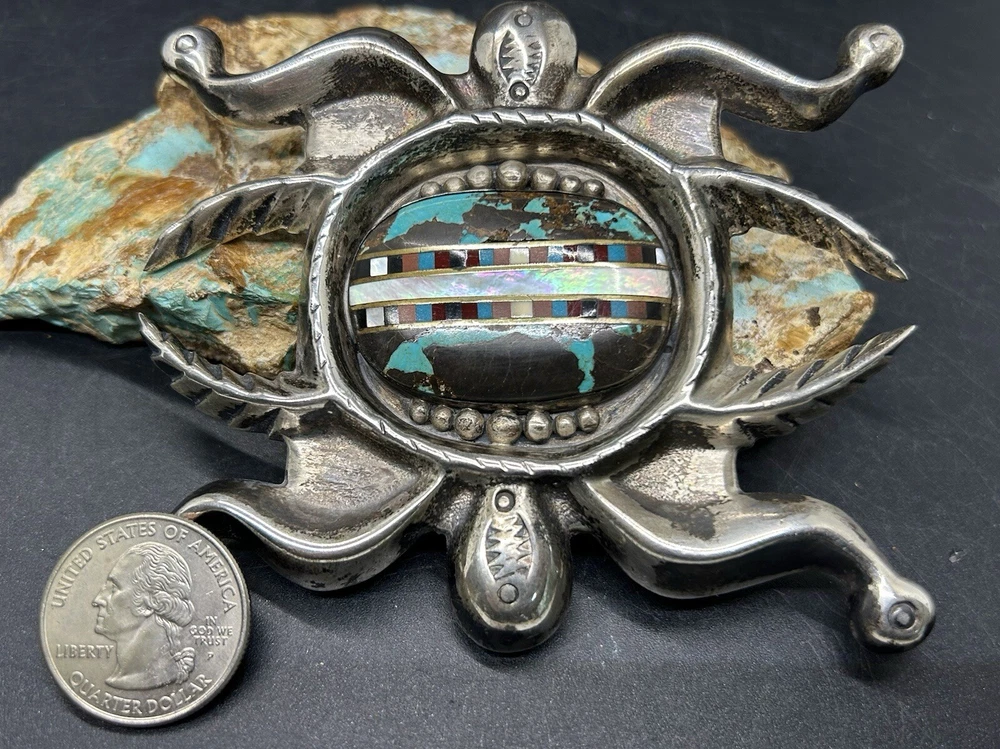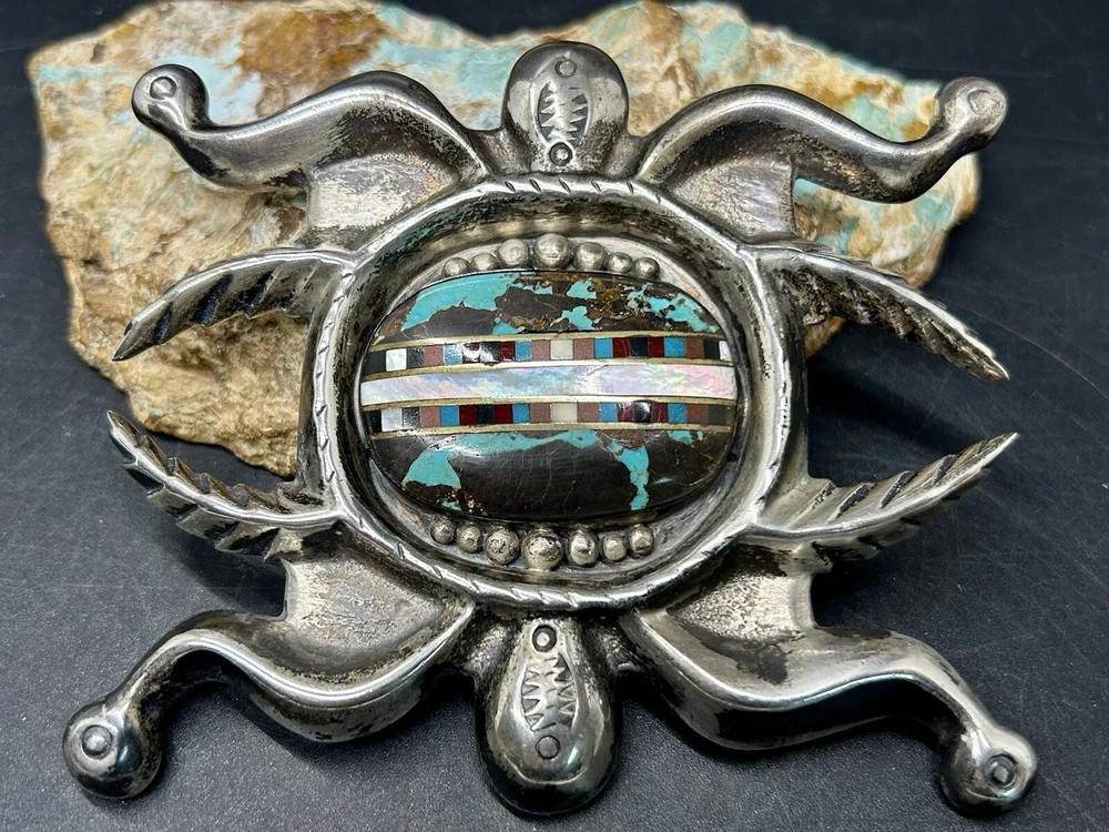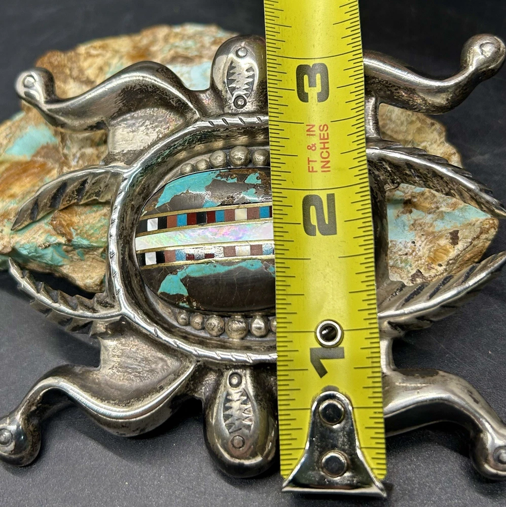 You are looking at an impressive LARGE & Heavy vintage Navajo “Three Hogans Shop” handmade & signed super thick cast sterling silver belt buckle set with gorgeous turquoise and mosaic multi gemstone inlay. Notice the wonderful bold design on this rare statement piece and also the spectacular micro inlay between the turquoise. This buckle was Handmade and signed on the back with the 3 Hogans trading shop hallmark. Their jewelry is well known, highly collectible & rare to find. I added some pictures for you to see including measurements. Again, this is a very big & heavy buckle. It weighs a hefty 194+ grams. Such an impressive rare find. This buckle will make a great addition to any Native American or southwestern jewelry collection. You won’t find another like it. Take advantage of this opportunity to own a rare Native jewelry piece. Thanks for looking and please make sure to check out my other listings.