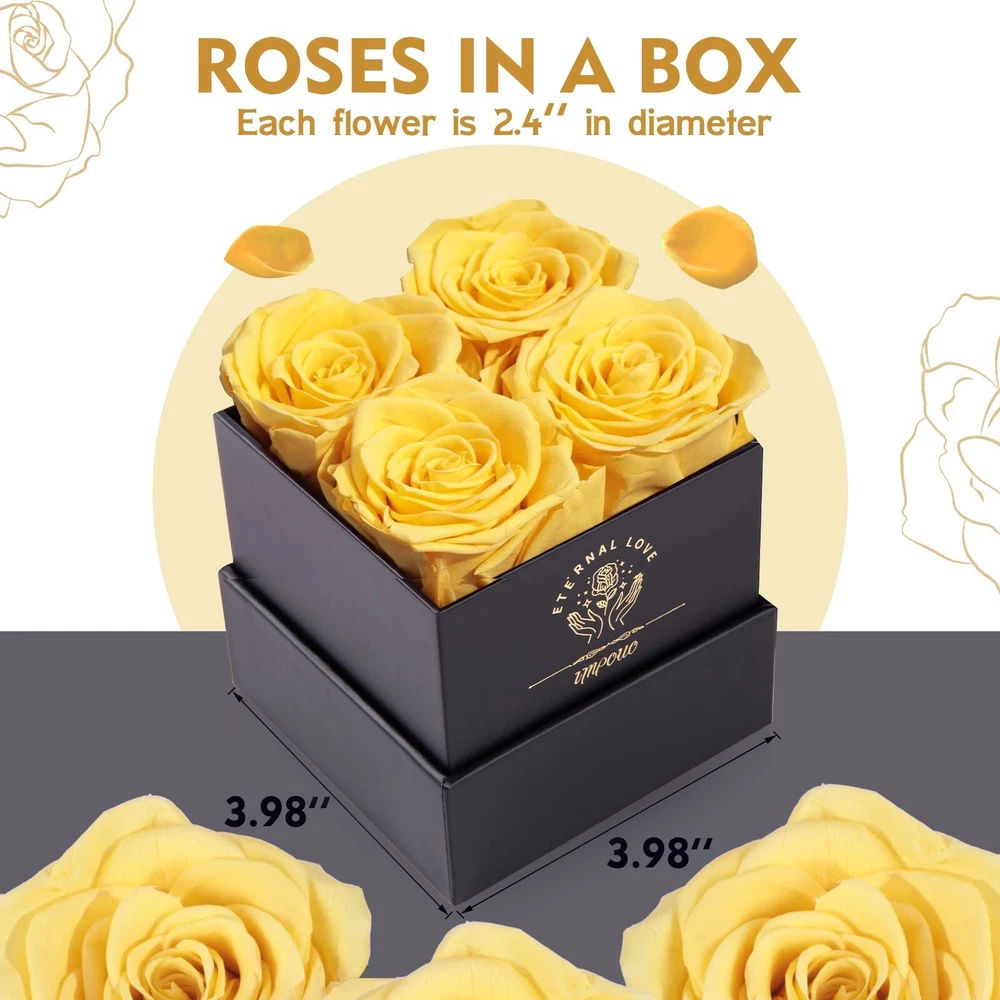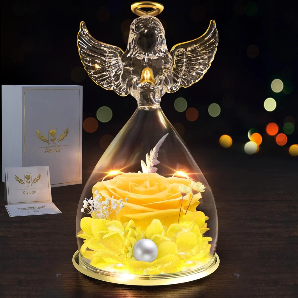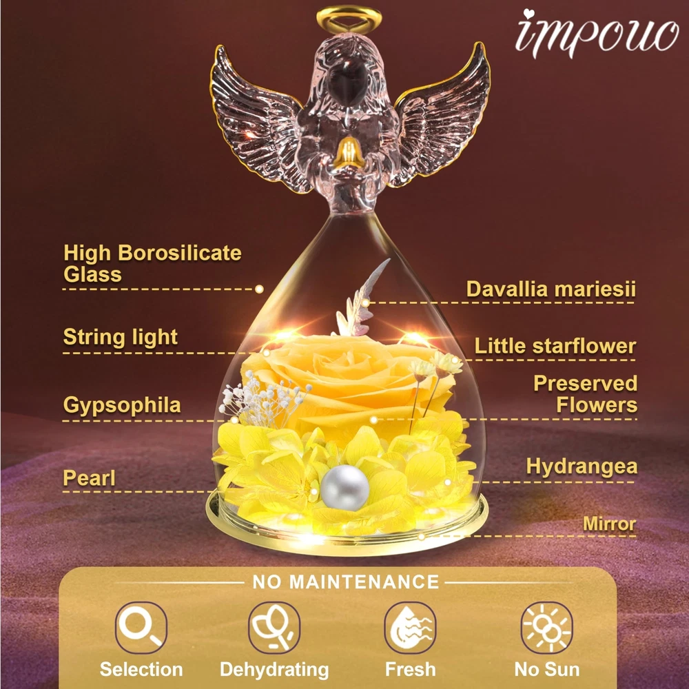 Impouo's roses flower With Gift Box Package yellow and Angel Gifts yellow Product Details Brand: Impouo Occasion: Wedding, Anniversary, Birthday, Mother s Special Feature: No Maintanace, Fresh Flowers, Perfect Gift Style: Impouo's box flower yellow and Angel Gifts yellow Gift Box SetImpouo's roses flower With Gift Box Package measures 36 x 3 x 5 inches. There are 4 forever flower roses in a box, each size 4-5cm. Glass Angel size 3 x 3 x 5.12 inches. Exquisite Gift, Reflected in The Details An exquisite gift, the forever roses, must be reflected in the details. Impouo's roses not only have the appearance of a heart-shaped black gift box but also have transparent acrylic surrounding the roses to protect the roses from damage, and even come with a greeting card. So that while receiving exquisite roses, you can also receive sincere blessings. Preserved Roses Can Be Preserved for Many Yearspreserved roses are carefully selected and made by hand, which largely retains the texture, color, and shape of fresh flowers. No maintenance, no sunlight, and water can be kept for 2-3 years. Delicate and beautiful roses are something every woman deserves. Multiple Colors to Meet Different NeedsOur roses come in different colors ,different colors of roses have different meanings and blessings.You can choose by yourself. Popular GiftMultiple colors, purely handmade flowers come with a rose box, which is the best-preserved flower, forever flower, and a suitable birthday gift for women. It can also be used as a Valentine's Day gift, anniversary gift, and Mother's Day gift for your favorite and close people. And we will provide high-quality after-sales service, you can always trust our professional after-sales team. Impouo's roses flower With Gift Box Package yellow and Angel Gifts yellow