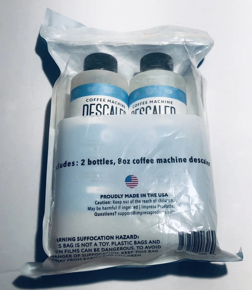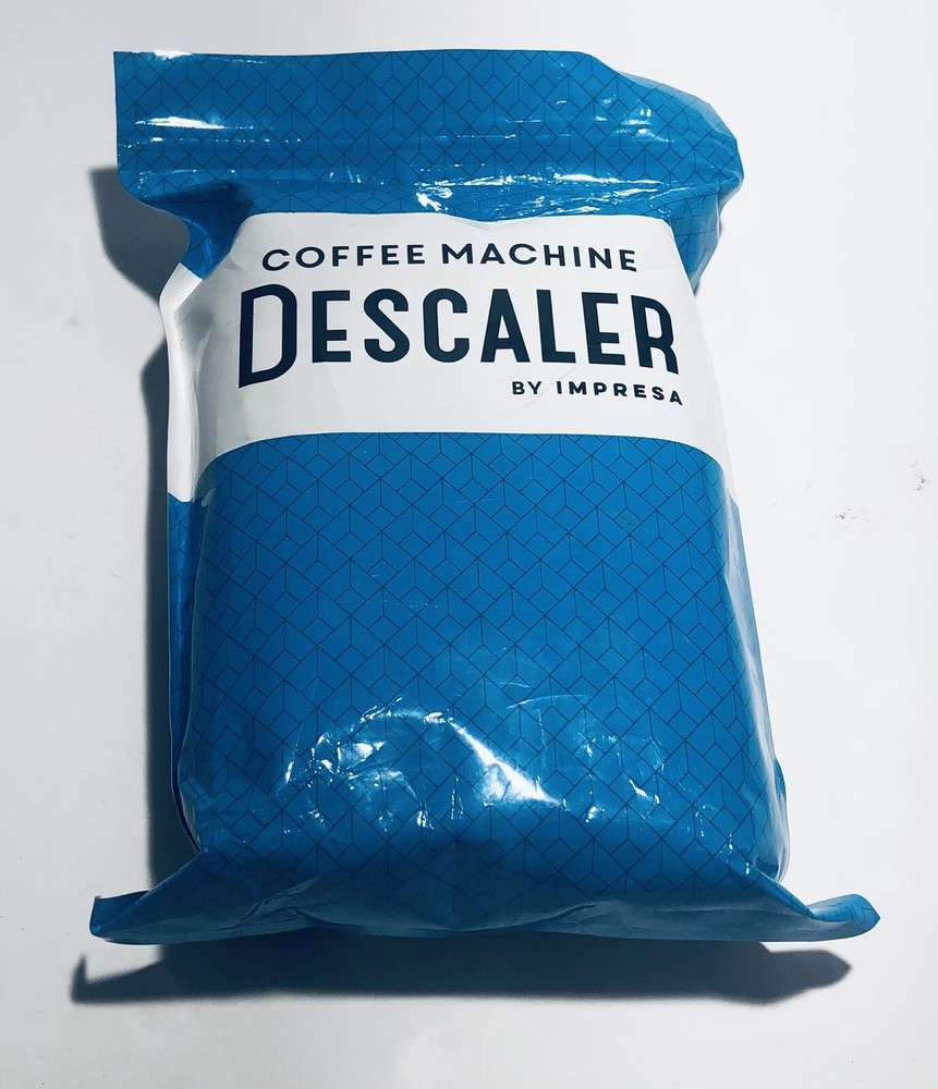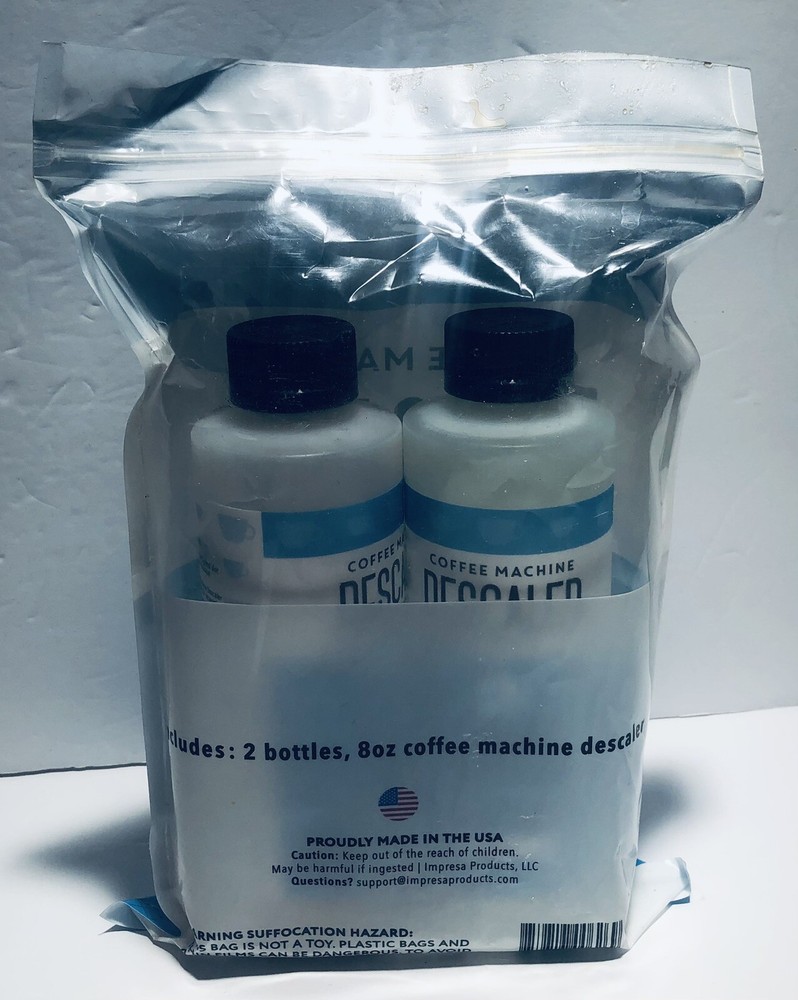 Coffee Machine Descaler by Impressa Pack of Two 8oz Bottles 2 Uses Per Bottle. Condition is Brand New Sealed. Comes with everything you see in the pictures only. Please view pictures to evaluate for yourself. Shipped via USPS Ground Advantage.